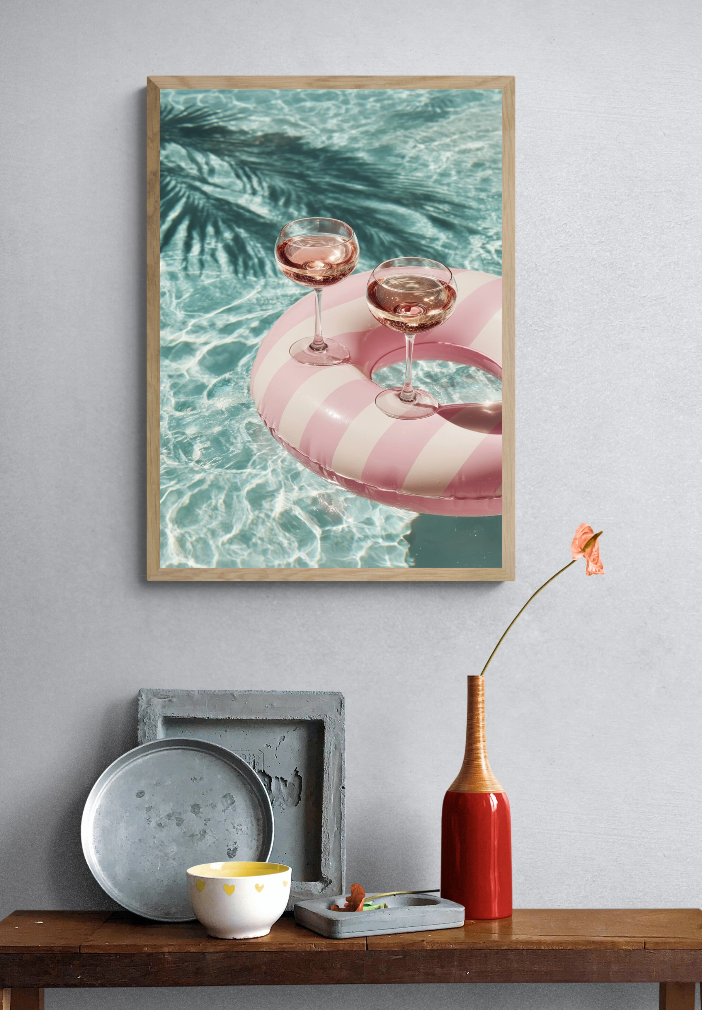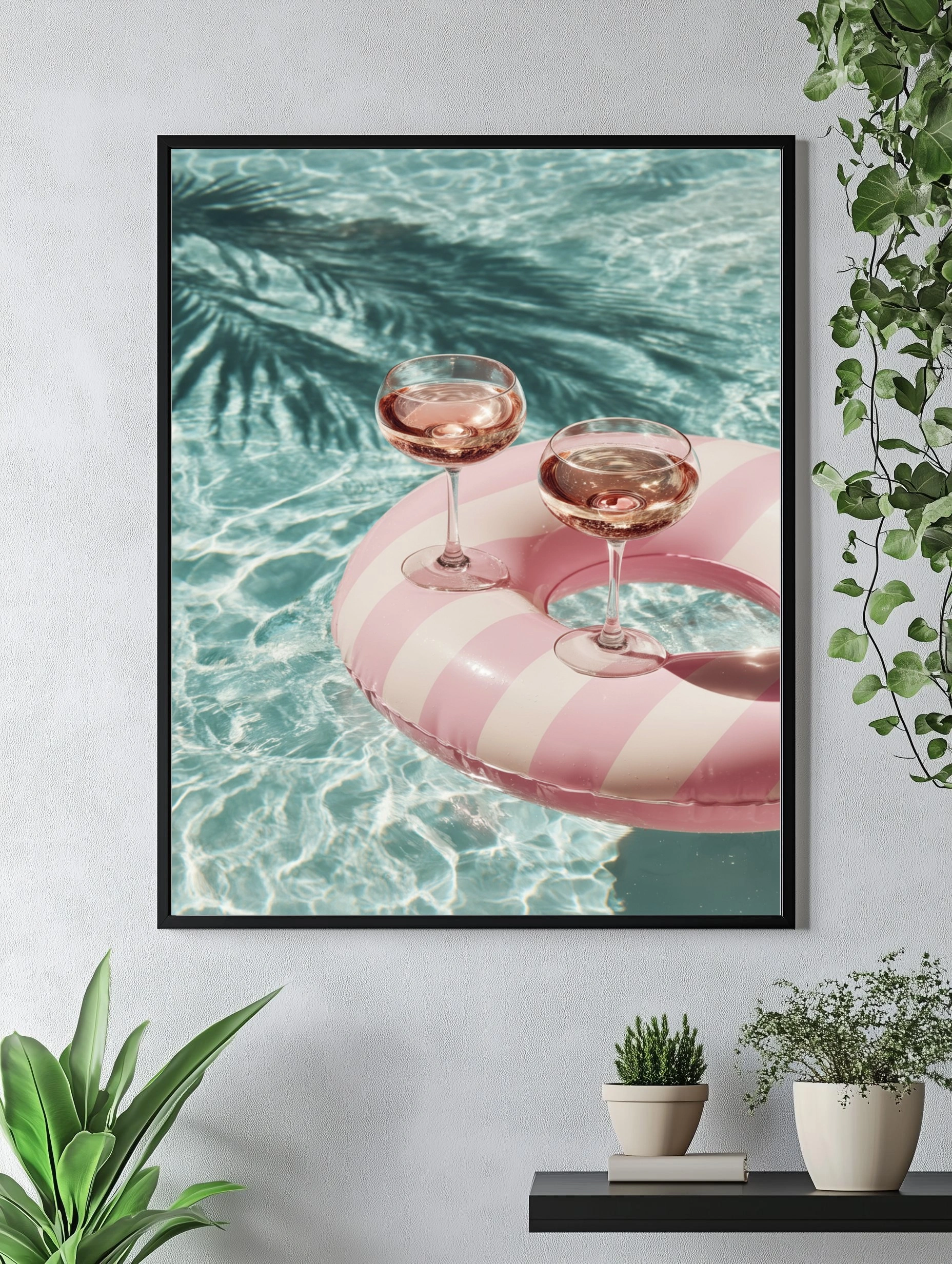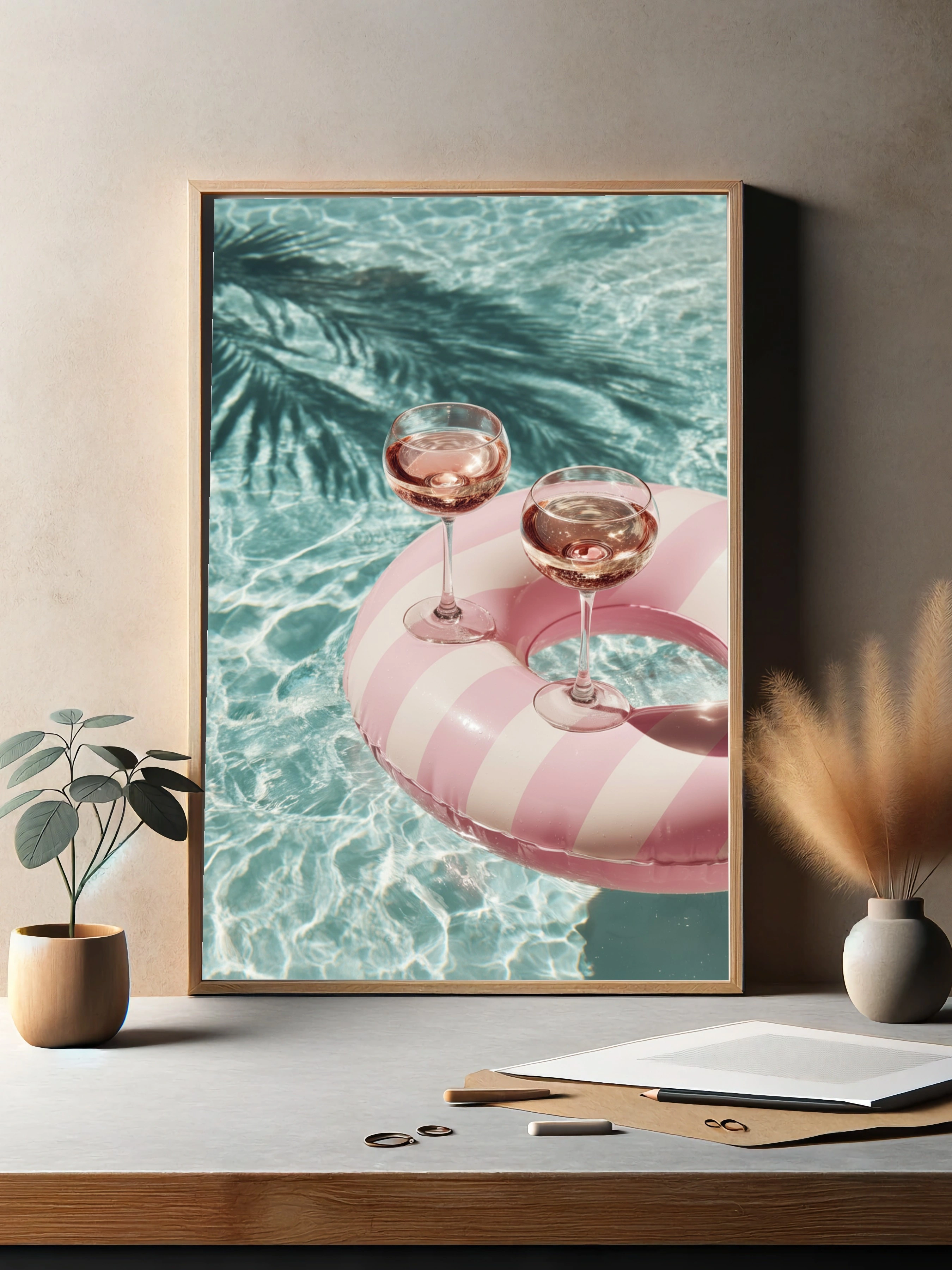 Погрузитесь в атмосферу летнего отдыха с этим ярким постером, на котором изображены два изысканных бокала с розовым напитком, расположенные на стильном пляжном круге с розовыми и белыми полосами. Вода в бассейне сверкает на солнце, создавая волшебные отражения, а тени пальм добавляют экзотики и уюта. Этот постер станет идеальным акцентом для вашего интерьера, напоминая о теплых днях и беззаботных моментах. Яркие цвета и легкость композиции создают позитивное настроение, которое украсит любую комнату — от гостиной до кухни. Подходит для молодежи и любителей летнего отдыха.