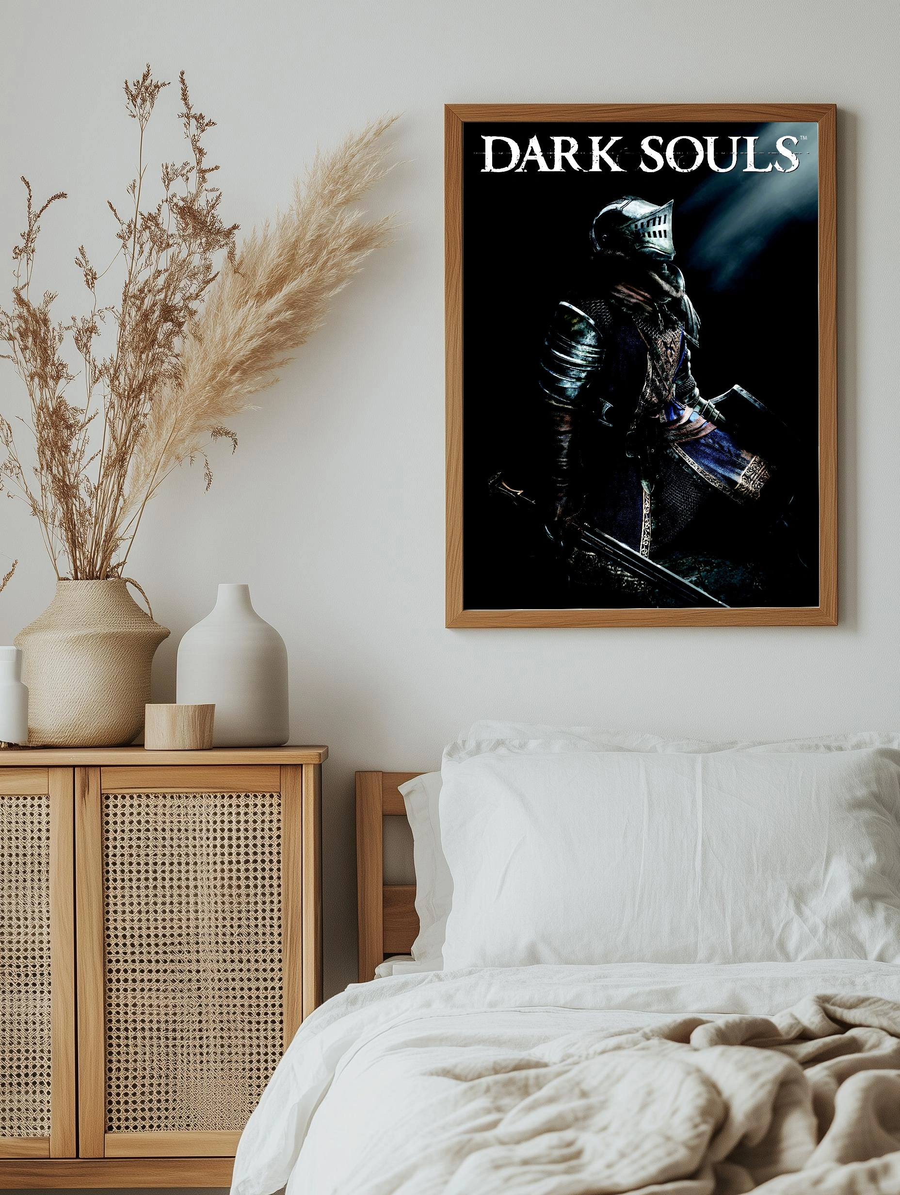 Это интерьерный постер, посвящённый культовой игре Dark Souls. Изображён средневековый рыцарь в металлических доспехах с мечом, окружённый мистической тьмой и световыми эффектами. Дизайн передаёт атмосферу мрачного фэнтези и эпической борьбы. Идеально для современного искусства, декора гостиной или офиса.