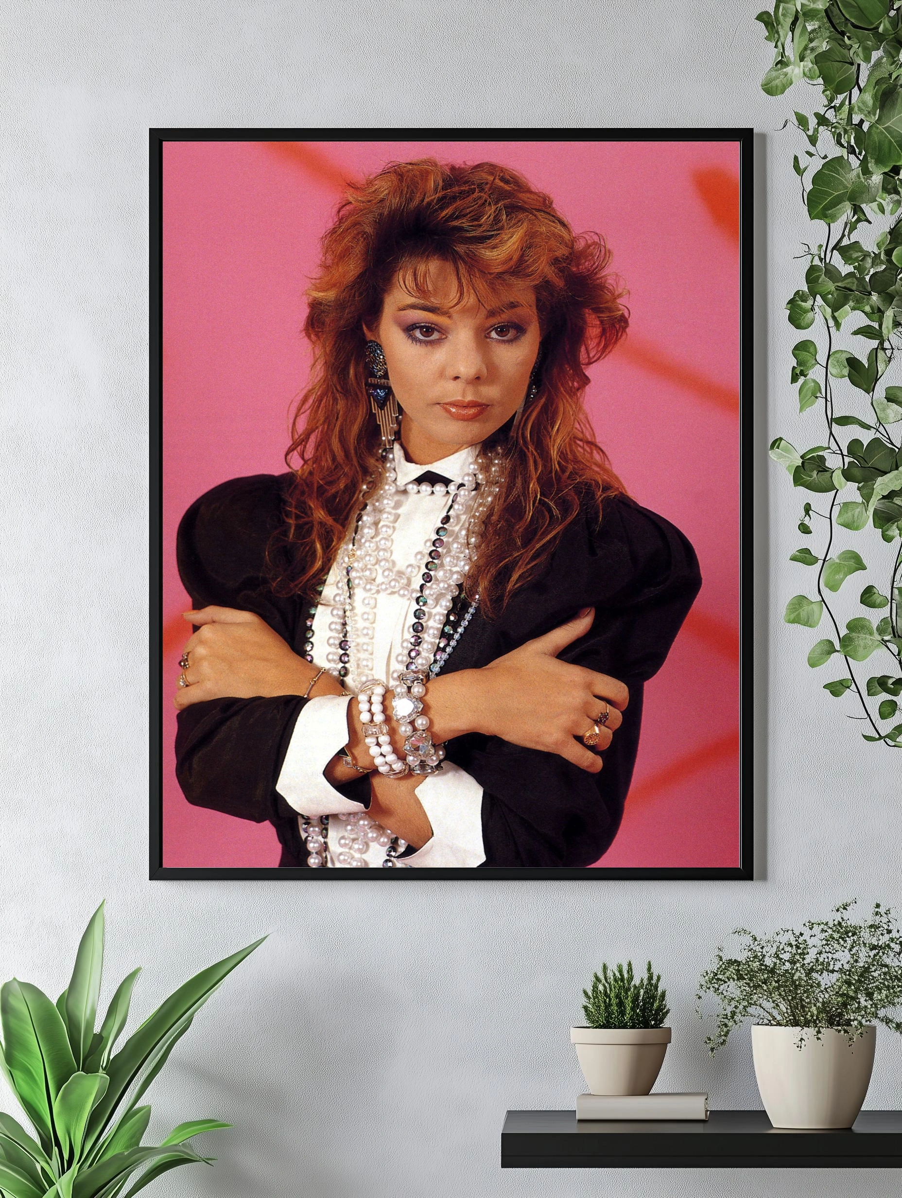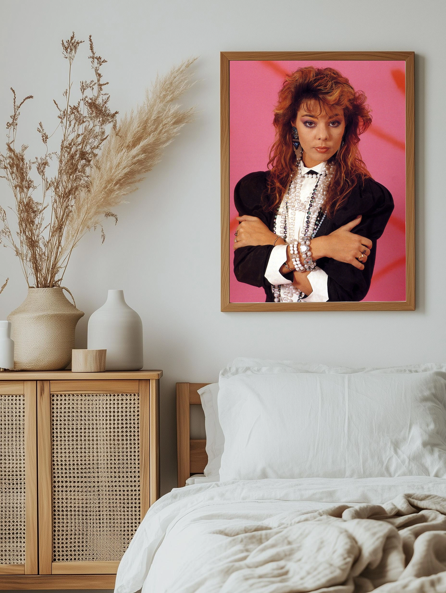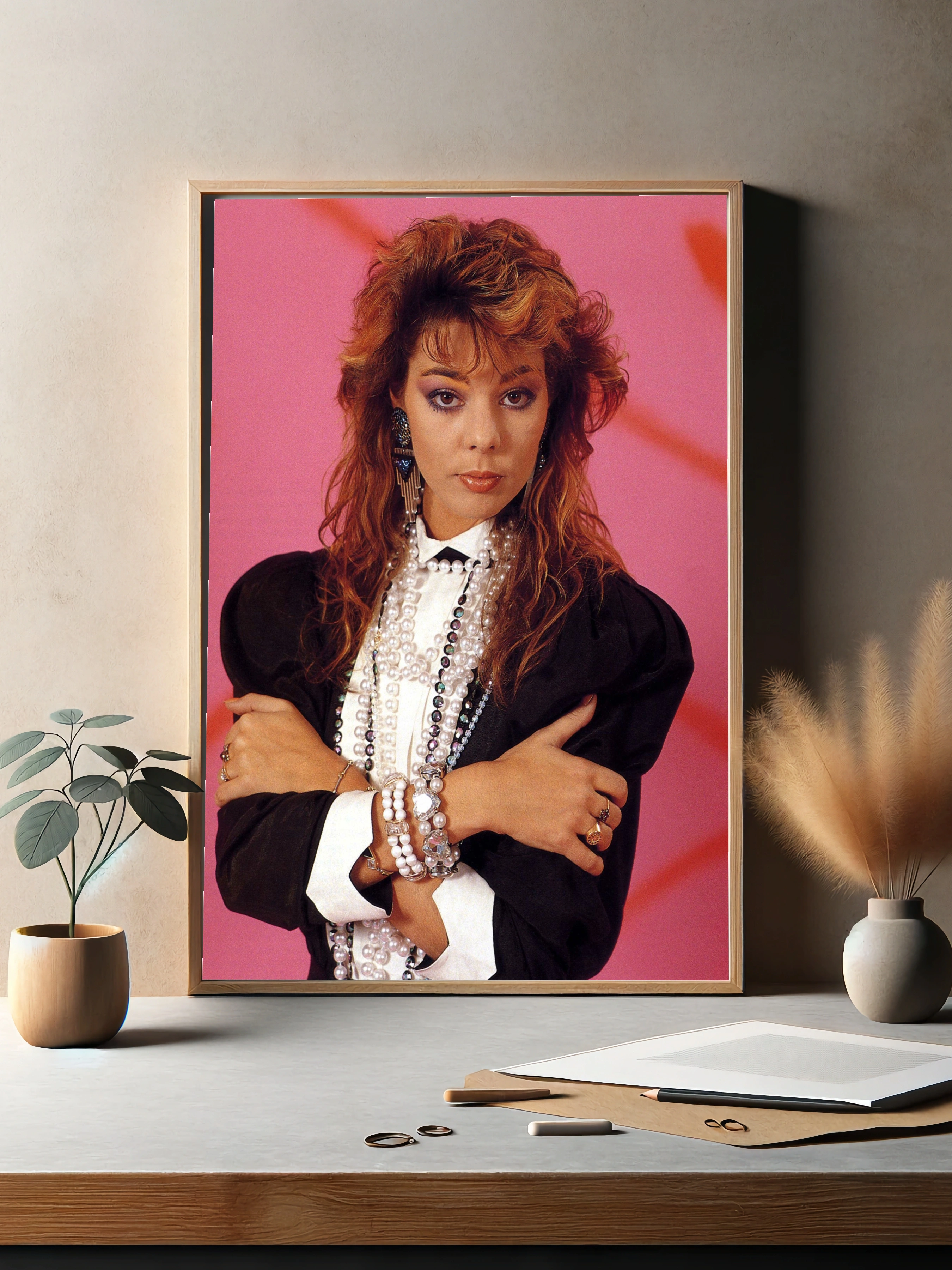 Изображён женский портрет в винтажном стиле 80-х, на розовом фоне. Девушка с пышной причёской и ярким макияжем одета в чёрный пиджак с широкой линией плеч и белую рубашку. На шее и руках множество жемчужных украшений, создающих атмосферу ретро и стильной элегантности. Картина для гостиной или спальни, подойдёт для современного интерьера с элементами моды и ретро.