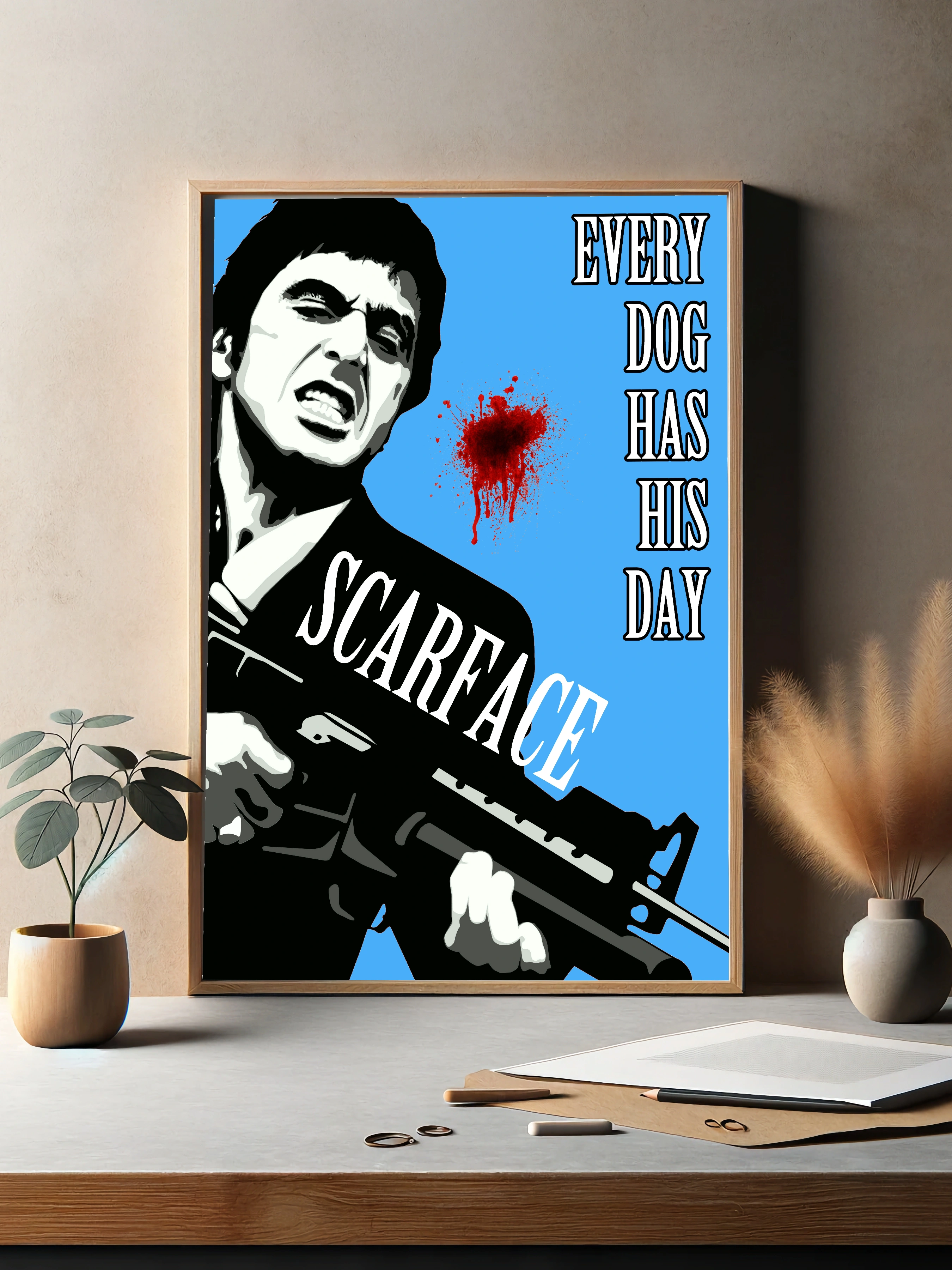 Интерьерный постер с изображением Тони Монтаны из легендарного фильма Scarface, выполненный в стиле поп-арт. Контрастные чёрно-белые силуэты на ярком голубом фоне сочетаются с кровавым пятном, создавая напряжённое и драматическое настроение. Идеальное современное искусство для стен гостиной или офиса.