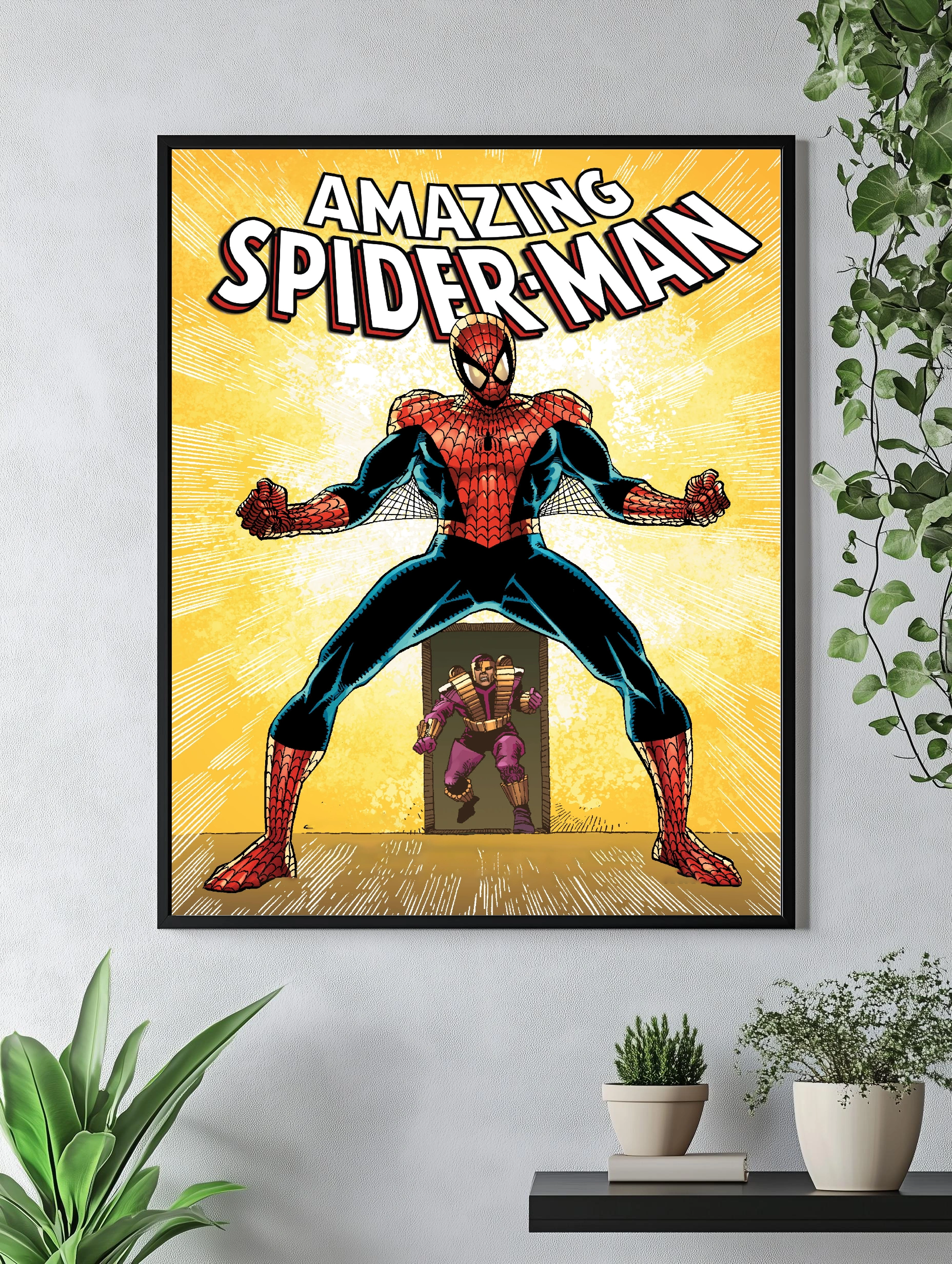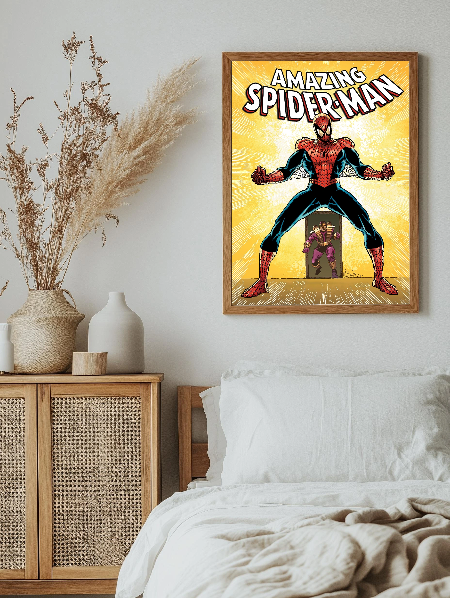 Изображение представляет собой классический комикс с персонажем Человек-паук в динамичной позе на жёлтом фоне. В центре доминирует Человек-паук в красно-синем костюме с чётко прорисованной паутиной. Внизу виден антигерой в пурпурном костюме. Картина идеально подходит как интерьерное искусство, декоративный плакат и стильный декор стен для поклонников супергероев и комиксов.