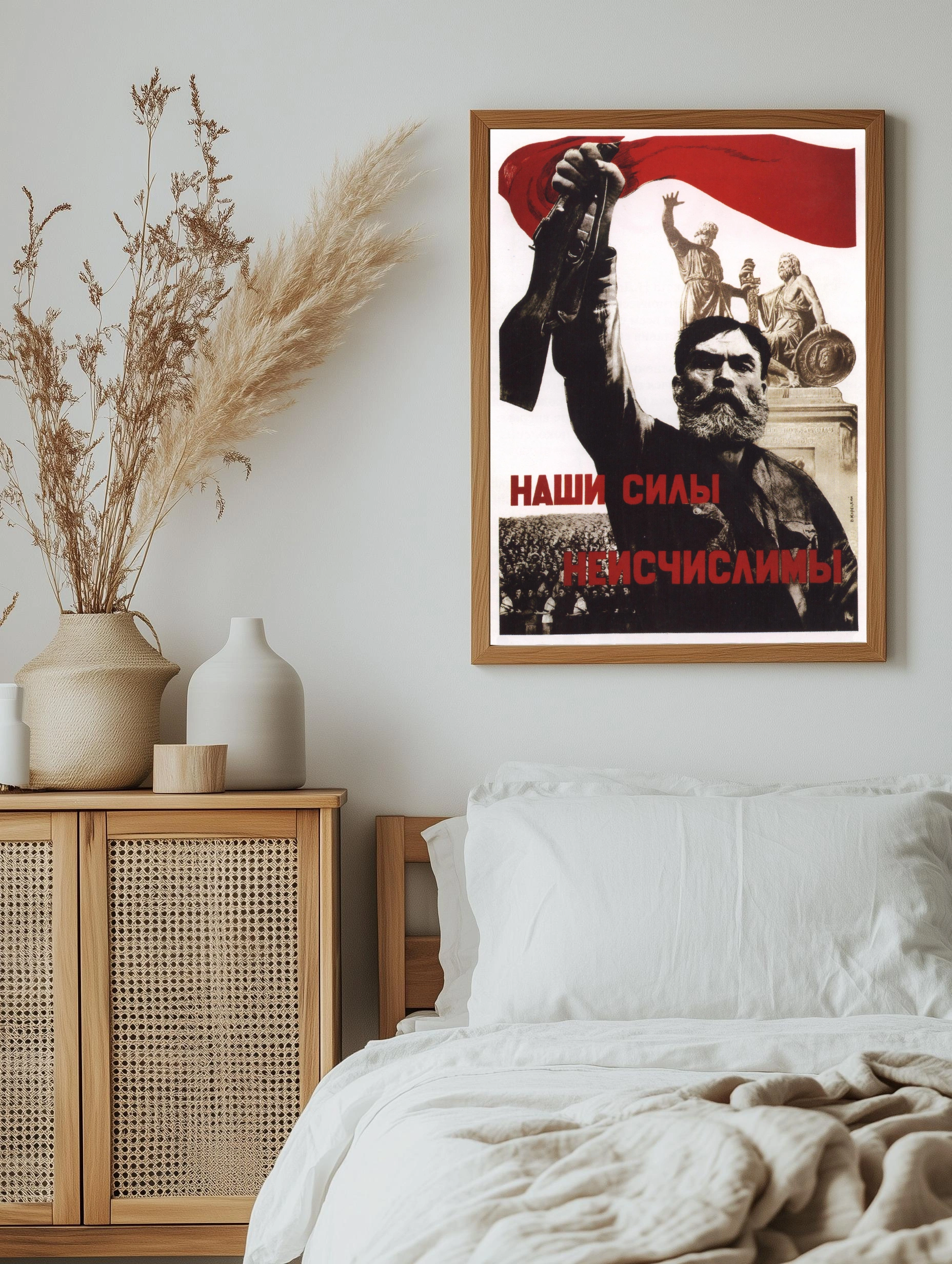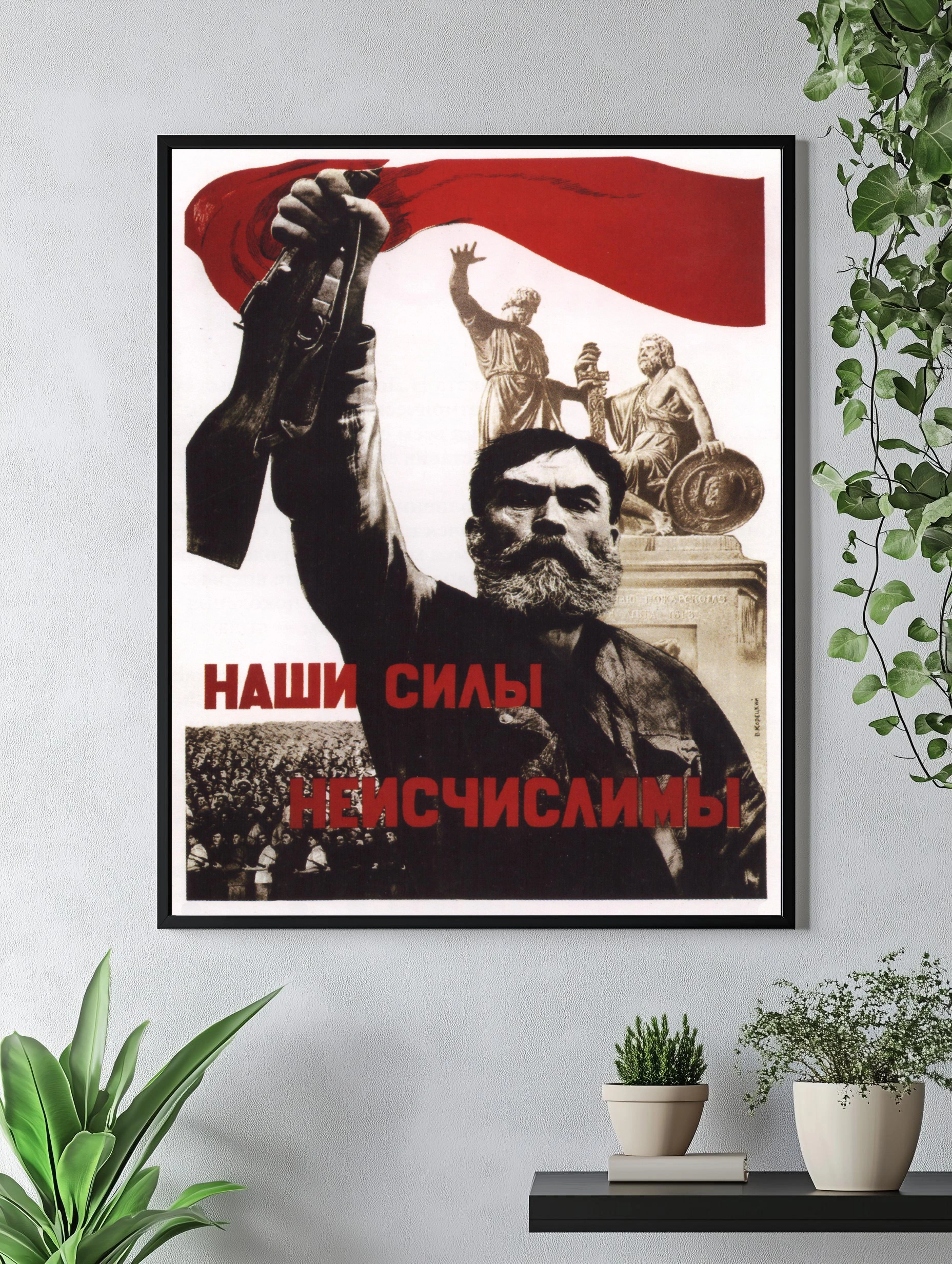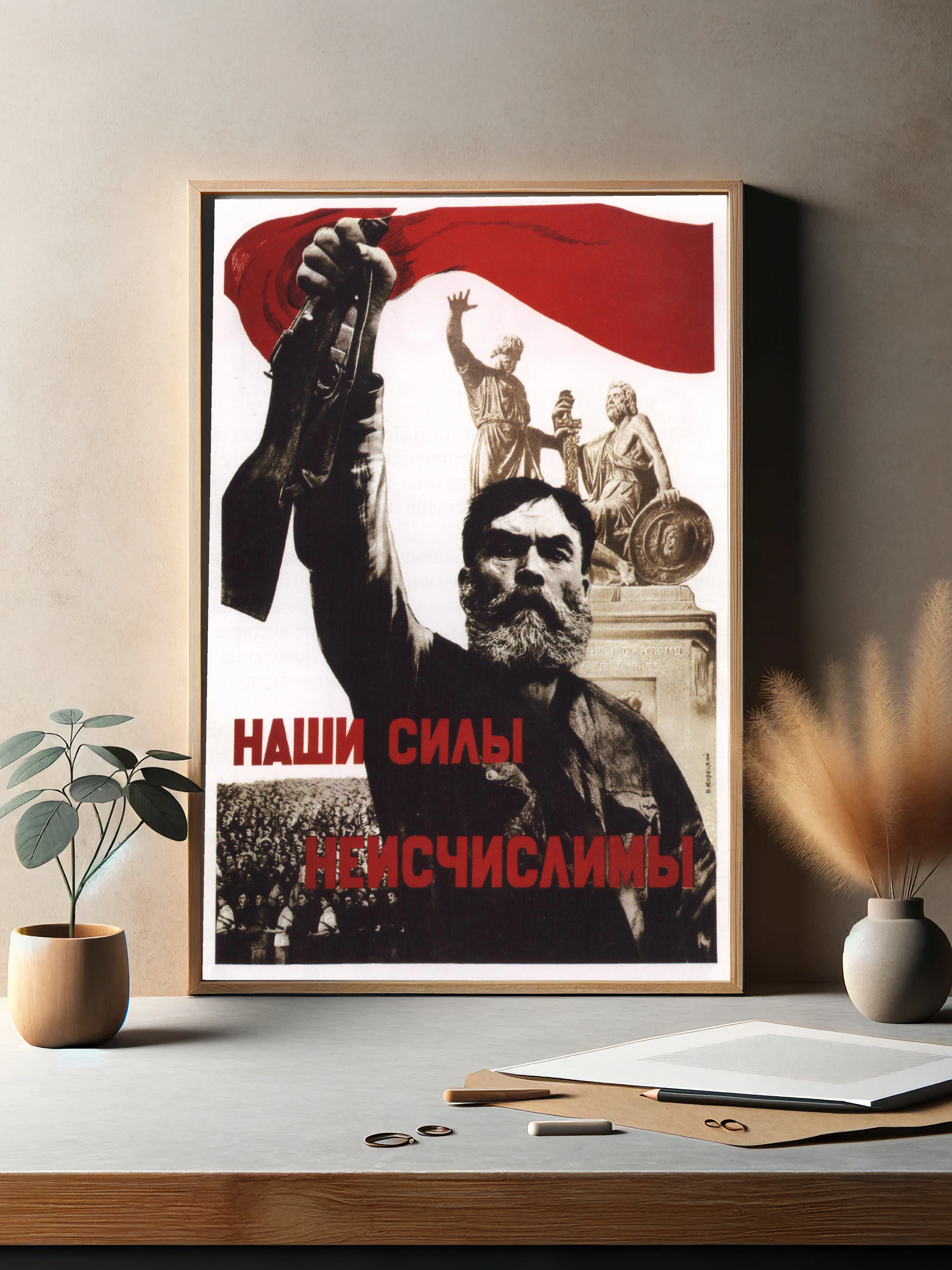 На изображении представлен советский революционный художественный плакат с мужественным мужчиной, поднимающим оружие, символизирующий борьбу народных масс. На фоне виден красный флаг и статуи, подчёркивающие историческую и идеологическую значимость. Картина выполнена в реалистичном стиле с акцентом на силу и единство. Отличный интерьерный постер для стен, современное искусство для дома с выраженной тематикой советской эпохи.