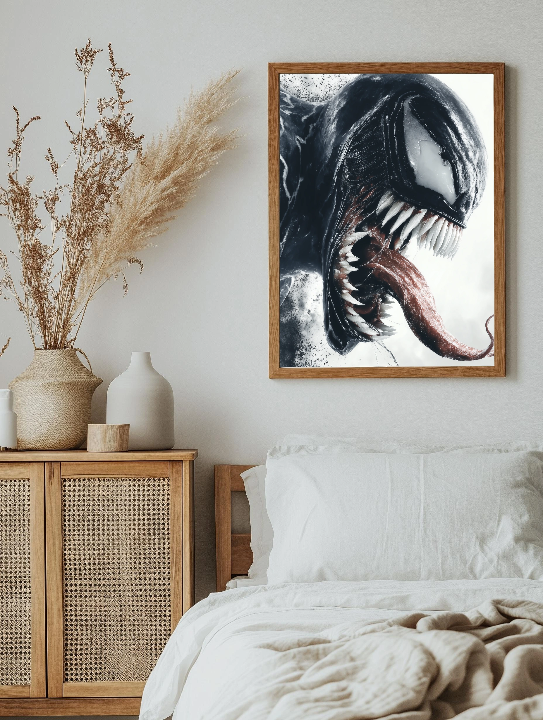 Декоративный плакат с изображением Венома, культового персонажа из комиксов Marvel. Арт выполнен в реалистичном стиле с детализированными элементами — крупный план головы Венома с широкой открытой пастью, длинным языком и острыми зубами. Черный и белый цвета доминируют, подчеркивая мрачную атмосферу и динамику. Отличный вариант современного искусства и стильного декора стен для гостиной или офиса.