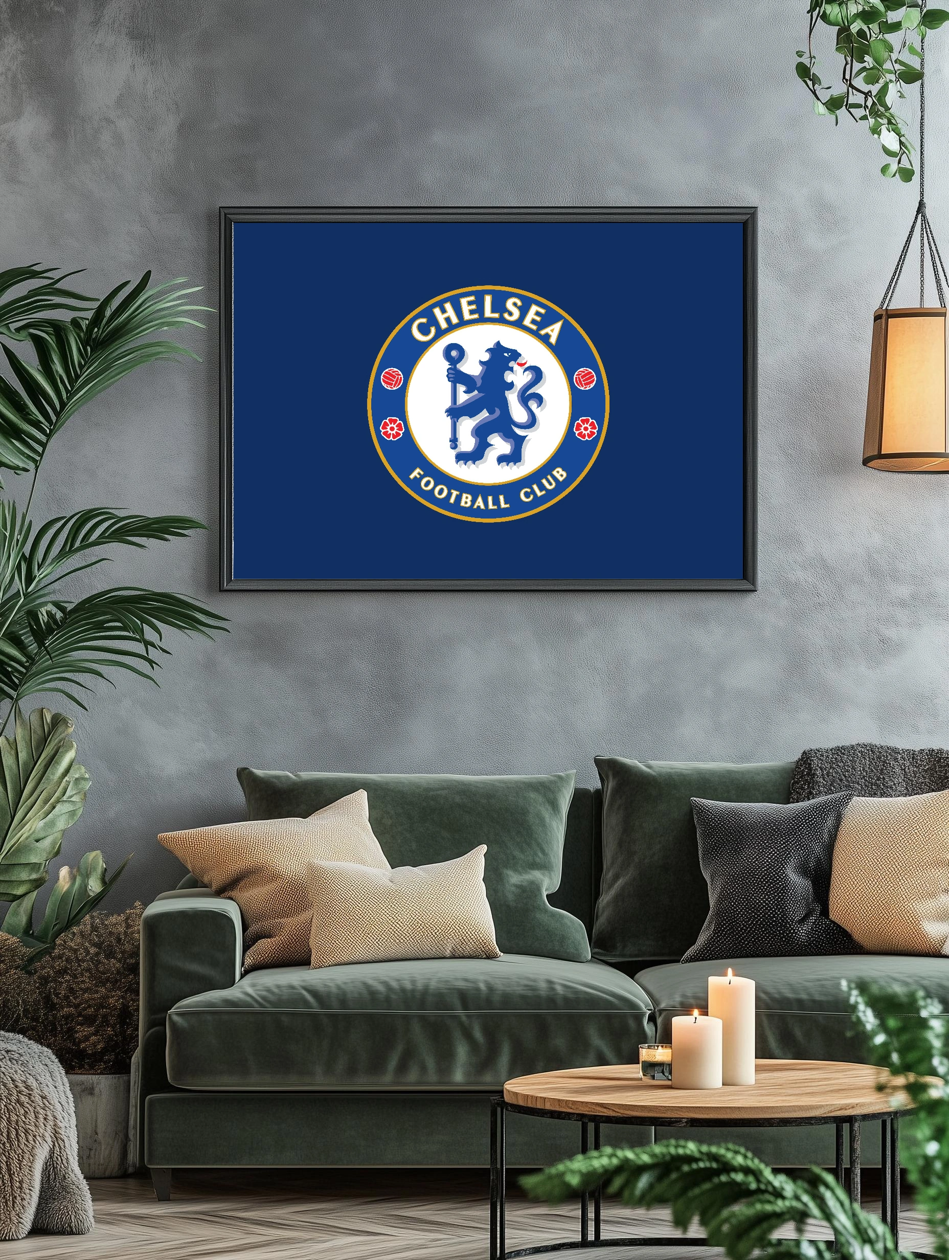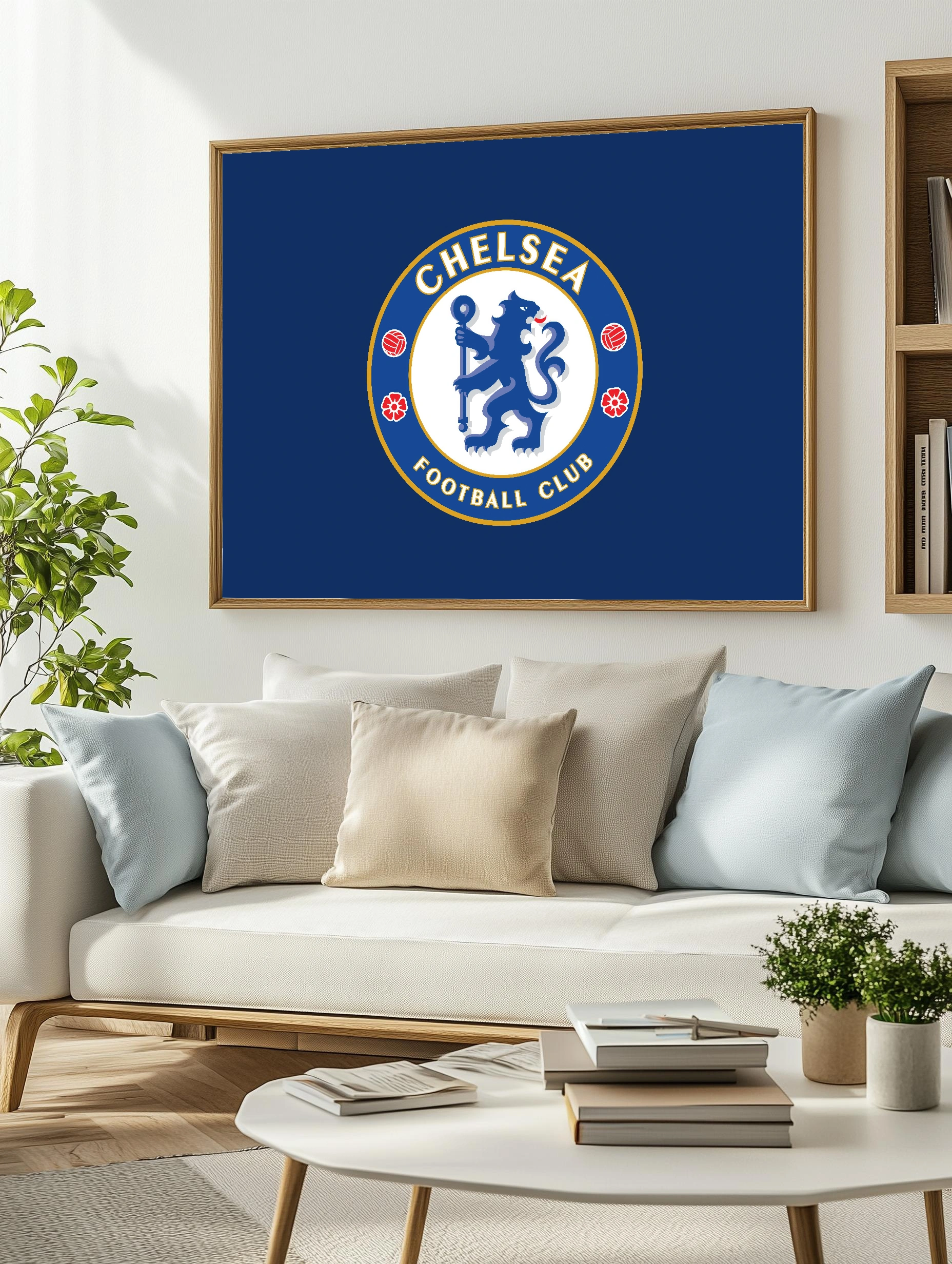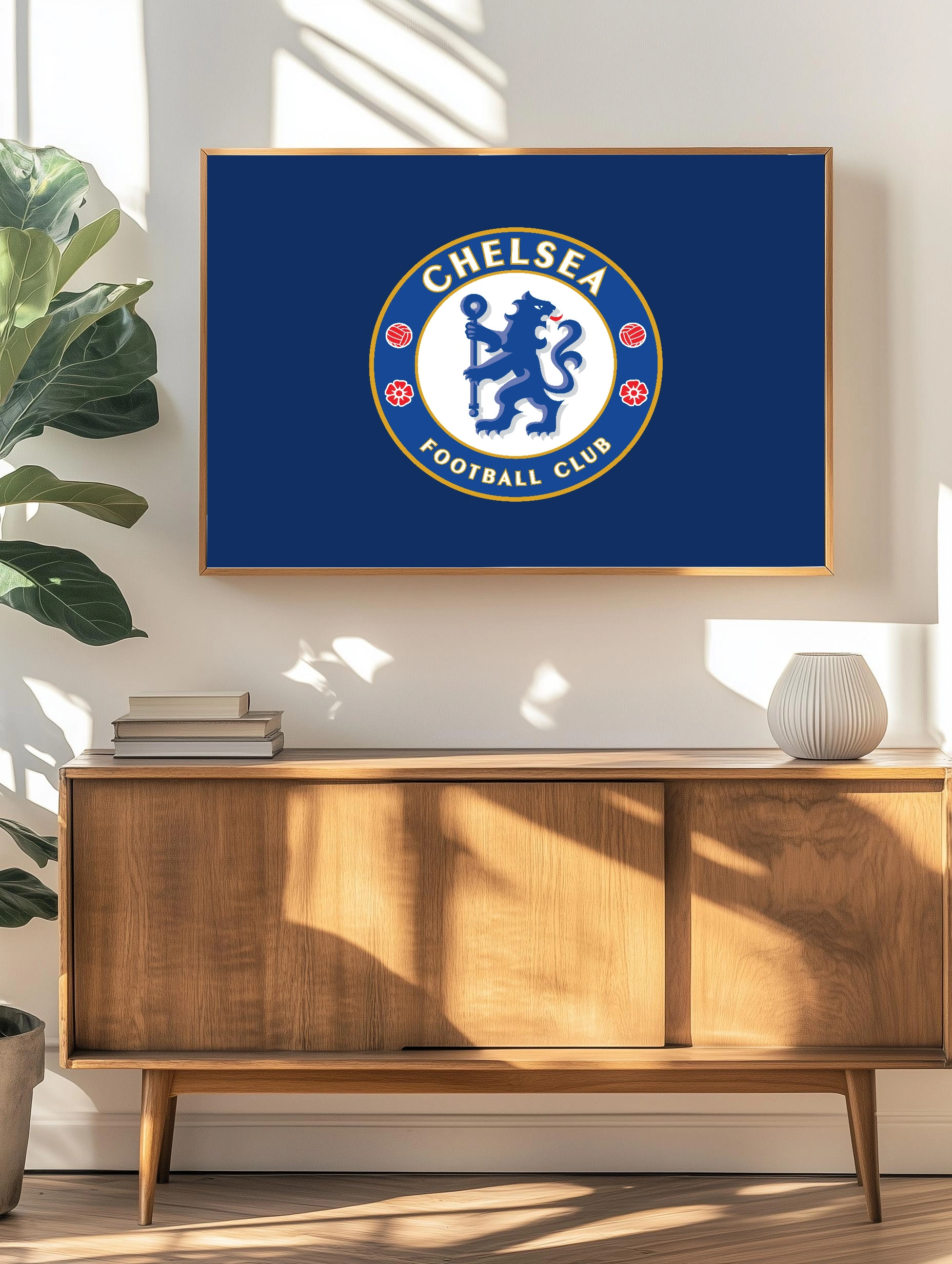 Интерьерный художественный плакат с фирменным логотипом футбольного клуба Челси. Центральный круг с изображением льва в синих оттенках, окружён золотистой каймой и элементами футбольного мяча и цветов. Отличный выбор для стильного декора стен, картина для гостиной или офиса фаната футбола.