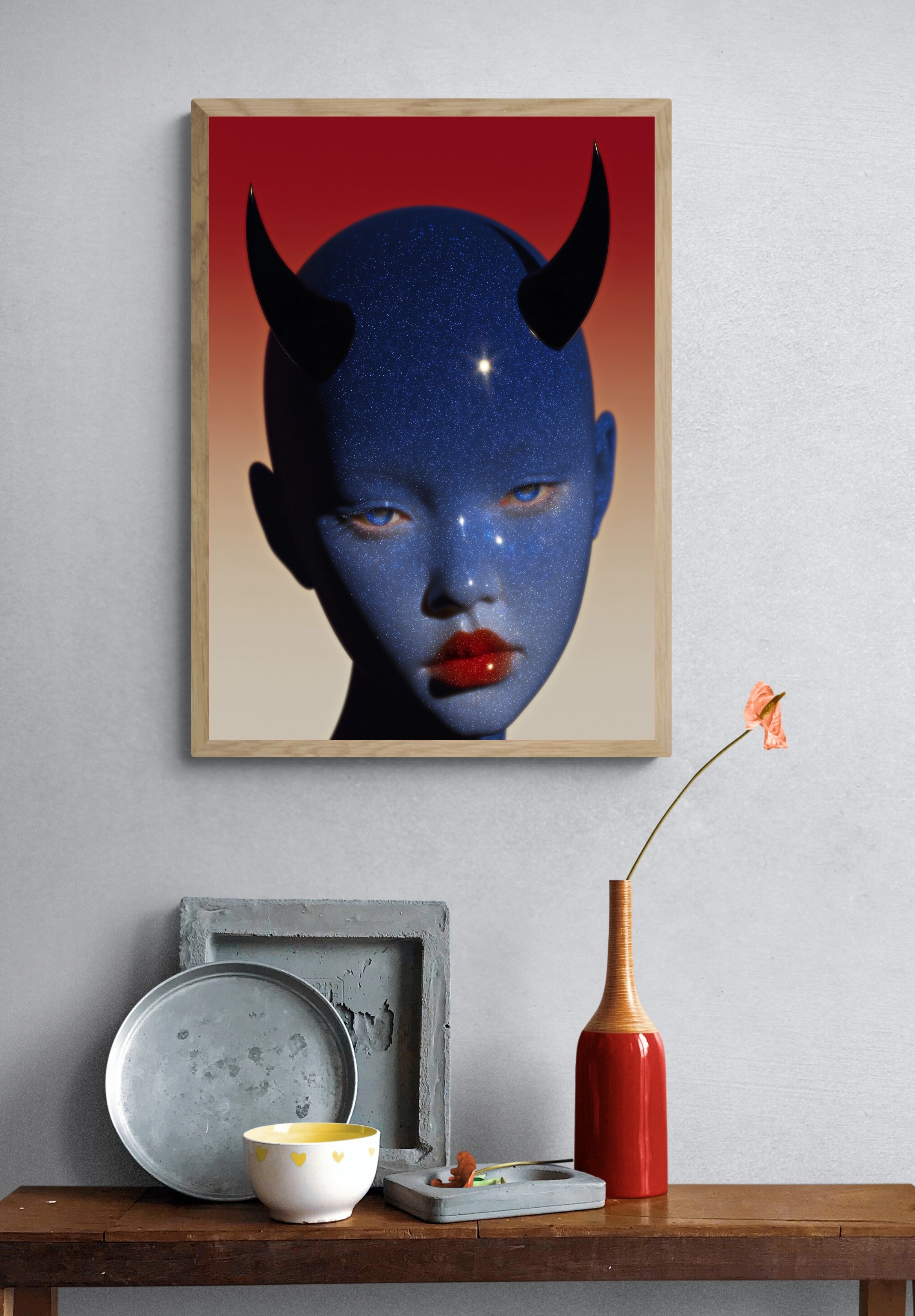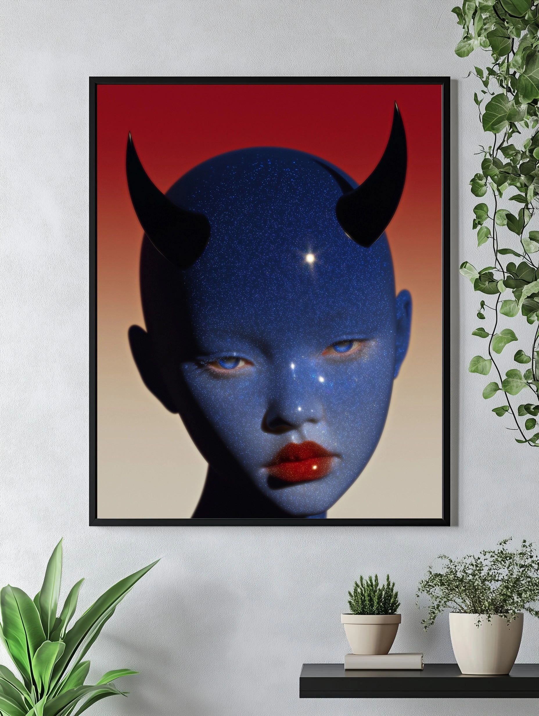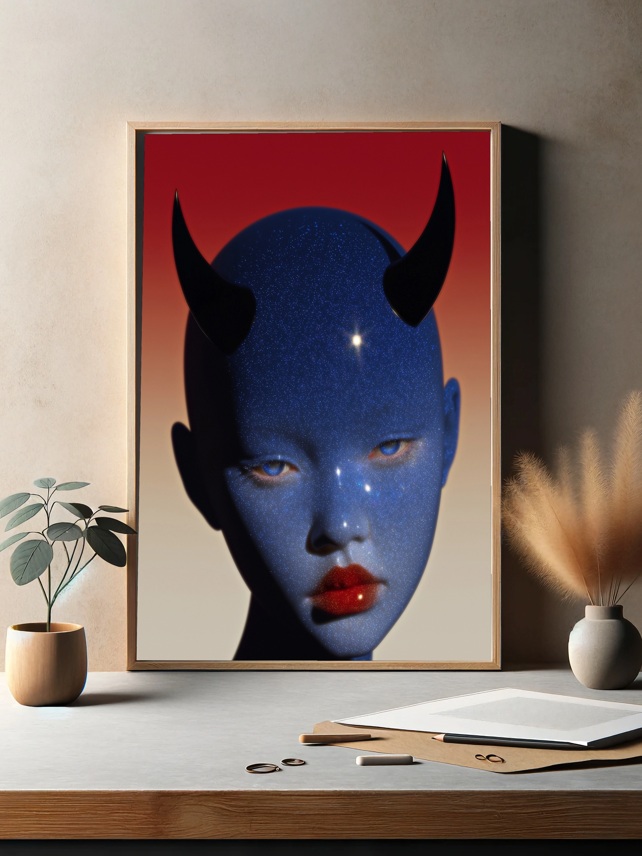 Этот постер представляет собой завораживающий портрет, изображающий фигуру с гладкой синей кожей, усыпанной блестками, создающими эффект звездного неба. На голове у модели изящно расположены черные рога, добавляющие образу загадочности и дерзости. Глубокие глаза с ярко-голубым оттенком смотрят прямо на зрителя, вызывая ощущение интриги и притяжения. Фон плавно переходит от ярко-красного к нежно-оранжевому, создавая контраст и подчеркивая яркость главного объекта. Стиль работы можно отнести к современному искусству с элементами поп-арта, что придает ей уникальность и актуальность. Этот постер станет отличным акцентом в интерьере гостиной, спальни или креативного пространства, привлекая внимание и вдохновляя. Идеален для молодежной аудитории и креативщиков, стремящихся выделиться и подчеркнуть свою индивидуальность.