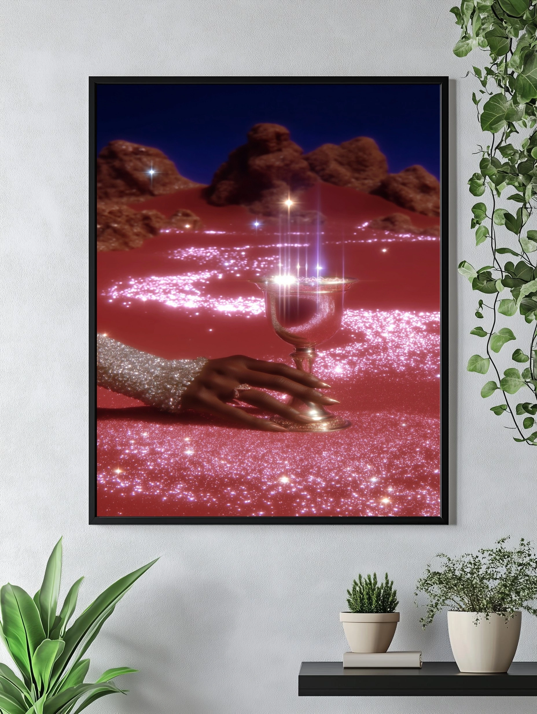 Погрузитесь в мир волшебства с этим уникальным постером, на котором изображен изысканный серебряный кубок, удерживаемый в элегантной руке, украшенной блестящими стразами. Фон выполнен в насыщенном розовом цвете, усыпанном сверкающими частицами, создающими эффект звездного неба. Вокруг кубка играют яркие блики света, добавляя ощущение магии и загадки. Этот постер выполнен в стиле современного искусства с элементами абстракции, что придает ему уникальность и стиль. Идеально подойдет для оформления гостиной, спальни или креативного пространства, добавляя нотку роскоши и вдохновения. Целевая аудитория — молодежь и креативщики, стремящиеся к оригинальности и самовыражению.