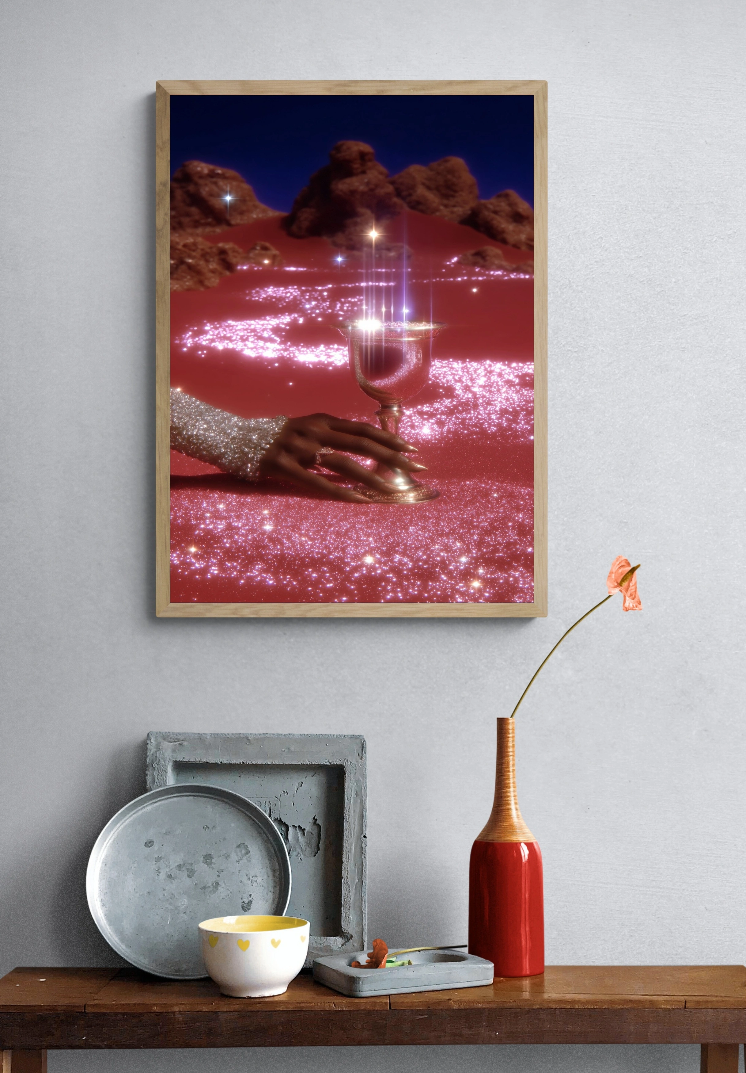 Погрузитесь в мир волшебства с этим уникальным постером, на котором изображен изысканный серебряный кубок, удерживаемый в элегантной руке, украшенной блестящими стразами. Фон выполнен в насыщенном розовом цвете, усыпанном сверкающими частицами, создающими эффект звездного неба. Мягкие линии и блеск придают композиции загадочность и притягательность. Стиль изображения — современный арт, который вызывает восхищение и вдохновение. Этот постер станет идеальным акцентом для вашей гостиной, спальни или креативного пространства, добавляя нотку роскоши и утонченности. Подходит для молодежной аудитории и тех, кто ценит уникальный дизайн и атмосферу праздника.