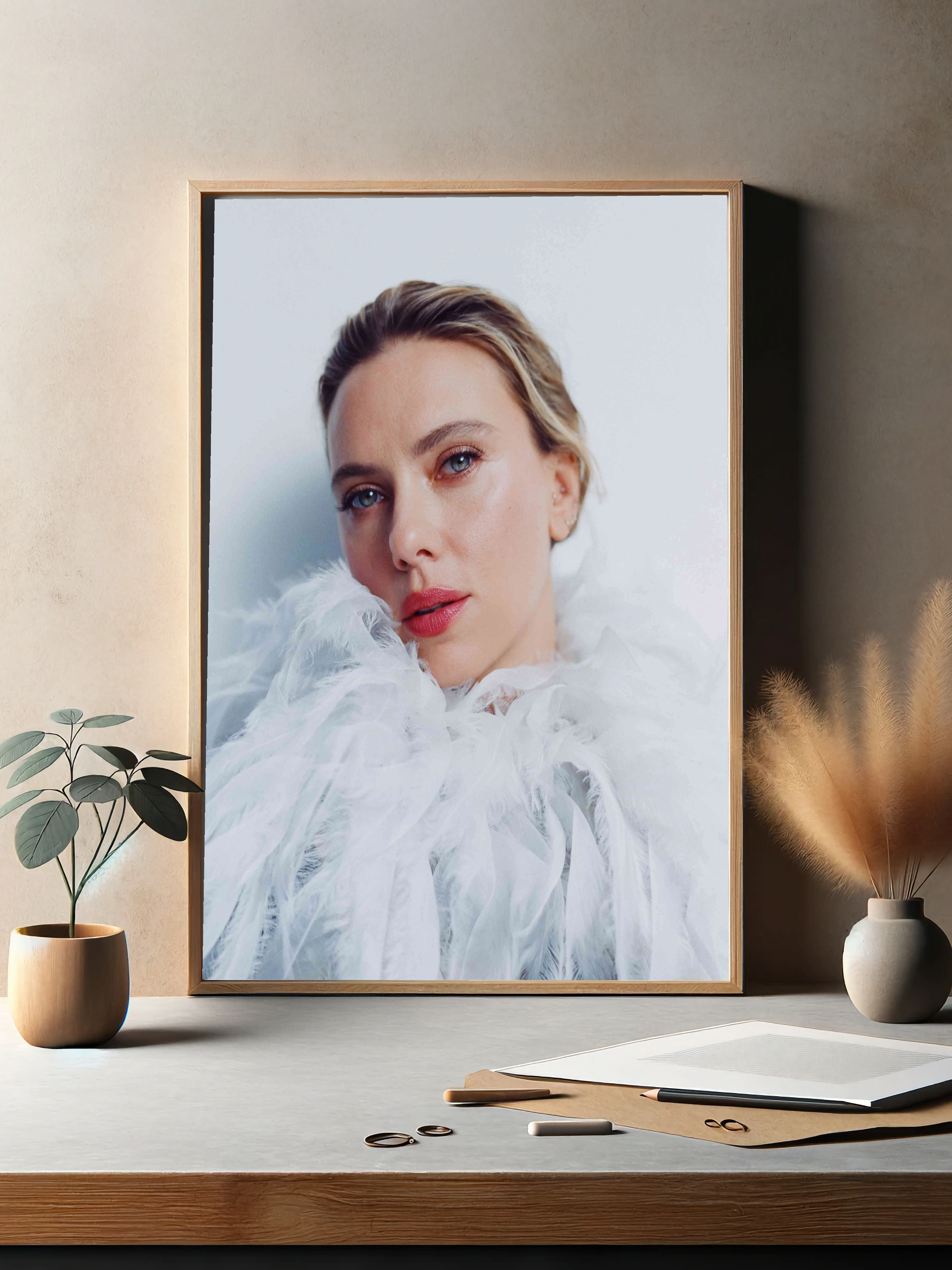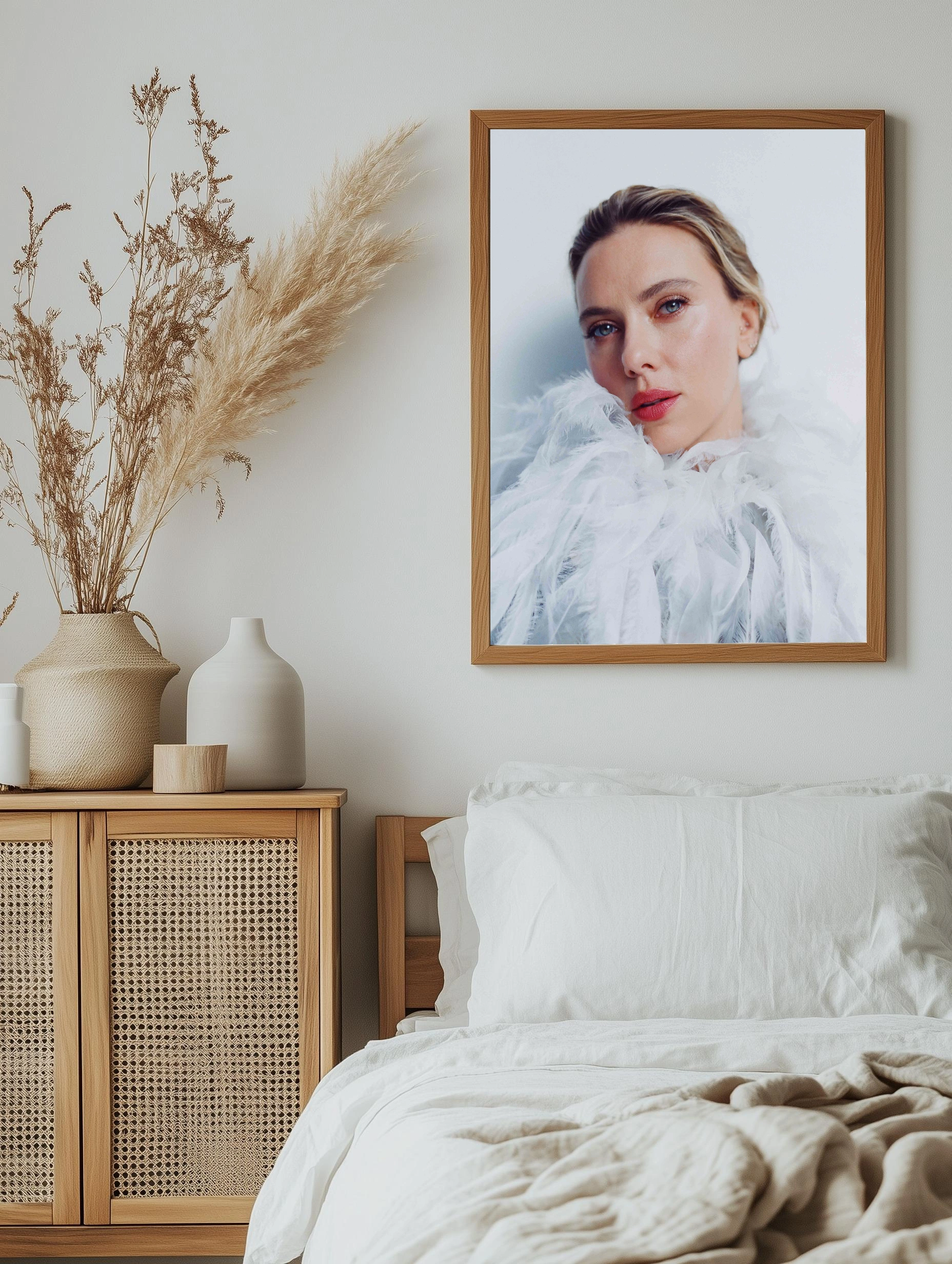 На изображении представлен крупный портрет женщины, облачённой в наряд из белых перьев, что создаёт эффект лёгкости и воздушности. Светлый фон подчёркивает чистоту и свежесть образа. Фокус на выразительных голубых глазах и нежном макияже добавляет изысканности. Отличный выбор для интерьерного искусства и стильного декора стен, идеально подходит для спальни или гостиной как художественный плакат с уникальной текстурой.
