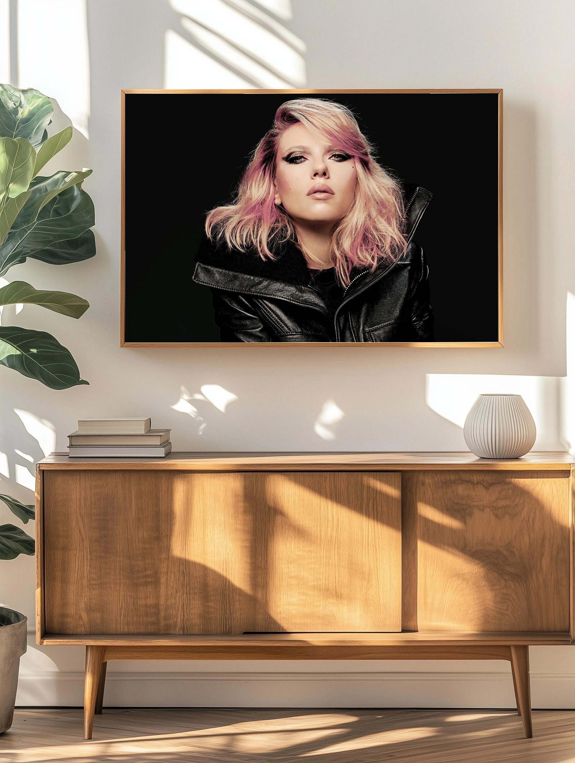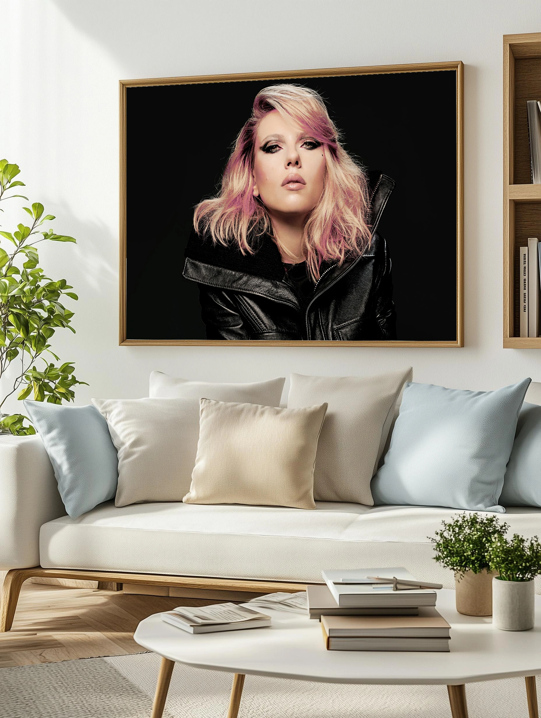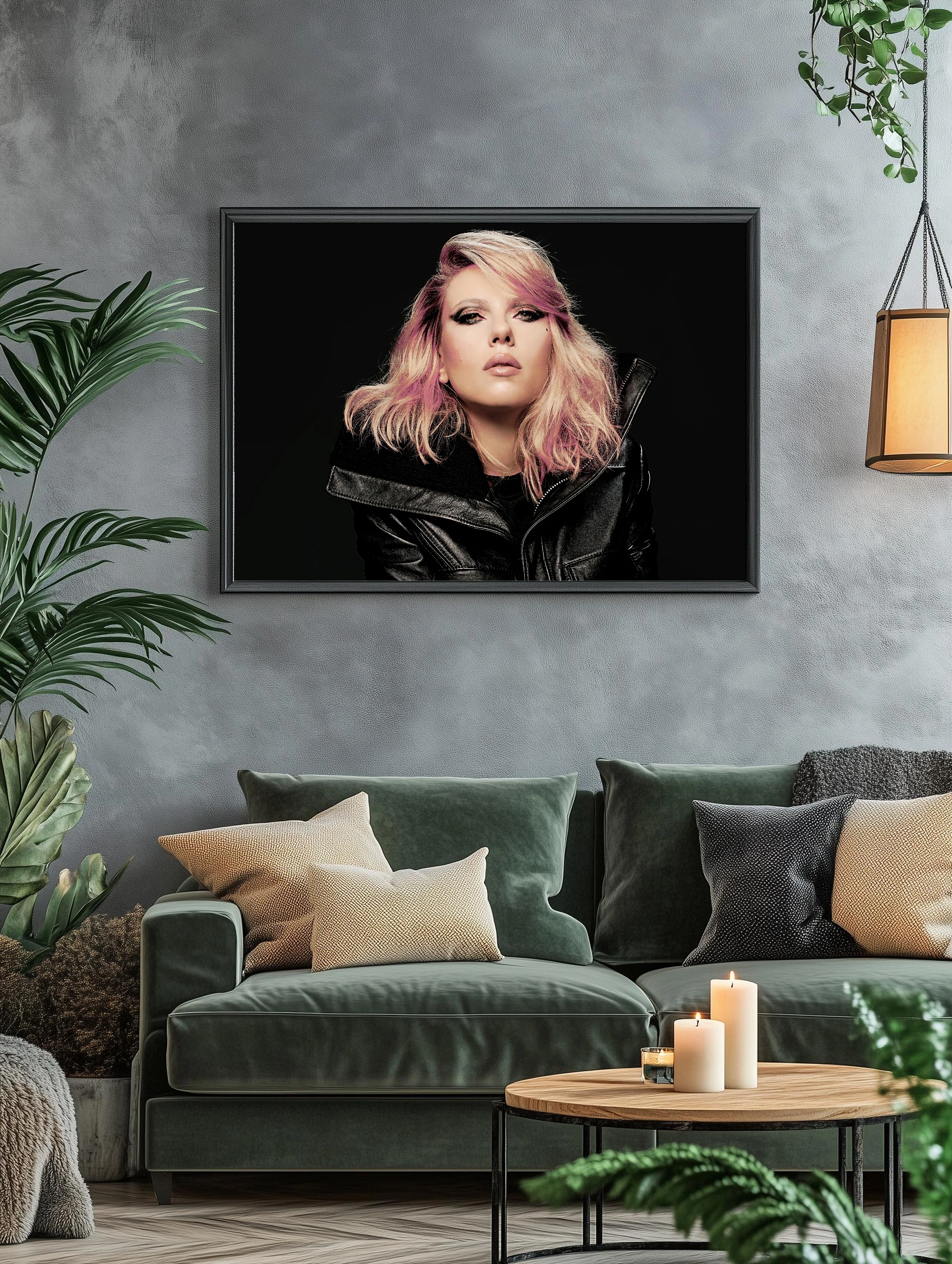 Декоративная картина с изображением молодой женщины в кожаной куртке на темном фоне. Светлые волосы с розовым оттенком и чёткий макияж создают выразительный и загадочный образ. Этот интерьерный арт для спальни или гостиной станет стильным украшением современного дома.