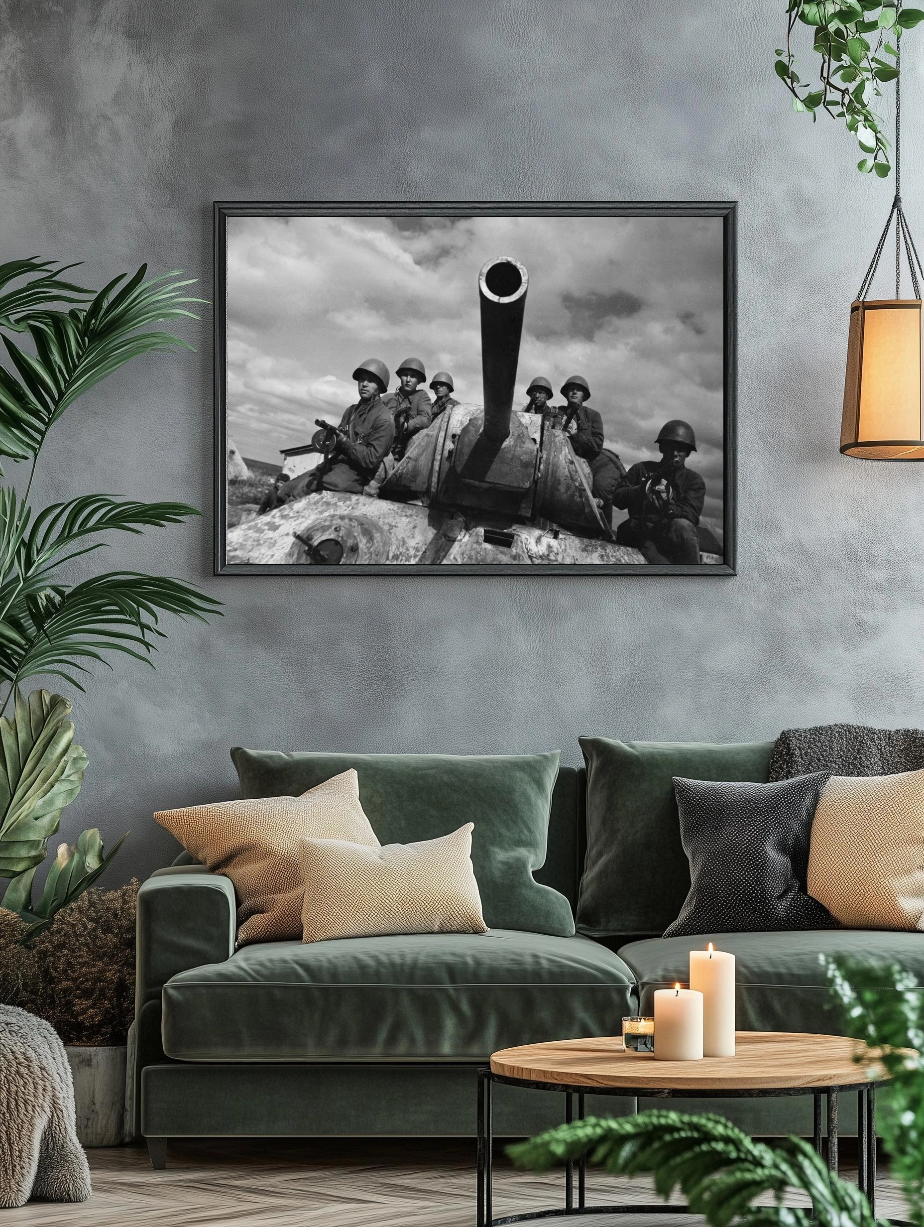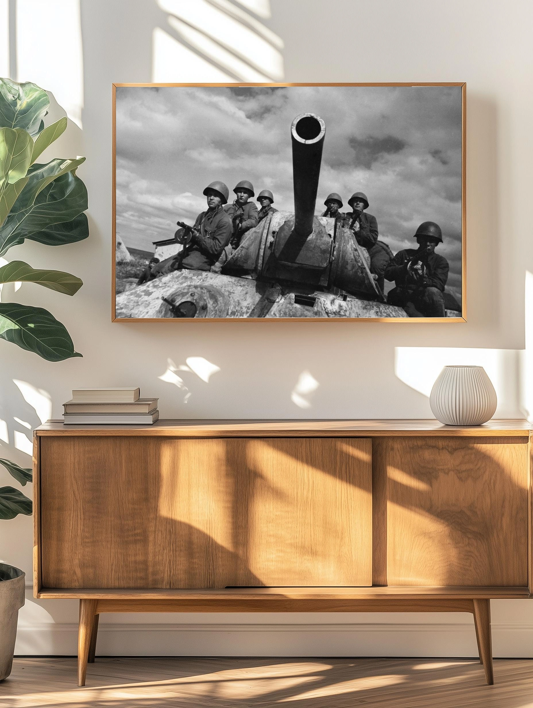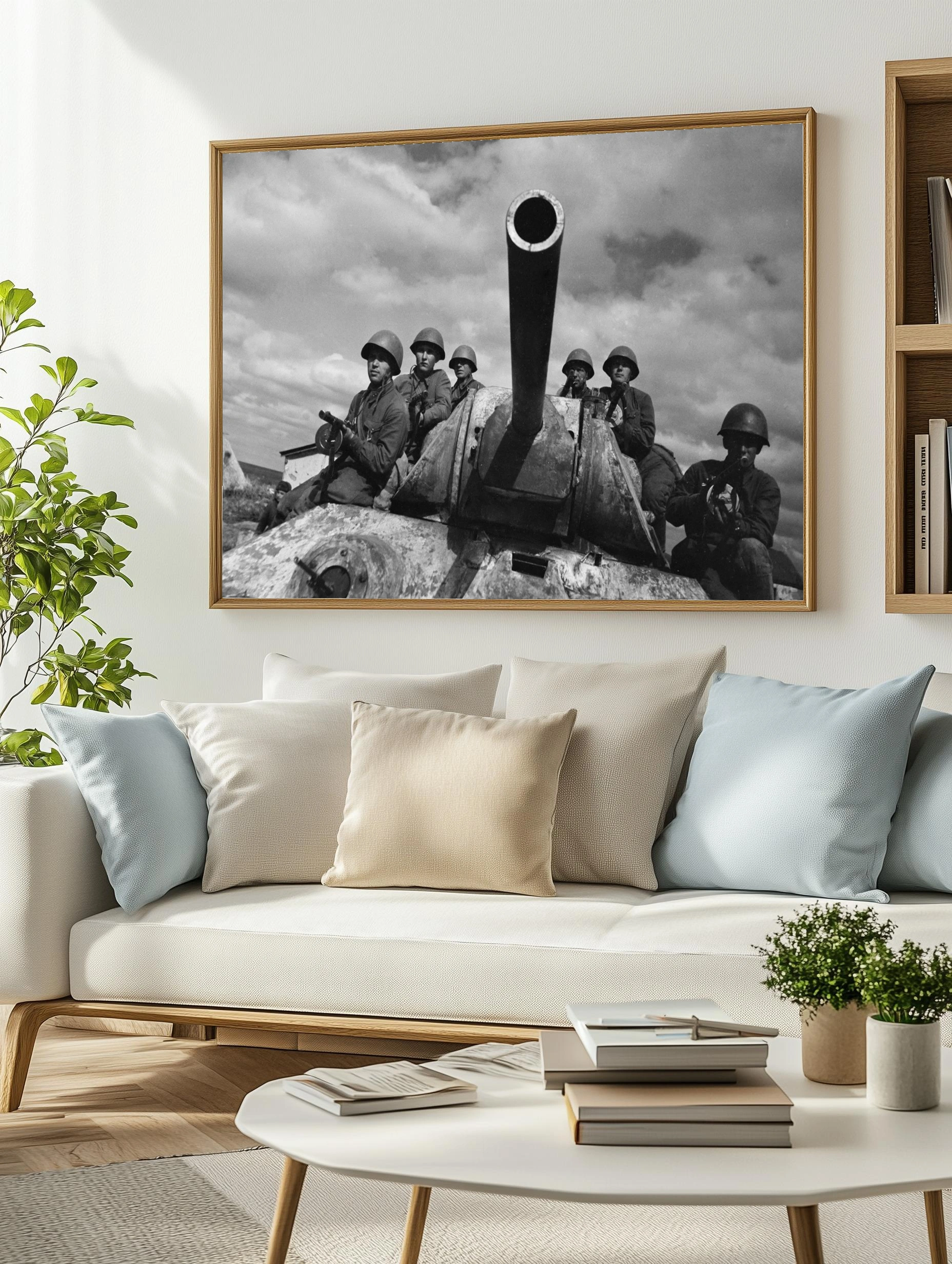 Чёрно-белое фото, запечатлевшее группу солдат, сидящих на танке времен Второй мировой войны. Их серьёзные выражения лиц и военная форма подчеркивают момент напряжённости и единства на поле боя. Настенный декор для любителей военной истории и интерьера в стиле ретро.