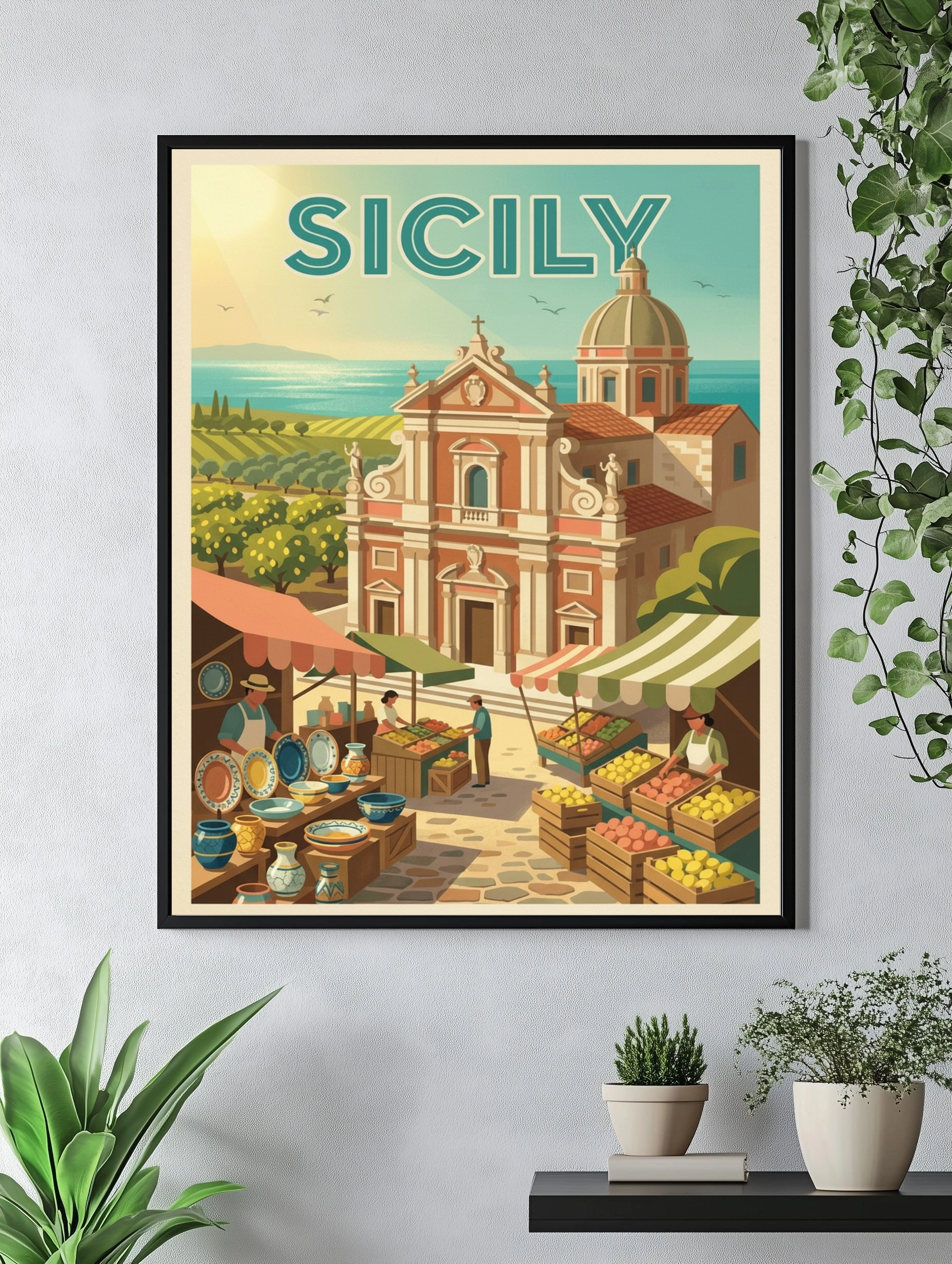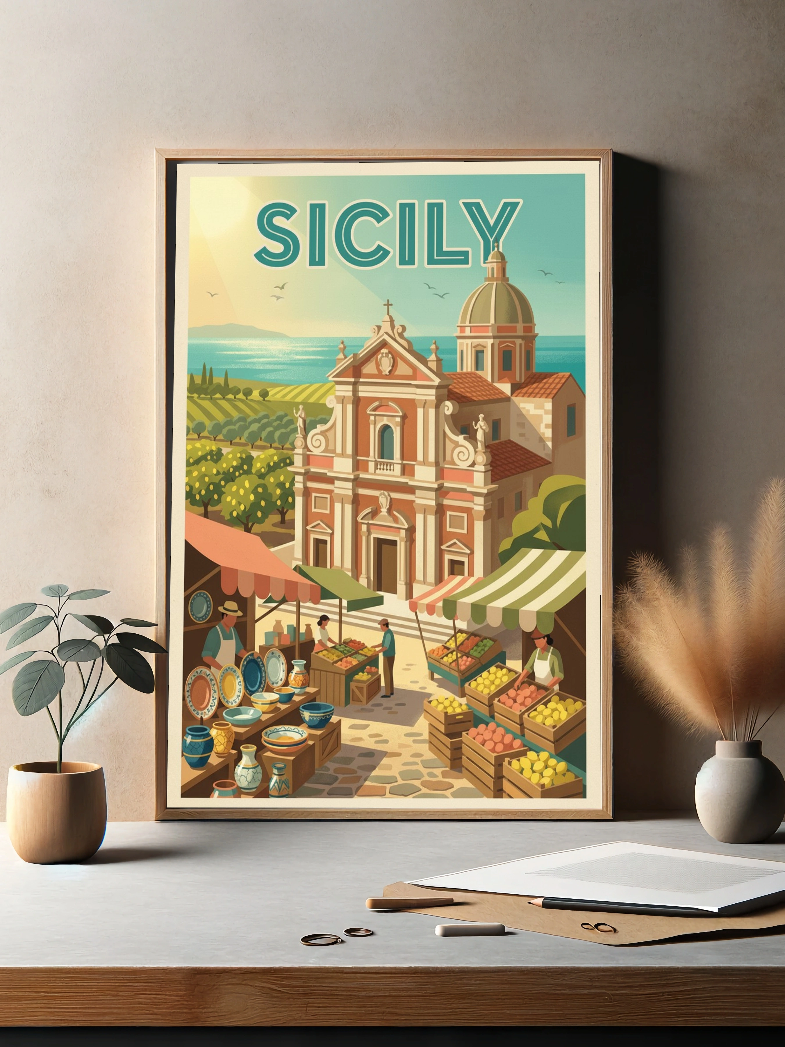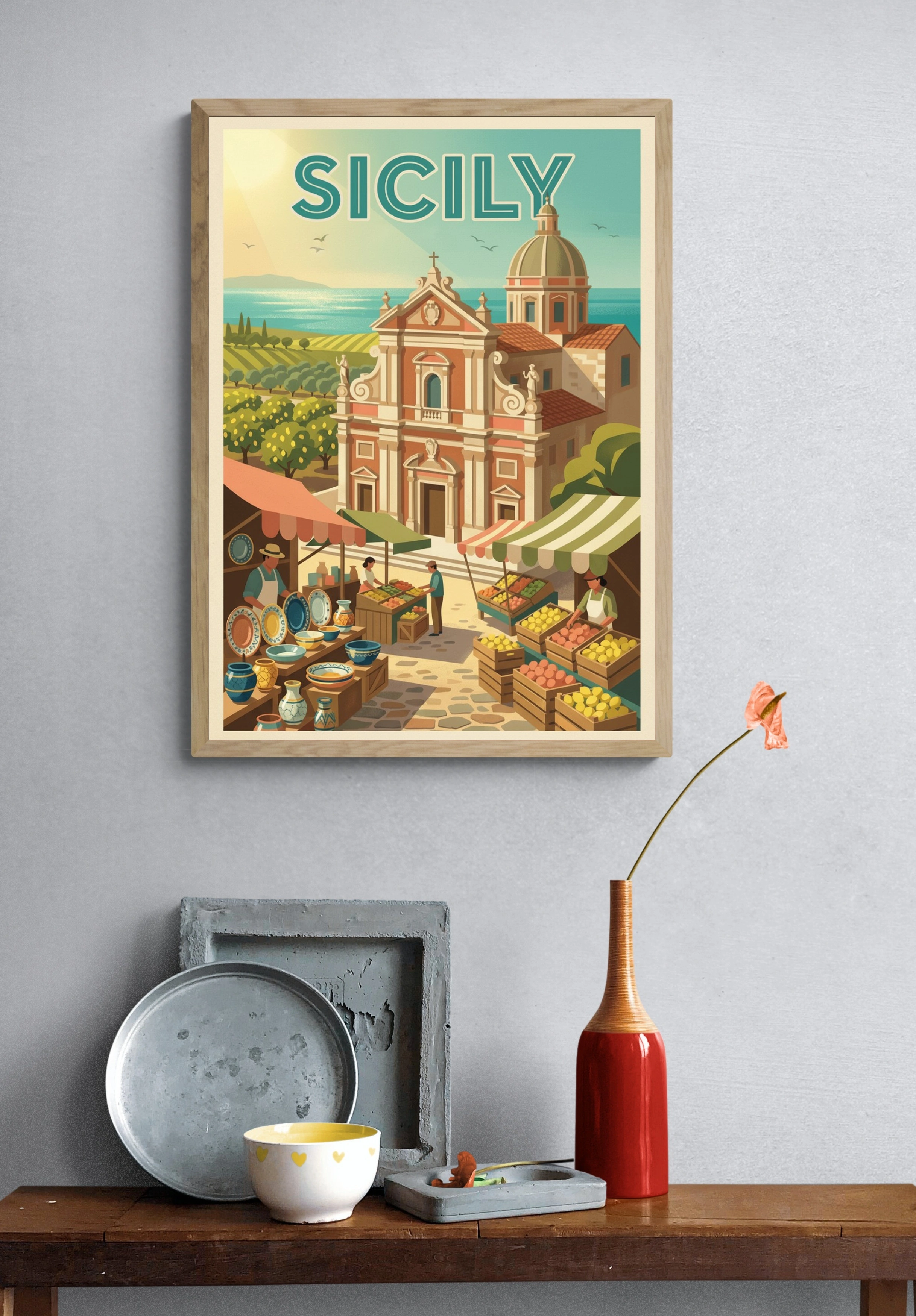 Погрузитесь в атмосферу солнечной Сицилии с этим ярким постером, изображающим живописный рынок. На переднем плане вы видите прилавки с разнообразными фруктами и керамическими изделиями, которые привлекают внимание яркими цветами. В центре композиции возвышается величественное здание с куполом, окруженное зелеными виноградниками и морским пейзажем на заднем плане. Легкие оттенки желтого и зеленого создают ощущение тепла и уюта, а голубое небо добавляет свежести. Этот постер идеально подойдет для оформления кухни или столовой, придавая пространству атмосферу средиземноморского уюта. Он привлечет внимание молодежи и семей, желающих добавить яркие акценты в свой интерьер.