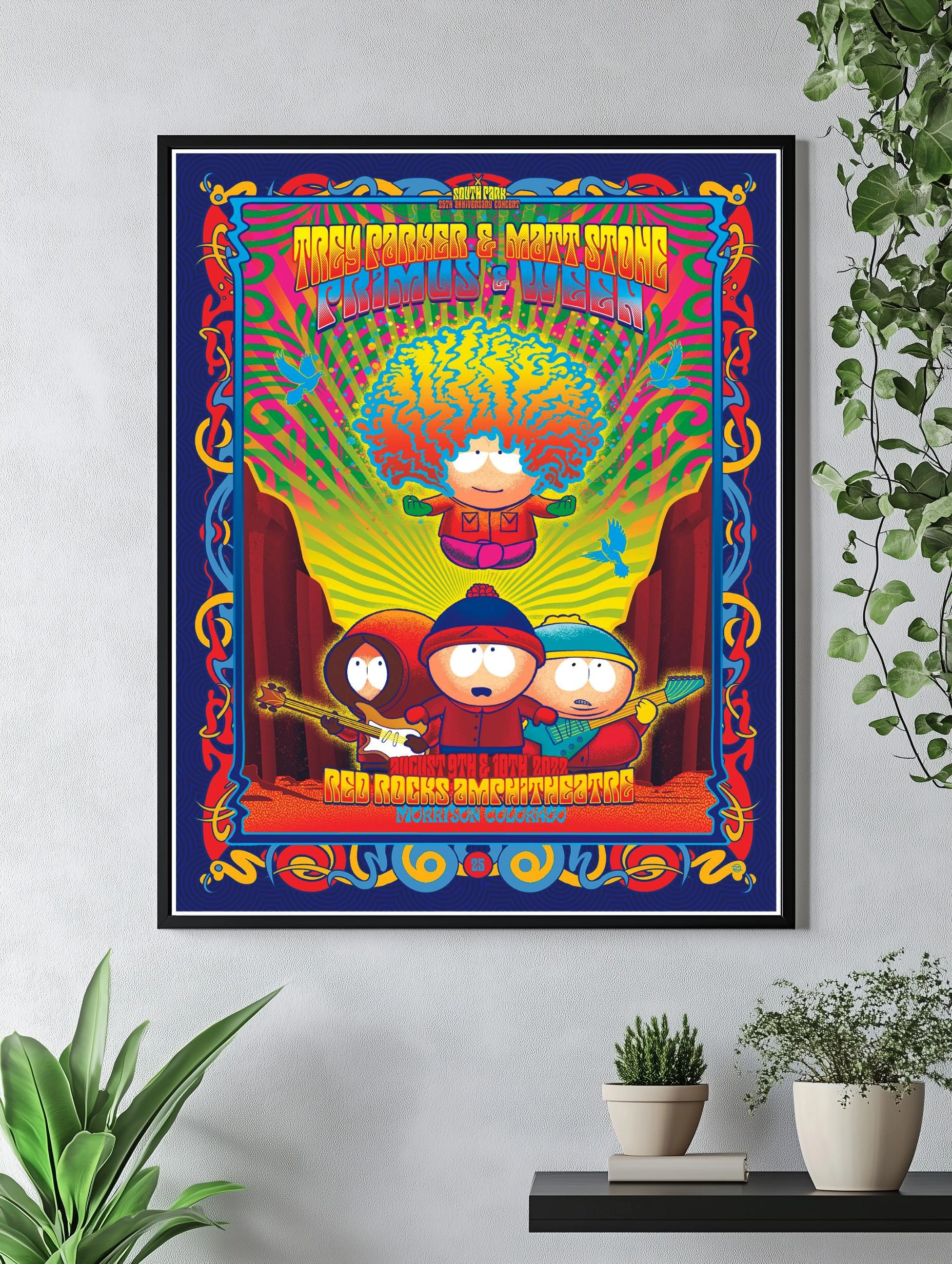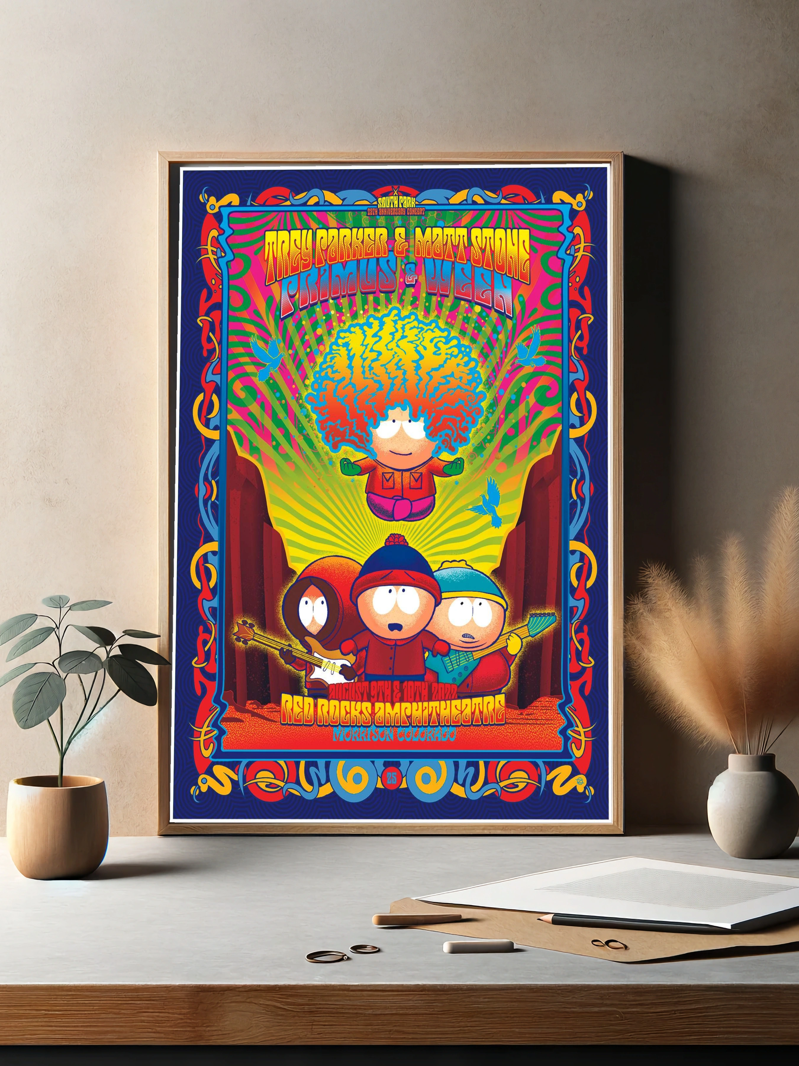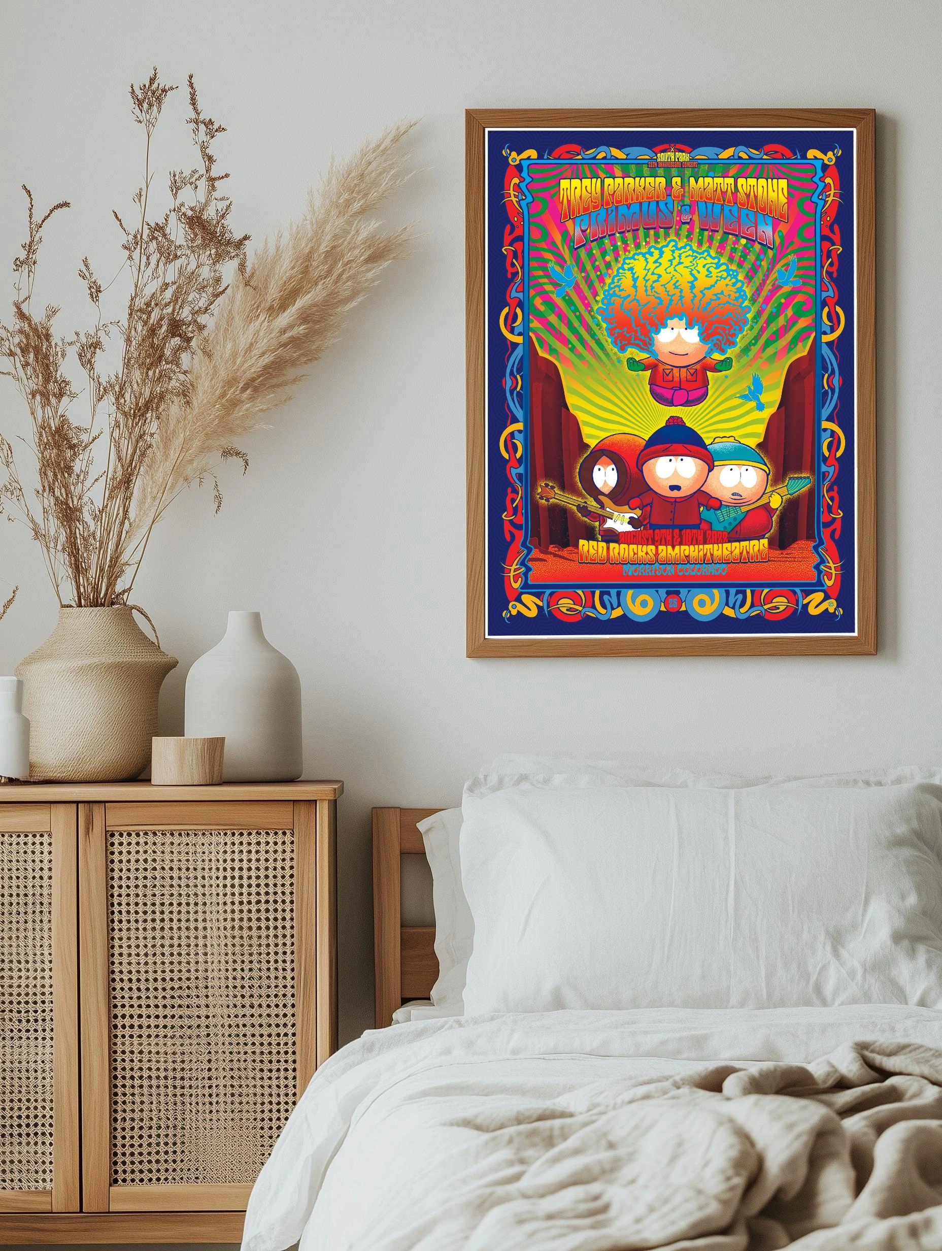 Смелый и яркий интерьерный постер с персонажами культового мультсериала South Park. В центре композиции — герой с пышной яркой прической в стиле психоделики, окружённый другими главными персонажами сериала с музыкальными инструментами на фоне ярко-жёлтого и красного неона. Этот декоративный плакат идеально впишется в современный интерьер, добавляя энергию и уникальность пространству.