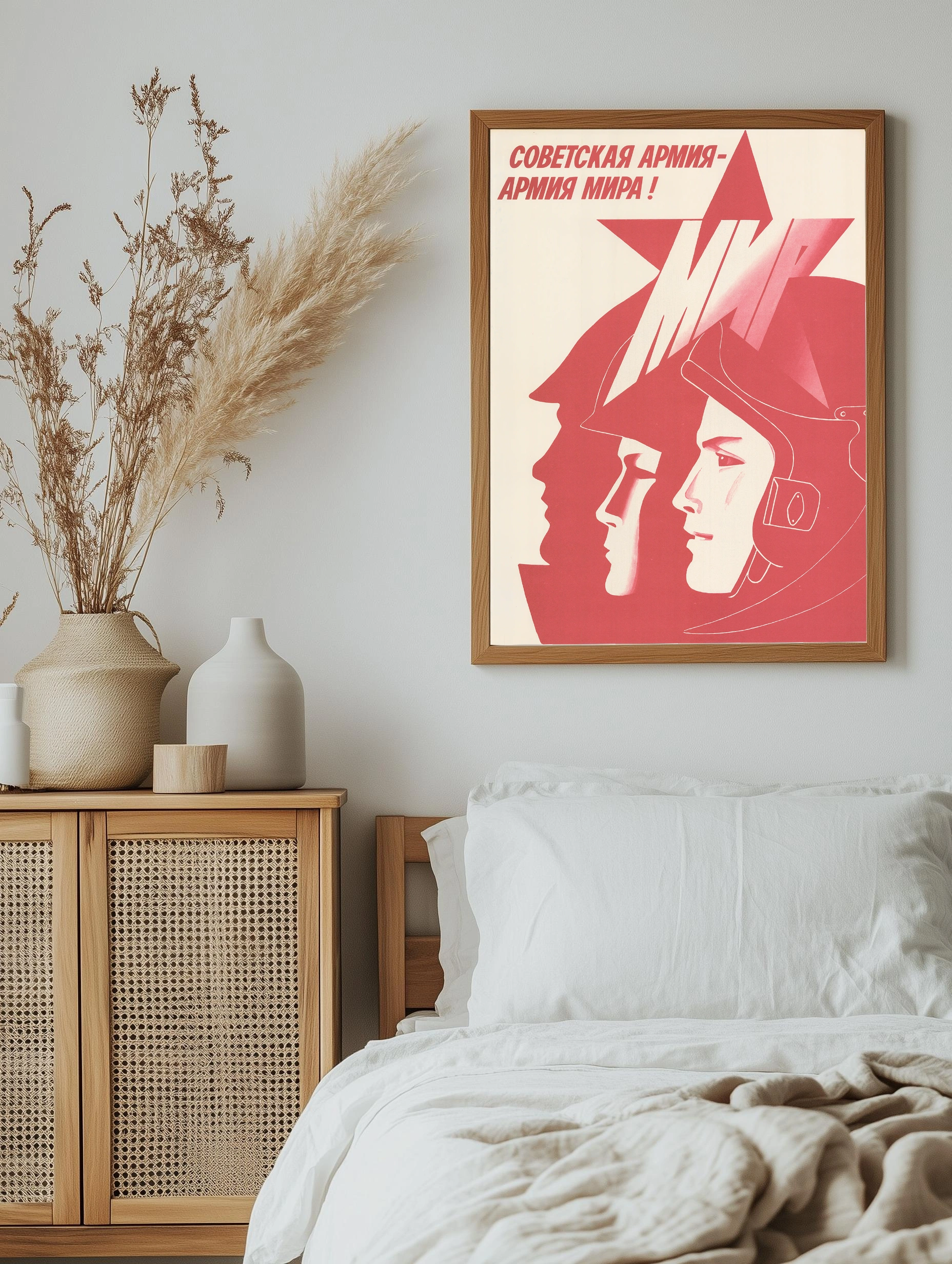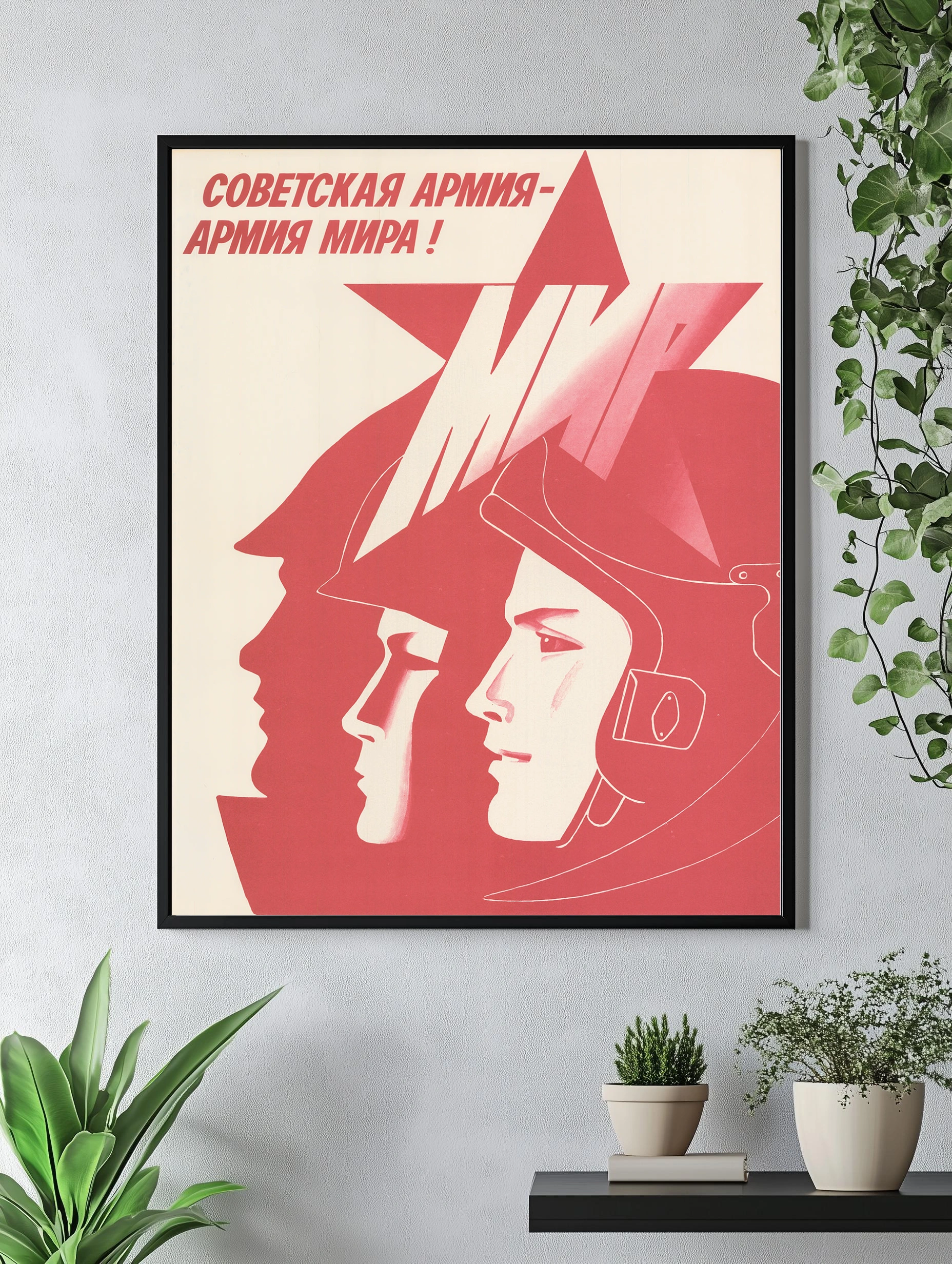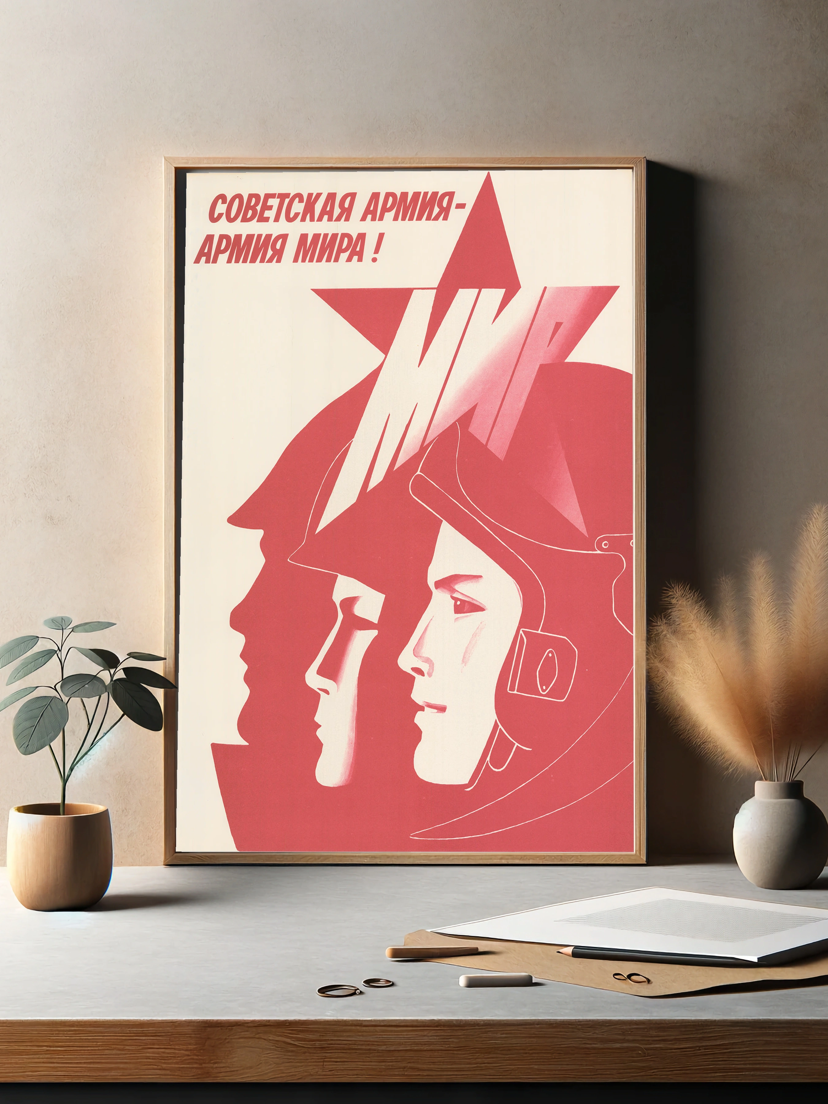 Декоративный плакат в минималистическом советском стиле с изображением трех лиц в профиль на фоне красной звезды. Основной текст «Советская армия — армия мира!» подчеркивает идею мира и силы. Идеально подходит как интерьерное искусство для гостиной или офиса, современная картина для стен с характерным красным акцентом.