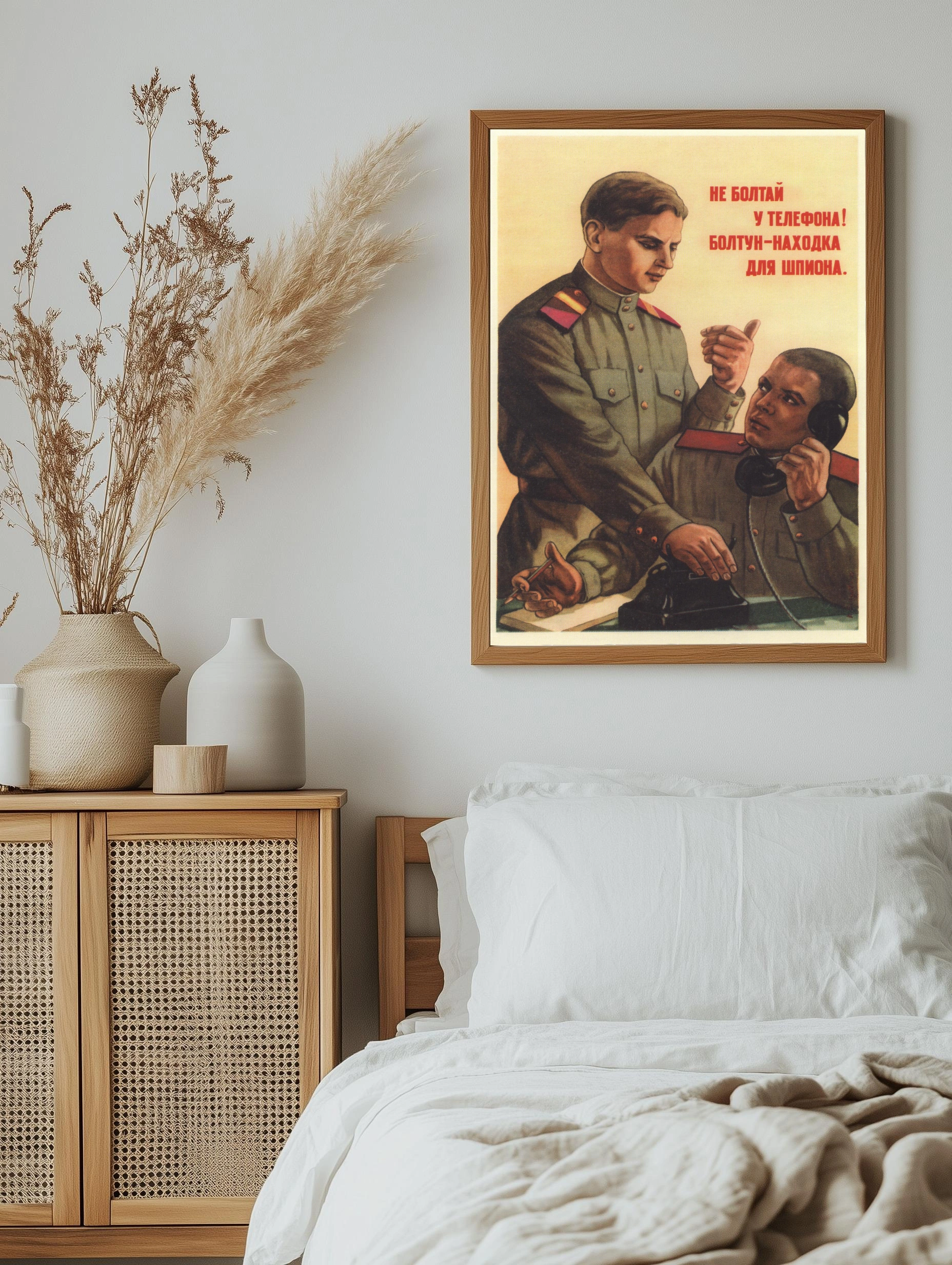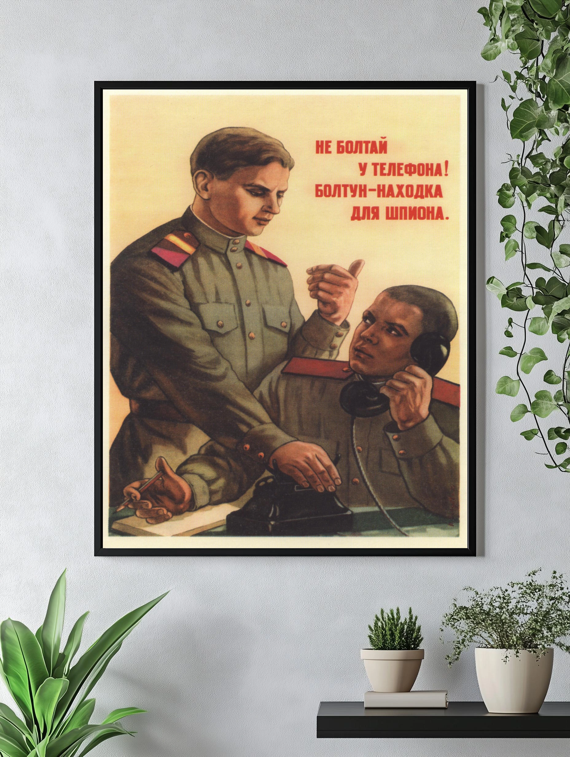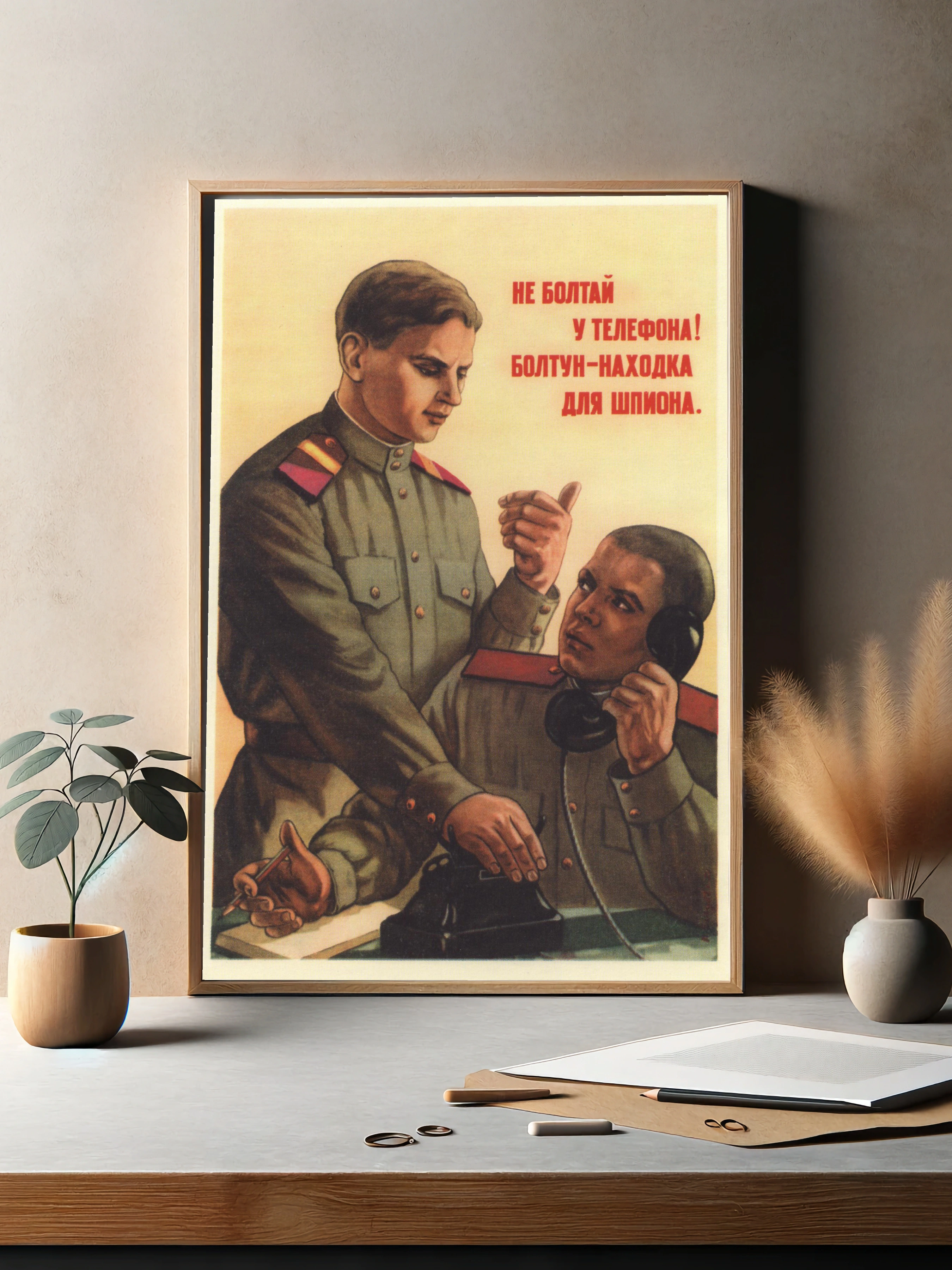 Советский агитационный плакат в классическом стиле изображает двух военных в форме, один из них держит старый телефон, второй с карандашом в руке и серьёзным выражением, призывающий не болтать у телефона, так как болтун – находка для шпиона. Постер выполнен в реалистичной манере с акцентом на бдительность и секретность, выражая дух советской эпохи. Подчёркнута важность осторожности в бытовых ситуациях как часть общей безопасности.