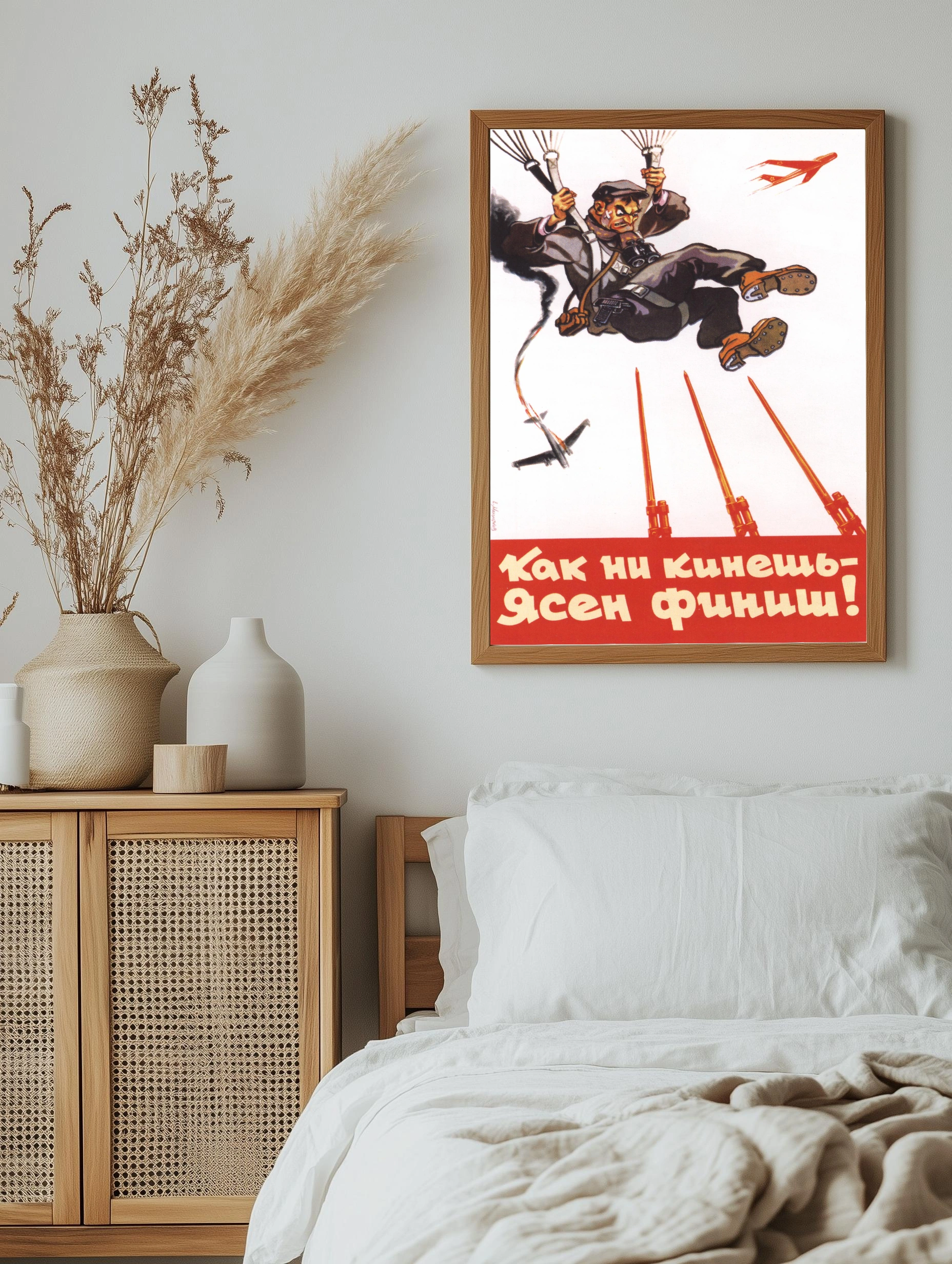 Этот интерьерный постер выполнен в стиле советской военной агитации, с ярко выраженным драматизмом и эмоциональным напряжением. На картине изображён солдат, который падает с парашютом в зоне огня противника. Доминируют цвета красный, чёрный и серый, подчеркивающие боевой настрой и жертвенность. Такой художественный плакат станет стильным декором стен, отлично подходящим для гостиной или офиса с тематикой военной истории или патриотизма.