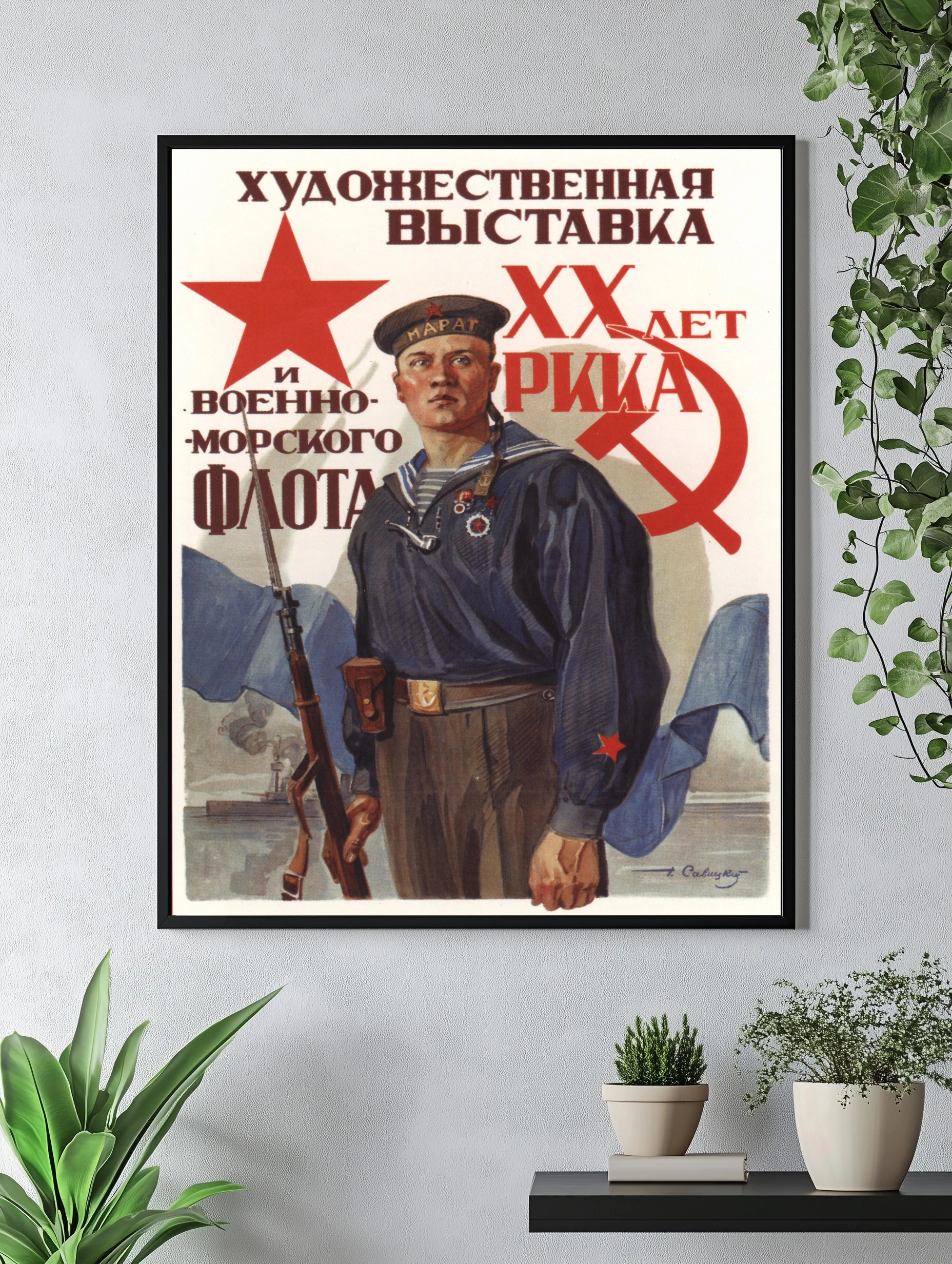Авторский интерьерный постер представляет советского матроса на фоне символики XX-летия Рабоче-Крестьянской Красной Армии (РККА). В композиции преобладают элементы военной темы: красная звезда, серп и молот, морской пейзаж и военная форма с оружием. Это художественное произведение для гостиной или офиса с уникальным стилем и историческим значением.