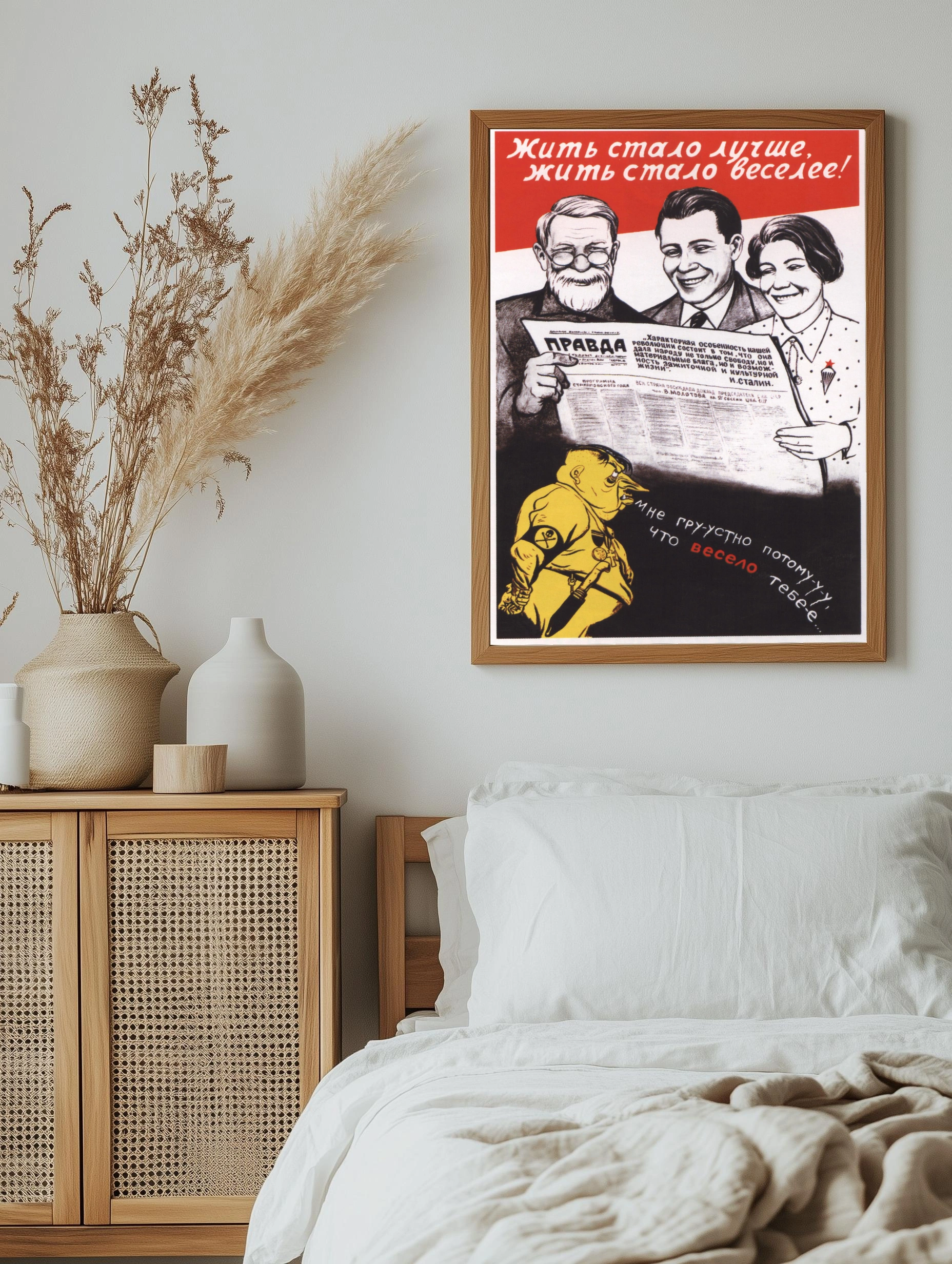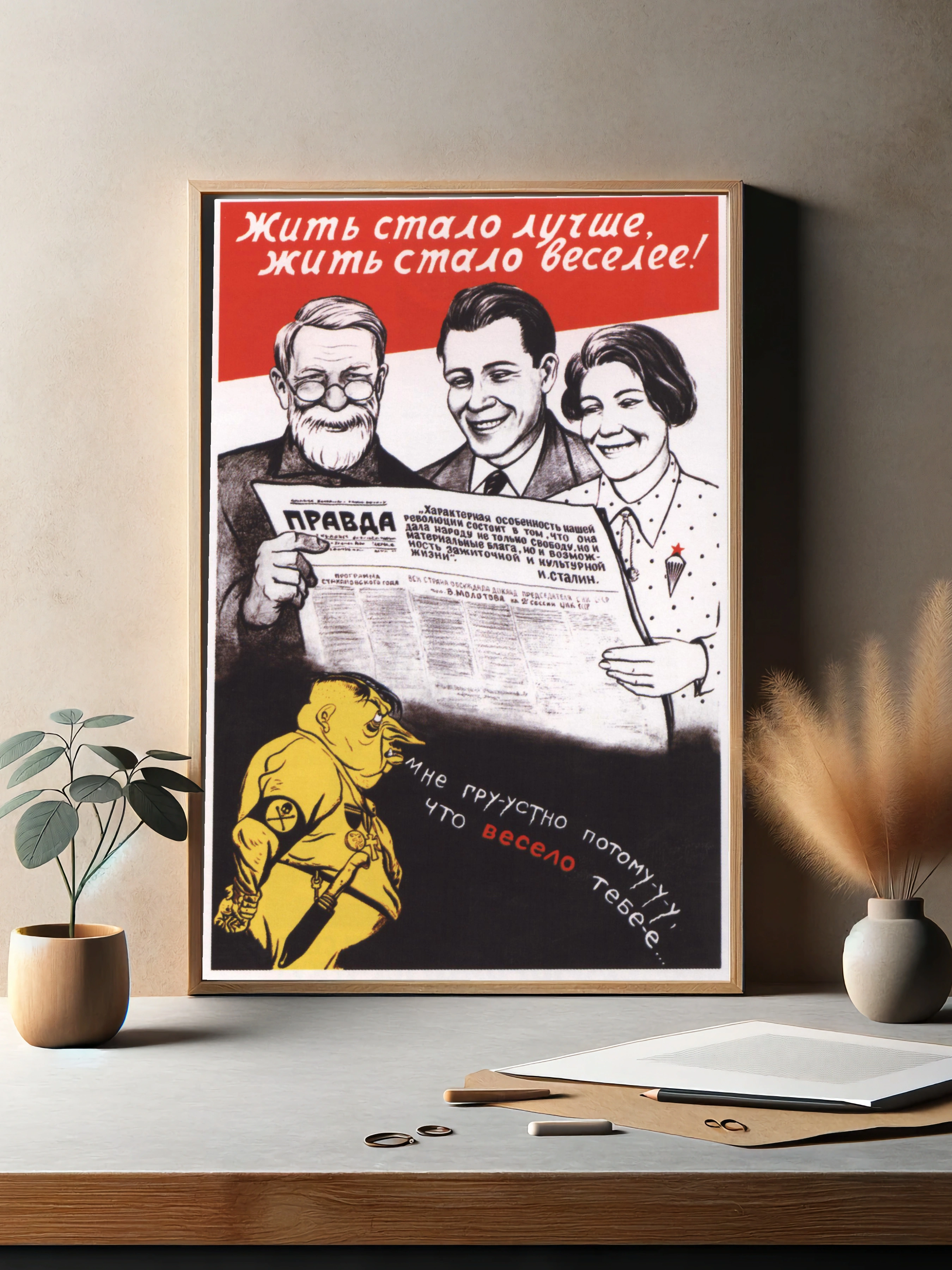Изображён советский пропагандистский плакат с негативным персонажем в жёлтом на нижнем фоне и позитивными улыбающимися людьми на белом фоне сверху. В центре — газета «Правда» и слова И. Сталина. Художественный плакат отражает идеологию и конфронтацию эпохи, подчёркивая оптимизм и критику двух разных мировоззрений. Это стильный декоративный плакат для интерьера, современное искусство для стен, подходящее для декора гостиной или офиса.