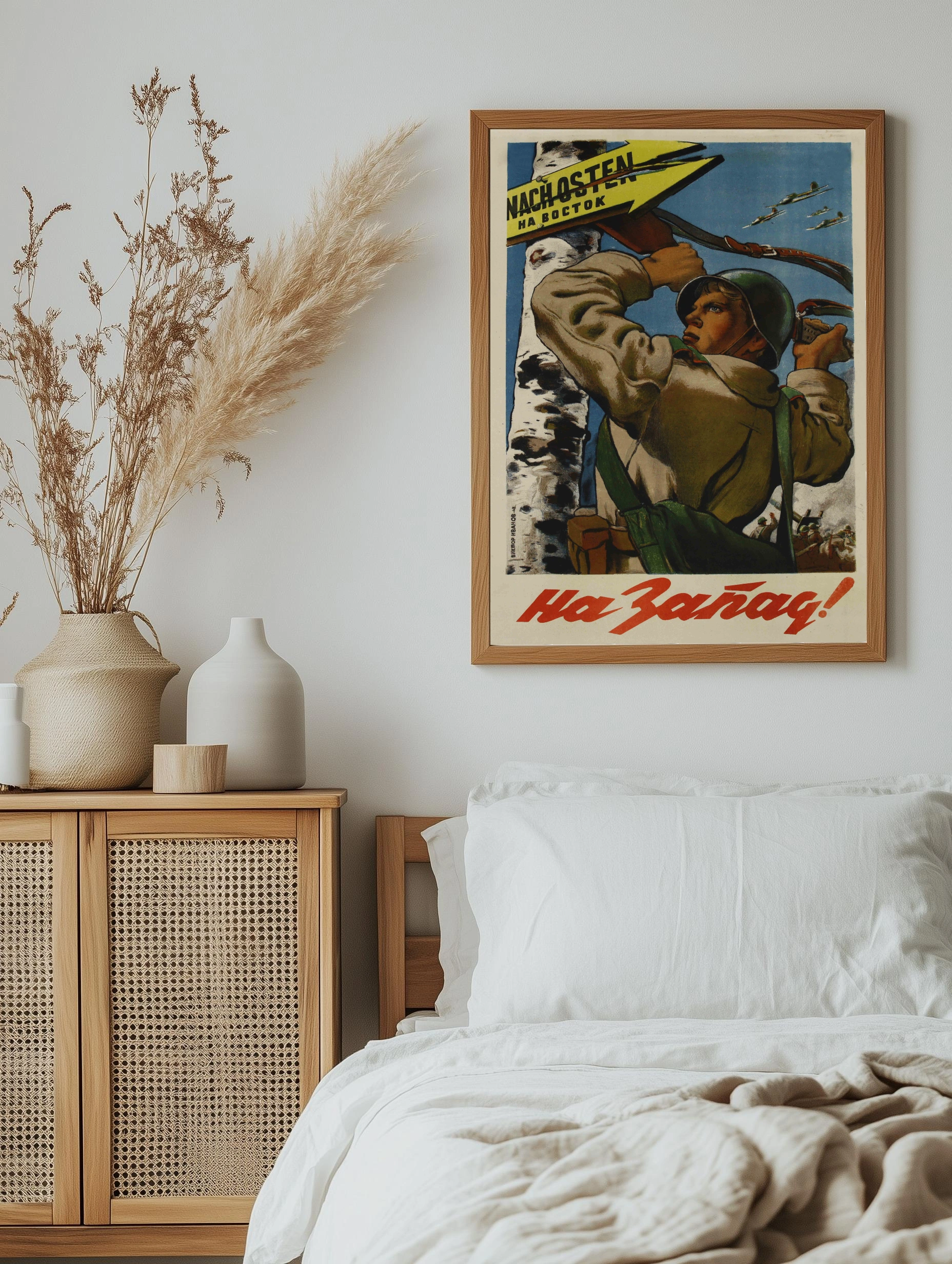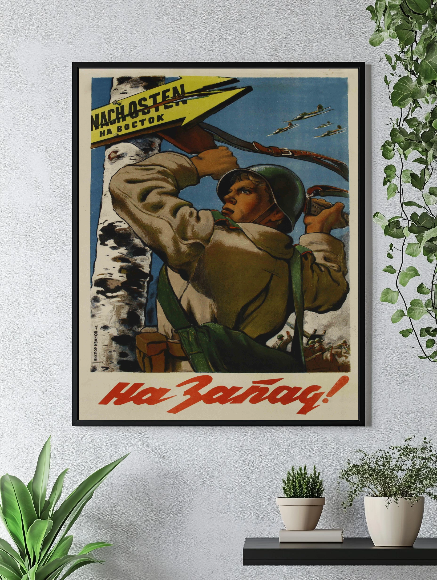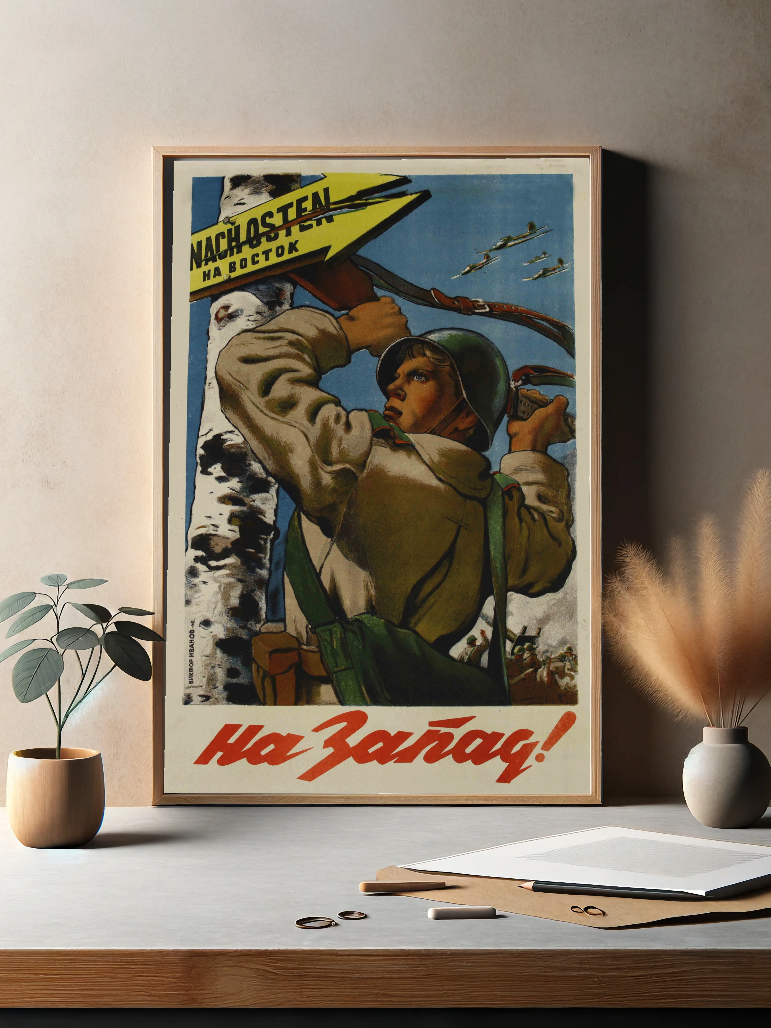 Интерьерное искусство в виде советского агитационного плаката с изображением солдата в каске, держащего винтовку на фоне голубого неба с летящими военными самолетами. Яркий и выразительный художественный стиль с акцентом на патриотизм и готовность к бою. Отличный вариант декоративного плаката для дома или офиса в военной тематике.