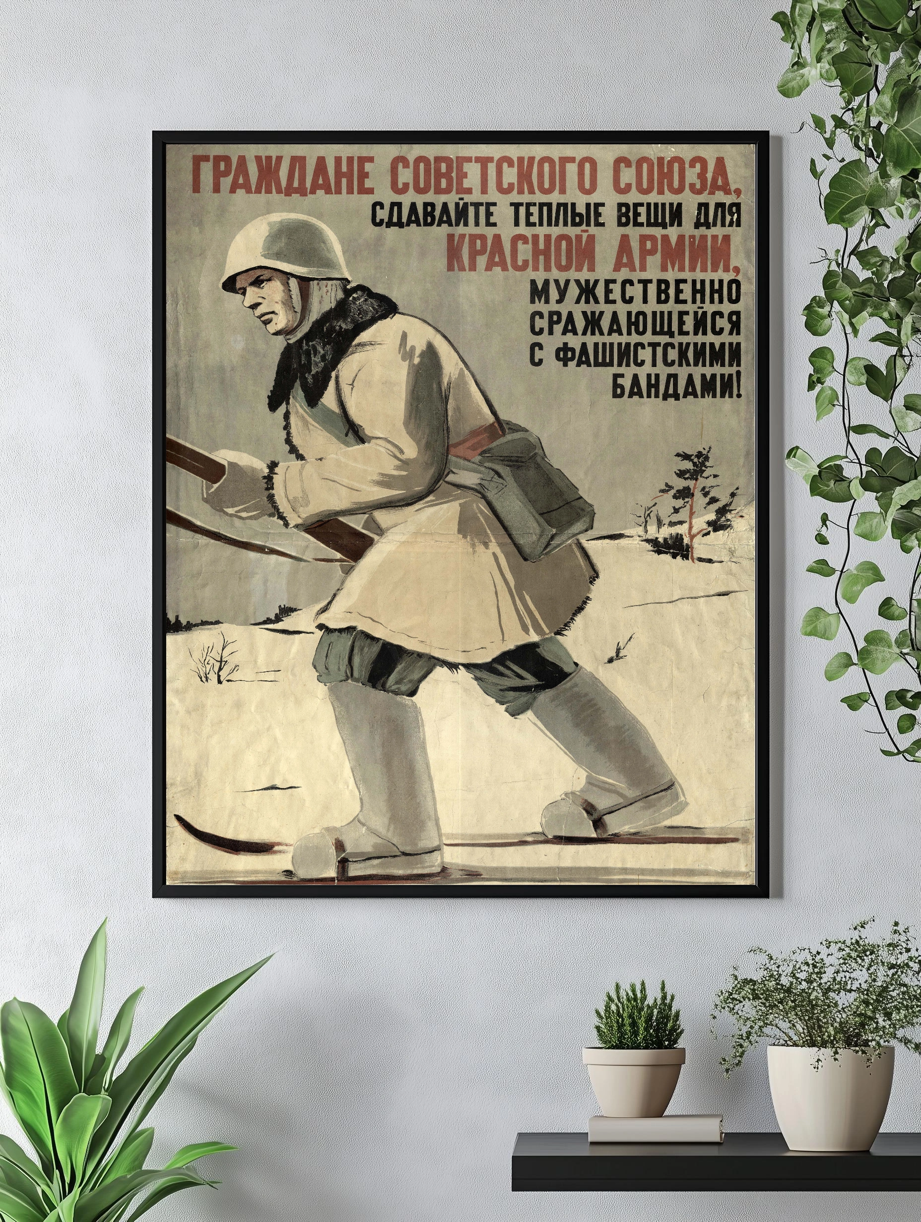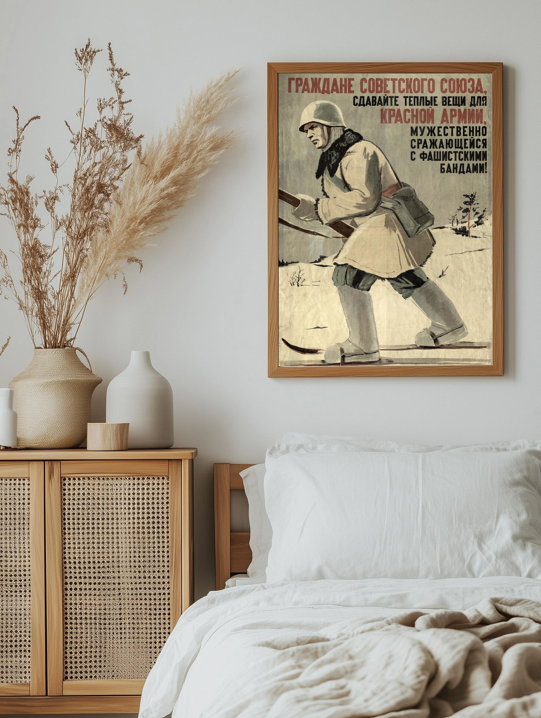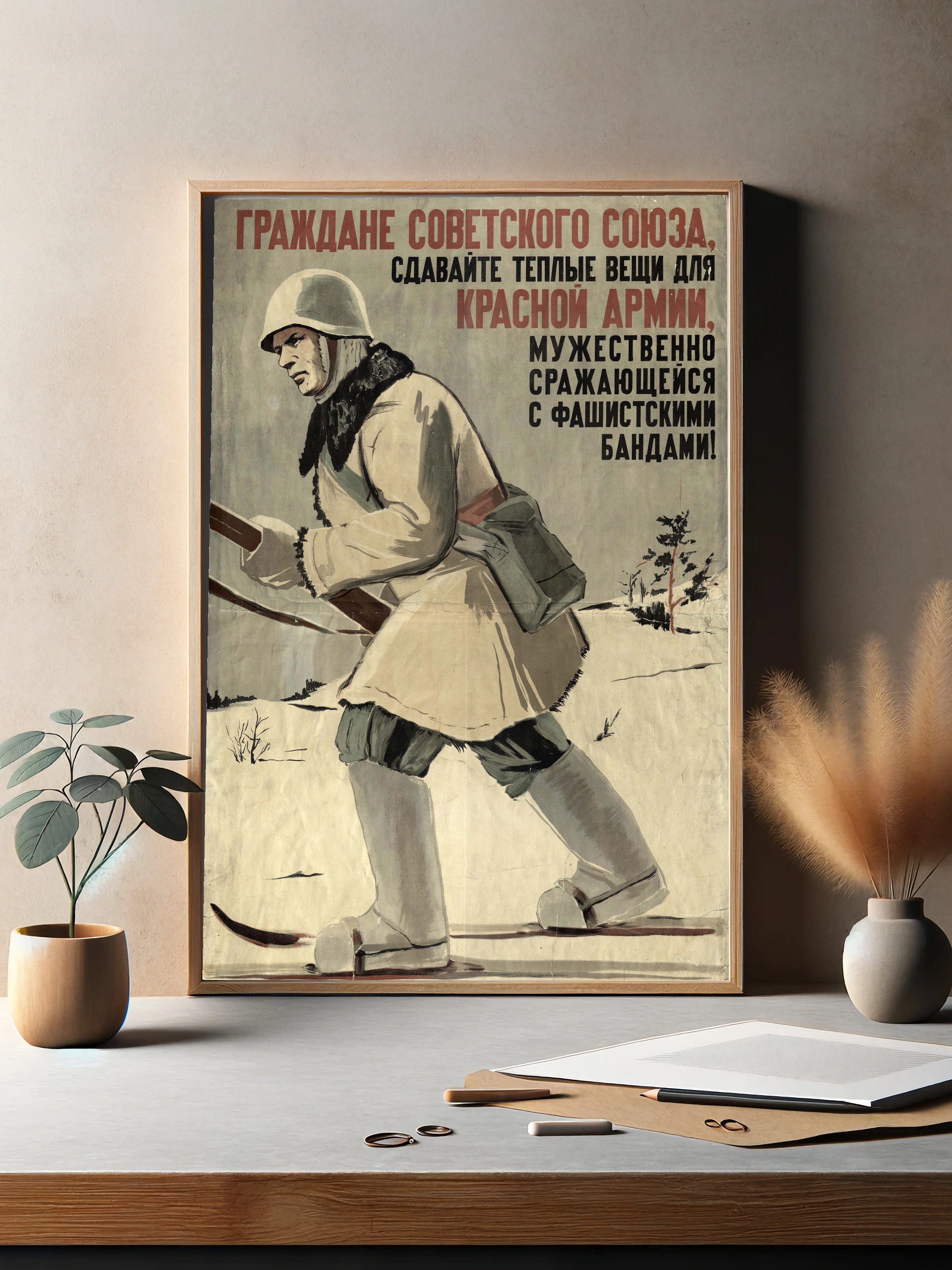 Декоративный плакат в стиле советской пропаганды изображает солдата в зимнем камуфляже с лыжами, готового к бою в суровых условиях. Плакат выполнен в приглушенных тёплых и серых тонах с акцентом на мужество и патриотизм. Это интерьерный постер для создания атмосферы истории и силы.
