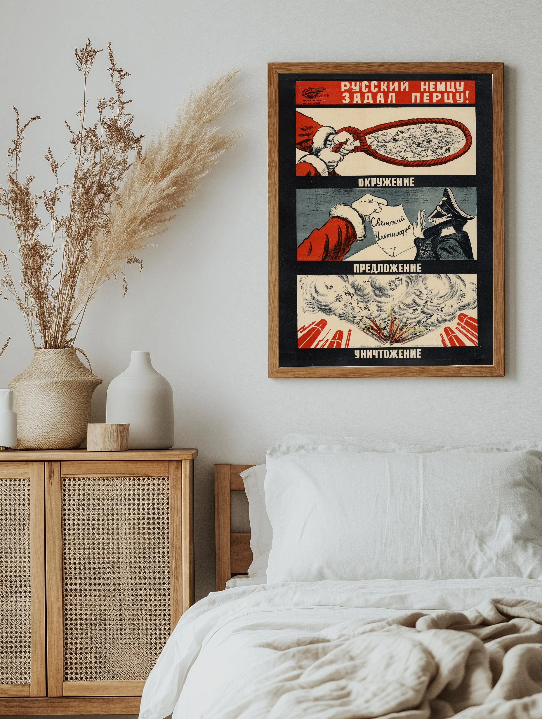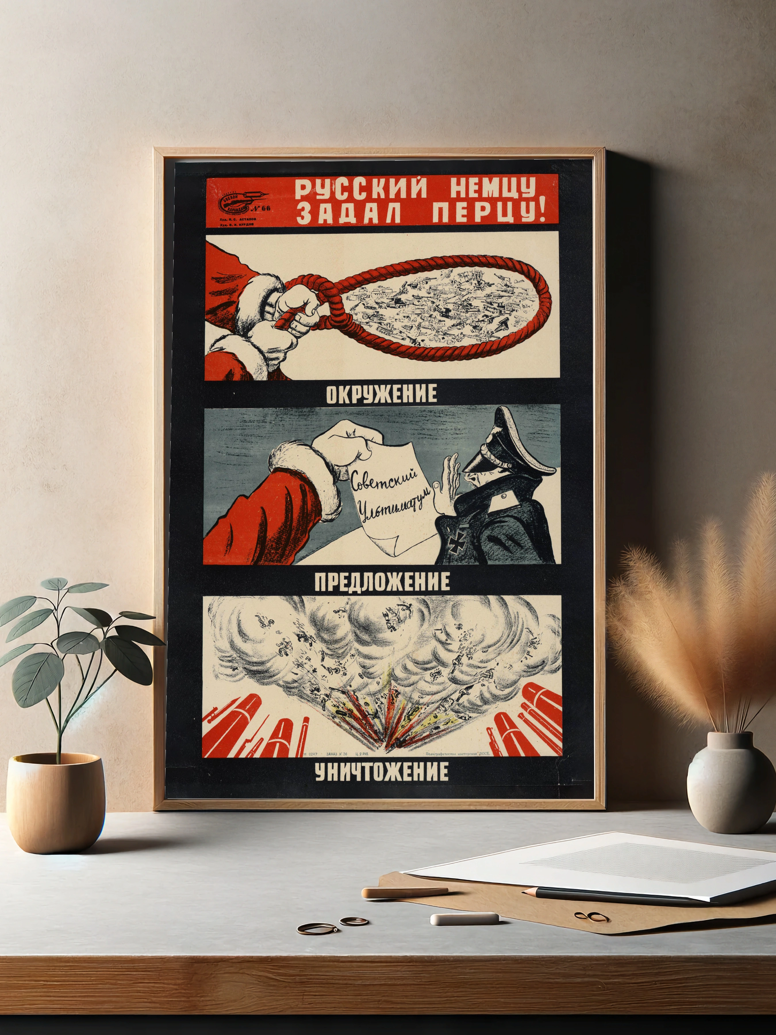 Советский агитационный военный плакат времен Великой Отечественной войны с ярким патриотическим посылом. Вырисованы ключевые этапы окружения и уничтожения врага: красная рука с лассо, советский ультиматум и стремительное уничтожение вражеской техники. Стиль плаката строгий, пропагандистский, цвета — красный, бежевый и черный. Декоративный плакат для интерьера, подчеркивающий мощь и единство.