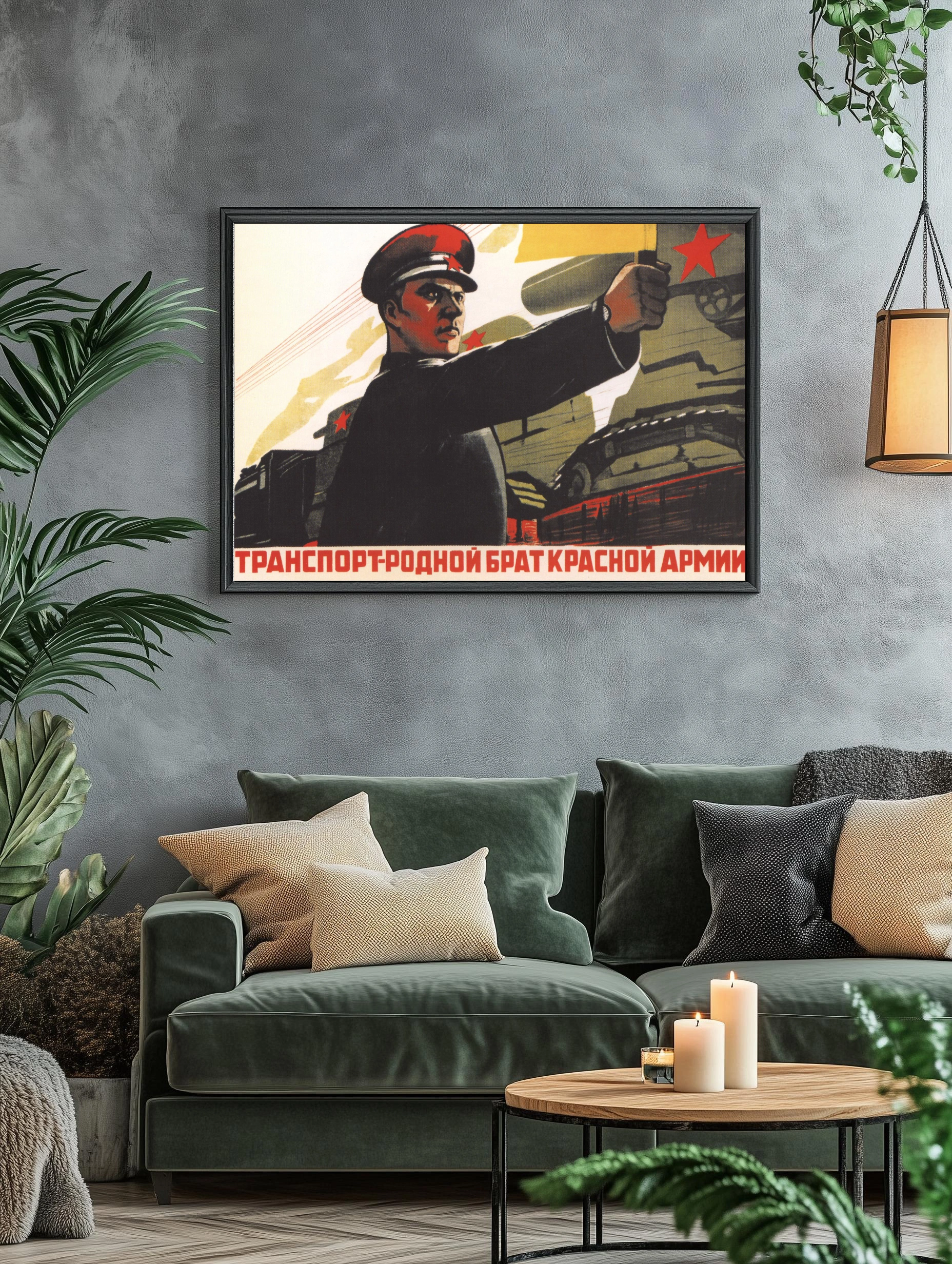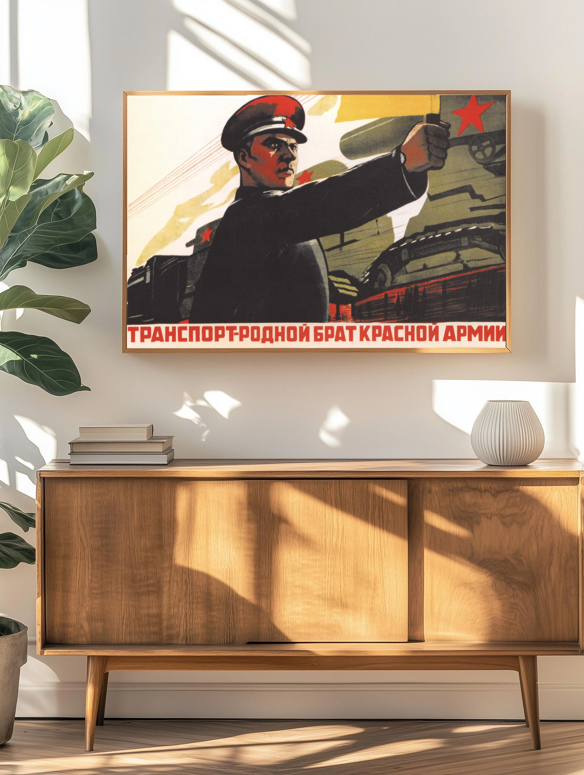 Советский пропагандистский плакат с изображением солдата Красной армии в форме, держащего флаг на фоне танков и военной техники. Картина выполнена в стиле соцреализма с акцентом на патриотизм, силу и единство армии. Красные звезды и надпись подчёркивают важность транспорта для победы.