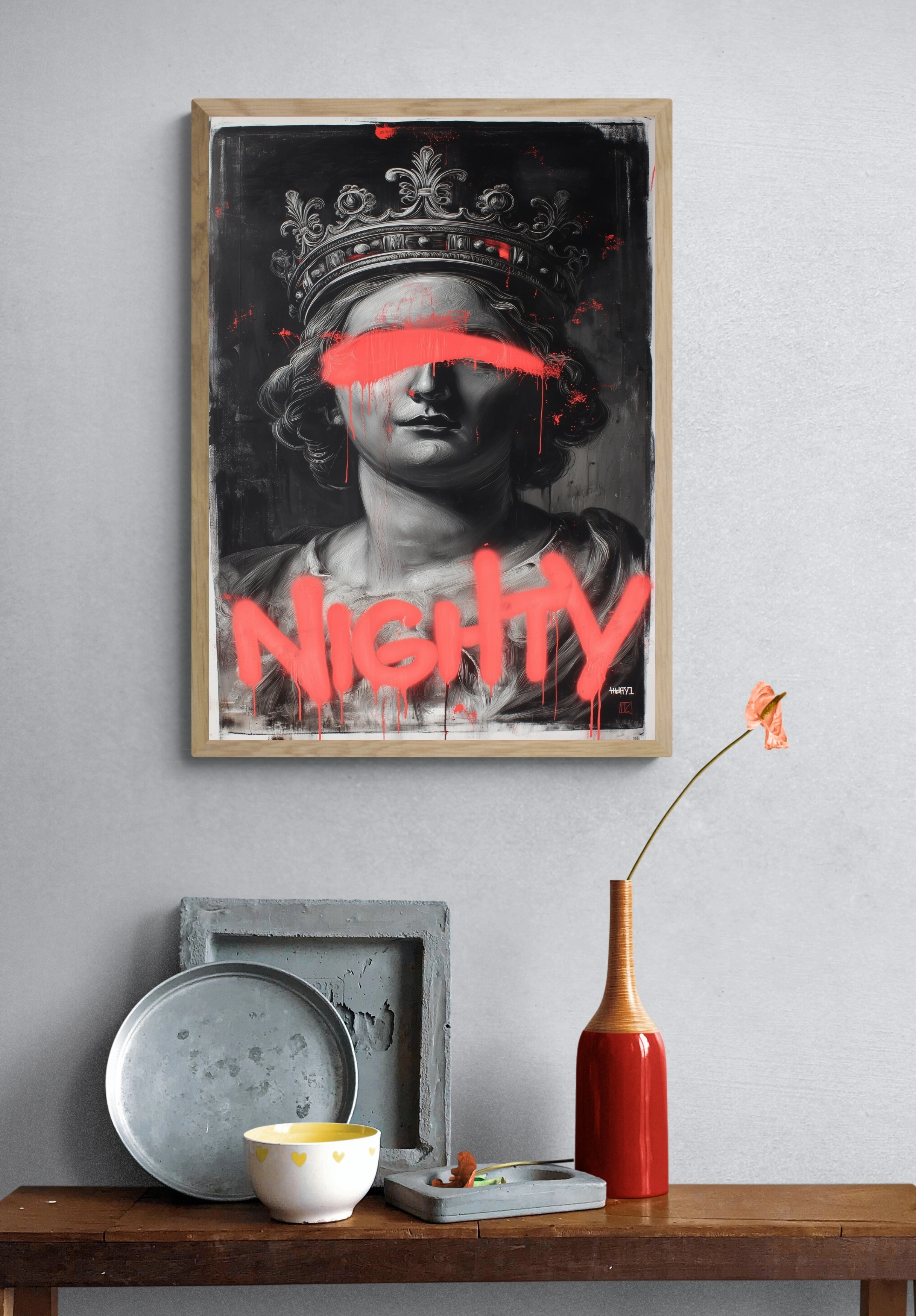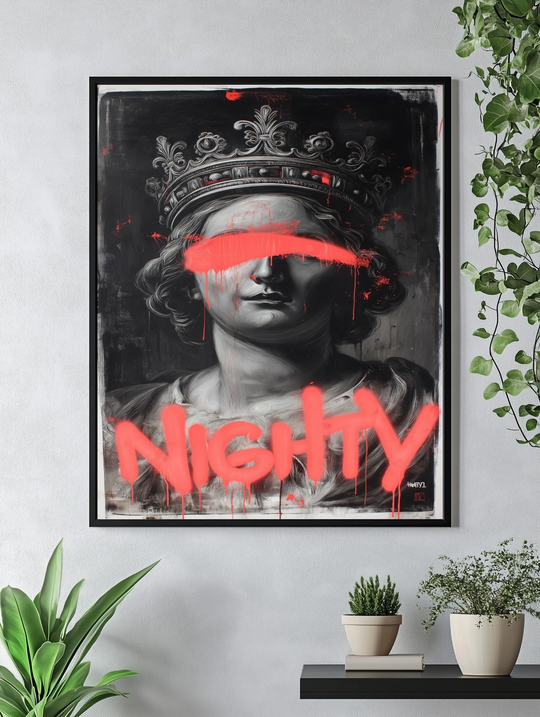 Этот постер представляет собой уникальное сочетание классического искусства и современного граффити. На черном фоне изображена статуя с короной, чье лицо частично скрыто яркой розовой краской, создающей эффект загадочности. Слово ‘NIGHTY’ написано крупными, выразительными буквами, что добавляет динамики и контраста к спокойному образу. Цветовая гамма включает глубокие черные и яркие розовые оттенки, что создает эффектный визуальный контраст. Стиль работы можно охарактеризовать как современный поп-арт, который вызывает эмоции и провоцирует размышления. Этот постер станет отличным акцентом в интерьере гостиной, спальни или креативного пространства, привнося в атмосферу нотки дерзости и оригинальности. Идеально подходит для молодежной аудитории и тех, кто ценит уникальные художественные решения.