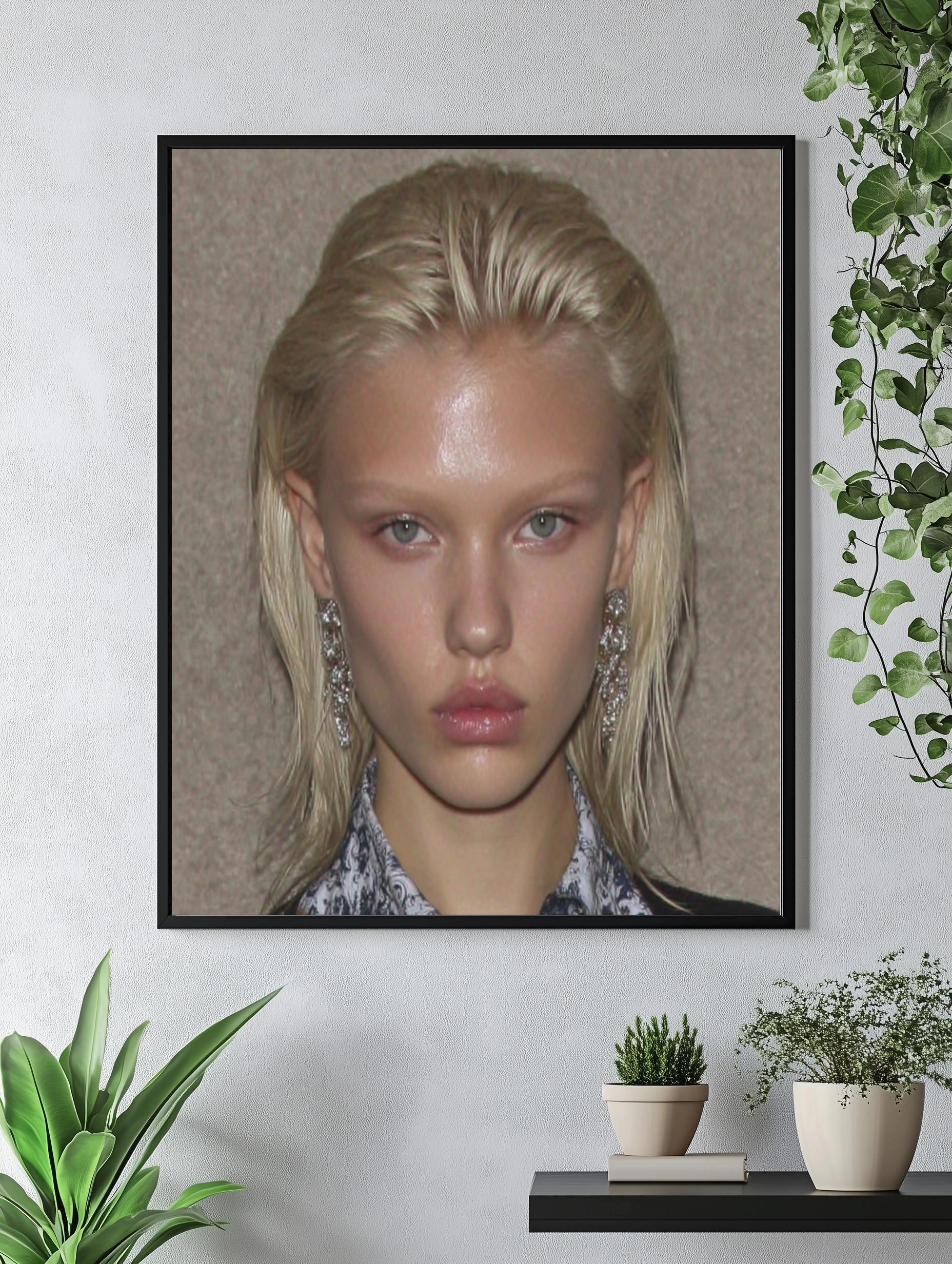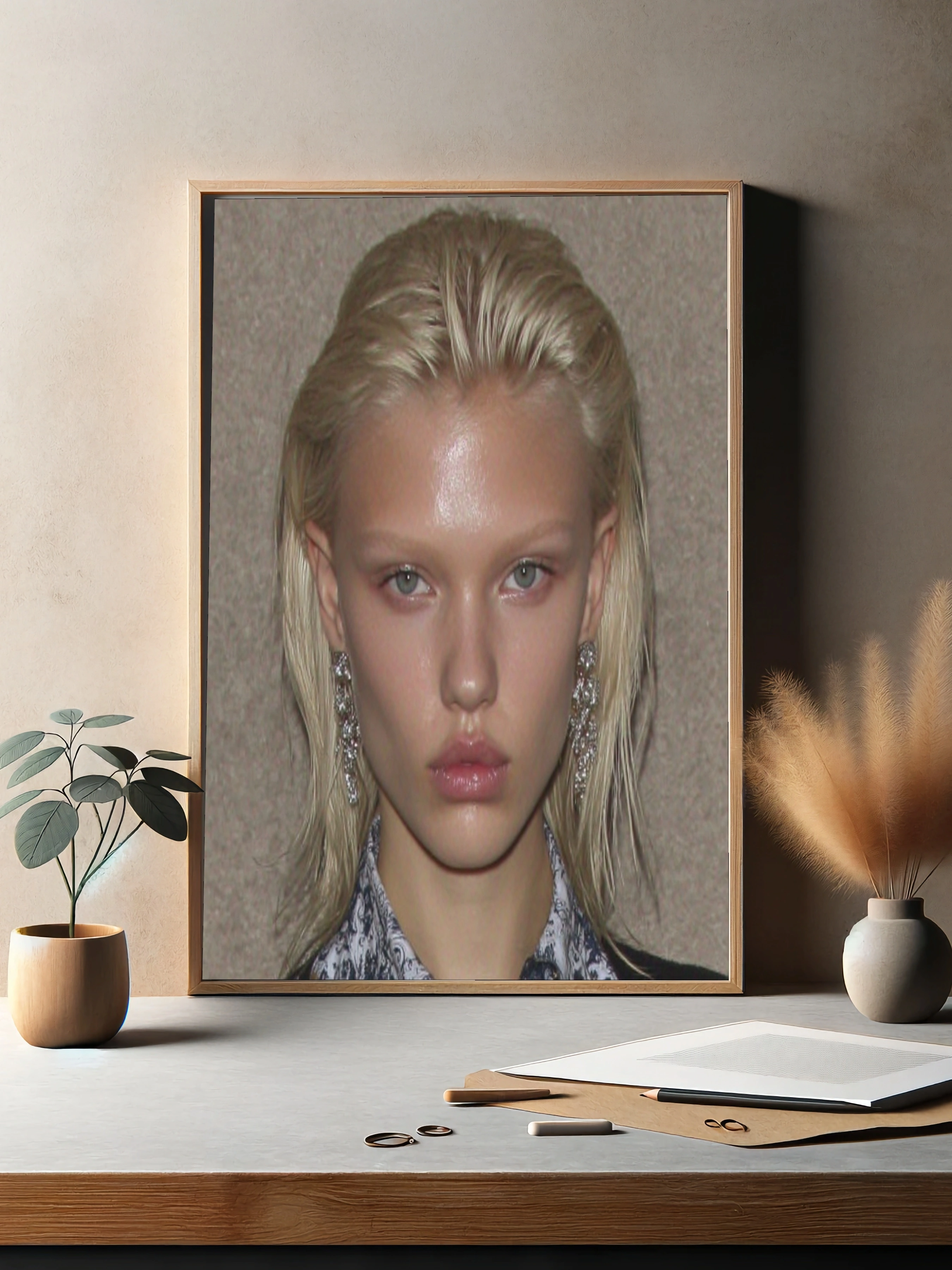 Этот постер представляет собой захватывающий портрет молодой женщины с короткими светлыми волосами, аккуратно уложенными назад. Ее выразительные серые глаза и естественный макияж создают атмосферу уверенности и загадочности. На ней крупные блестящие серьги, которые добавляют изысканности и стиля. Фон выполнен в нейтральных бежевых тонах, что подчеркивает яркость главного объекта. Портрет выполнен в современном минималистичном стиле, создавая ощущение чистоты и элегантности. Этот постер идеально впишется в интерьер гостиной, спальни или офиса, добавляя нотку современности и утонченности. Он привлечет внимание молодежи и креативщиков, ценящих стиль и оригинальность.