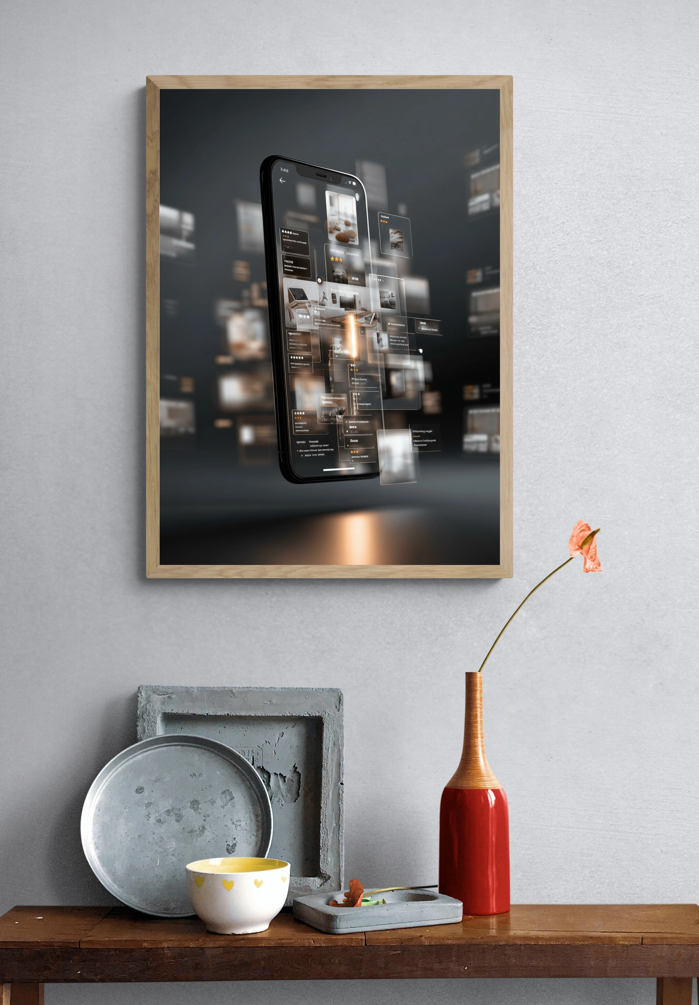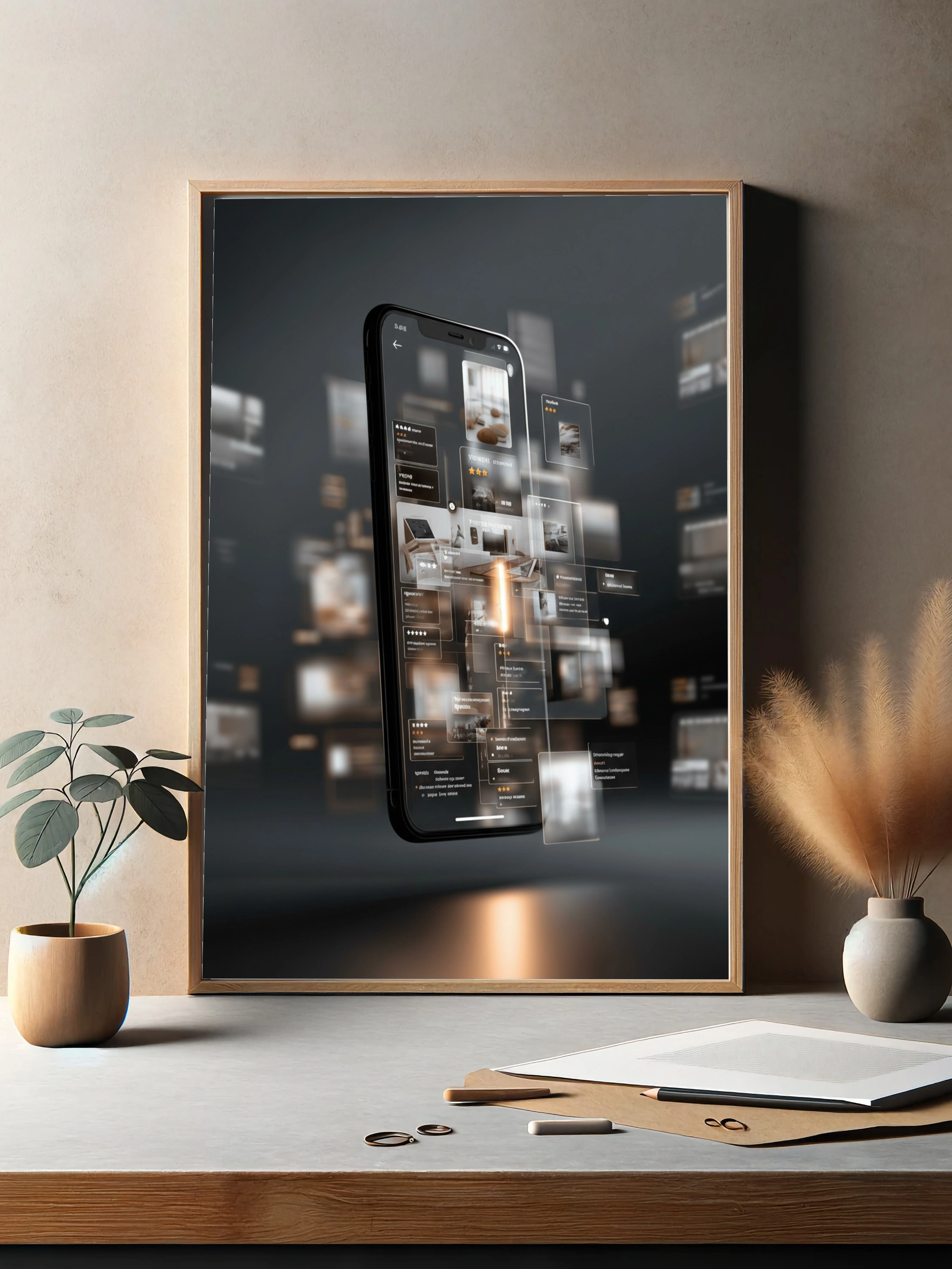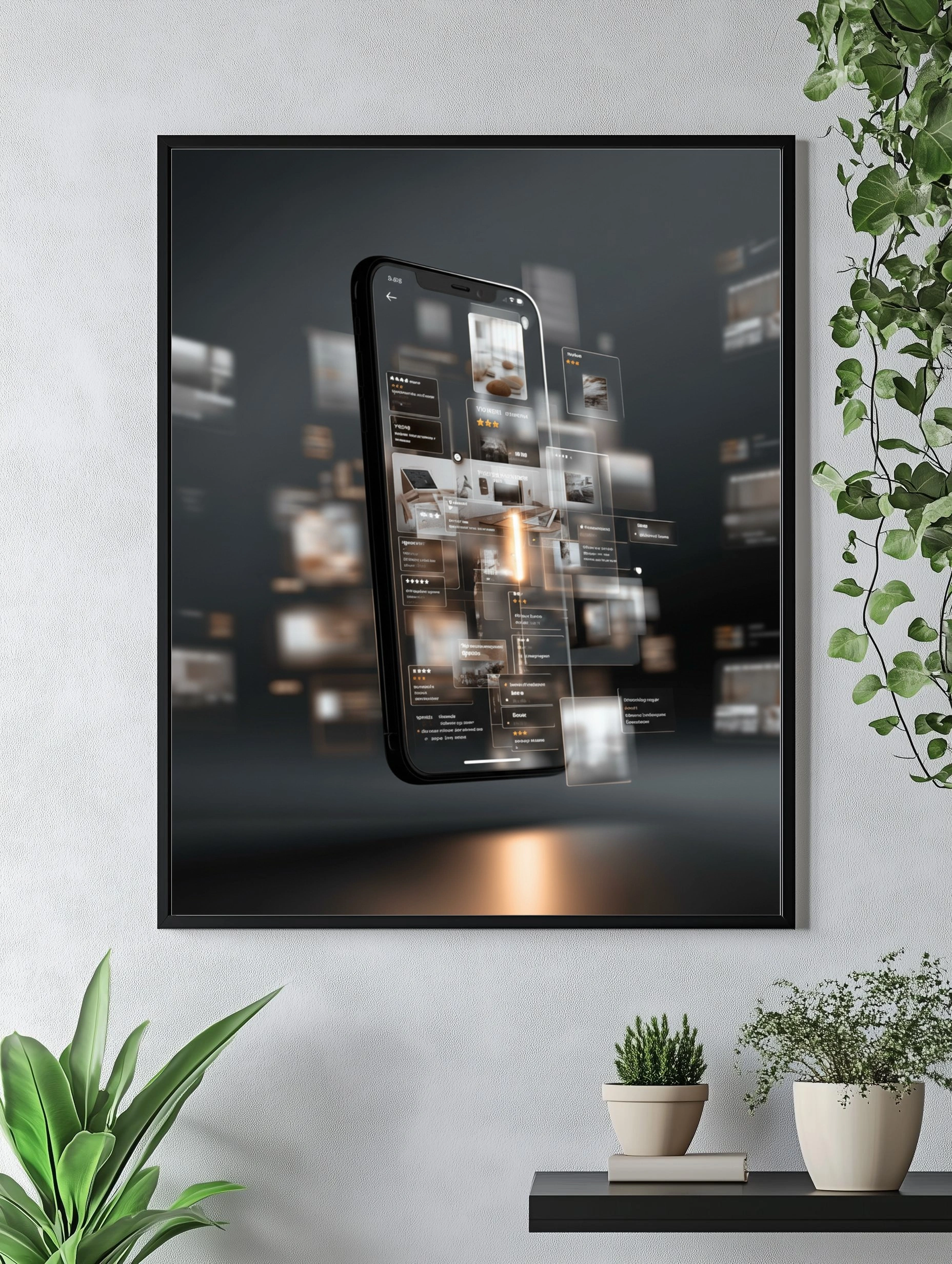 Погрузитесь в мир технологий с этим стильным постером, изображающим современный смартфон, окруженный всплывающими окнами с отзывами и рейтингами. На переднем плане — элегантный черный телефон, на экране которого отображаются фотографии интерьеров и оценки пользователей. Вокруг него парят прозрачные карточки с текстами и звёздными рейтингами, создавая эффект динамики и взаимодействия. Цветовая гамма включает глубокие черные и серые оттенки, с яркими акцентами оранжевого и белого, что придаёт изображению современный и технологичный вид. Этот постер идеально впишется в офисное пространство, креативные студии или современные гостиные, добавляя нотку стиля и вдохновения. Он привлечет внимание молодежи и профессионалов, ценящих инновации и эстетику.