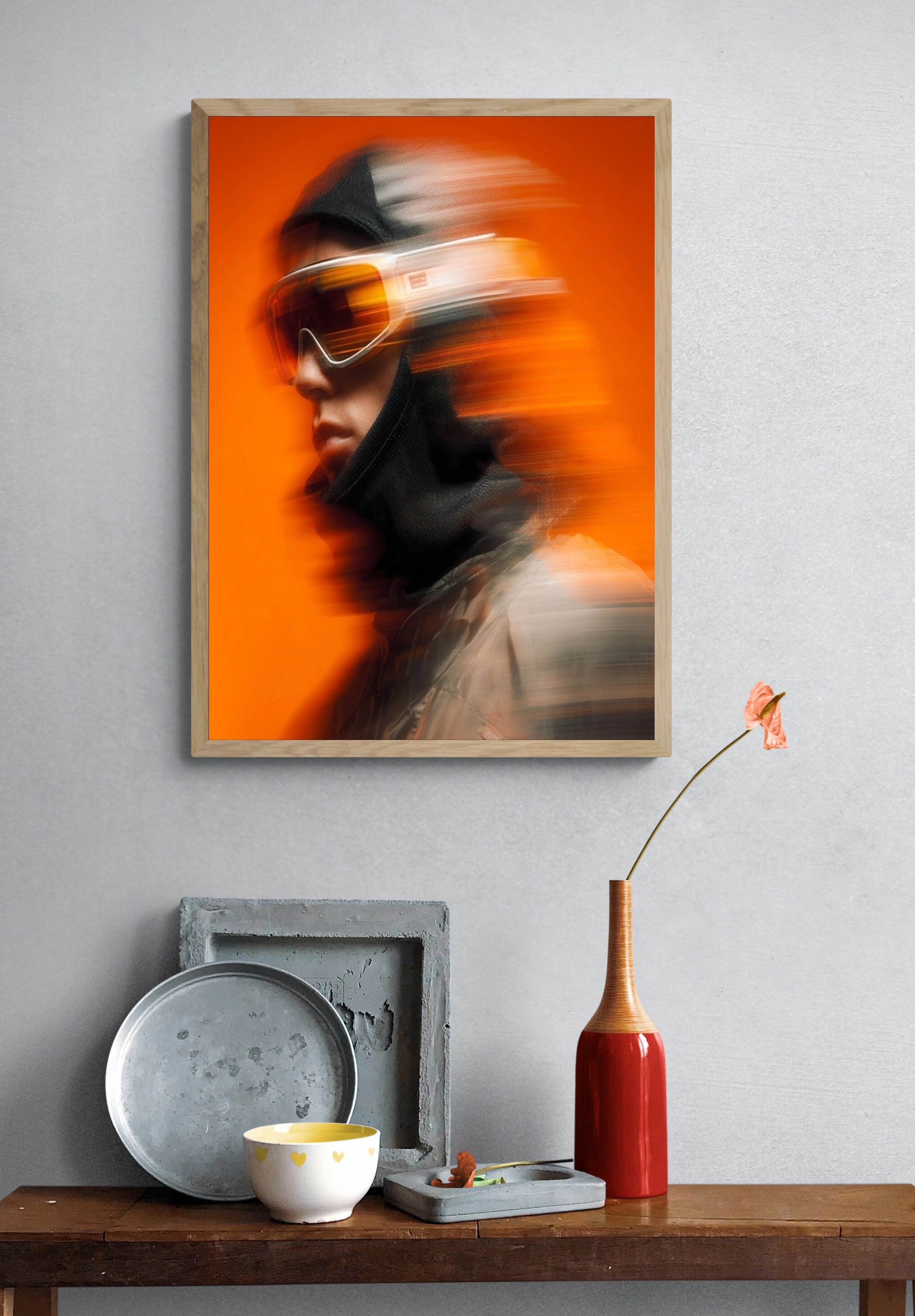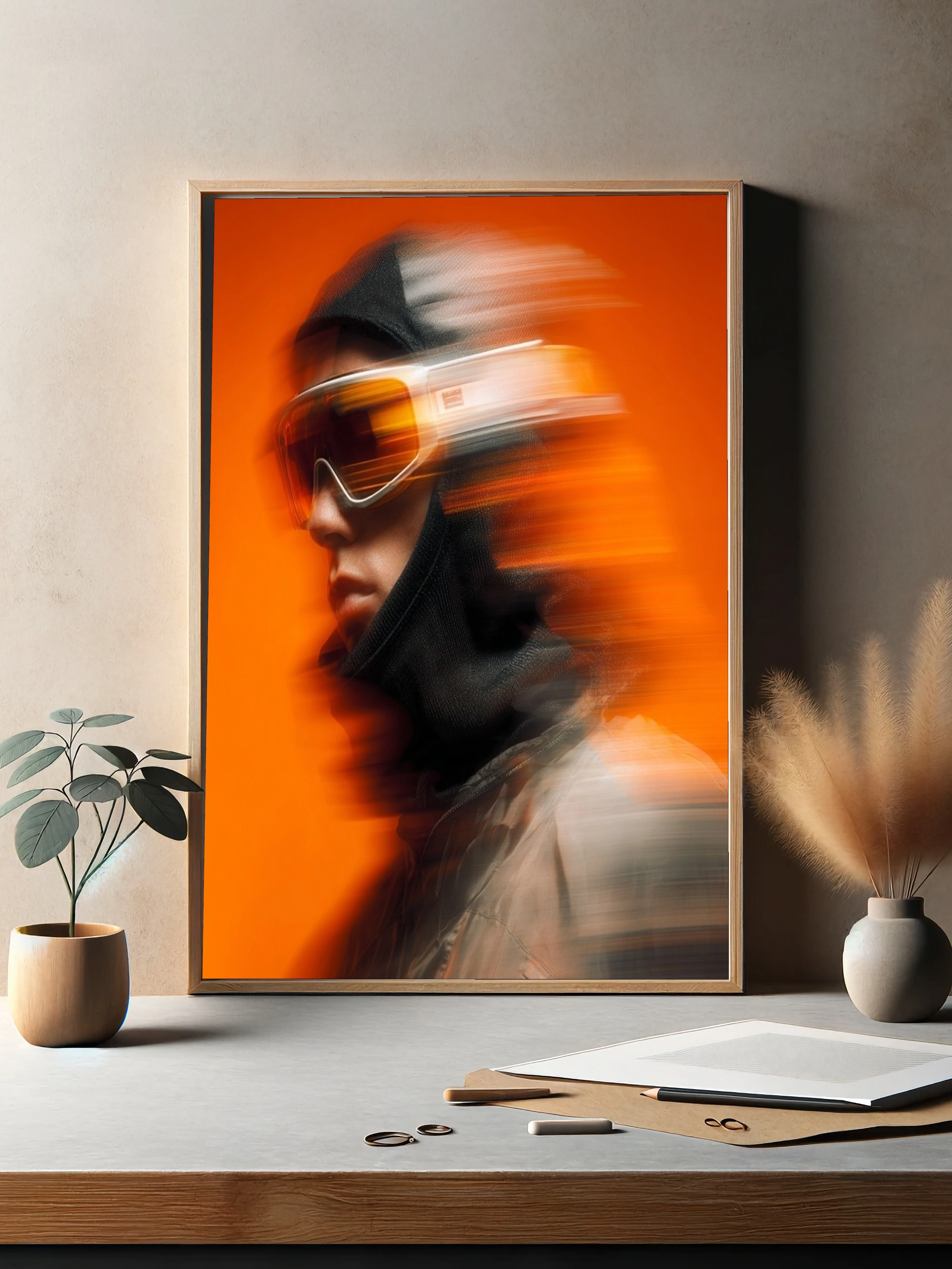 Погрузитесь в мир динамики и адреналина с этим постером, изображающим сноубордиста в стильной экипировке. На переднем плане — лицо спортсмена, защищенное от холода черным капюшоном и яркими защитными очками с оранжевыми линзами. Энергия движения передана благодаря эффекту размытия, создающему ощущение скорости и свободы. Фон выполнен в насыщенном оранжевом цвете, который подчеркивает яркость и смелость образа. Стиль изображения — современный, с элементами поп-арта, что придает ему уникальность и привлекательность. Этот постер станет идеальным акцентом в интерьере молодежной комнаты, офиса или спортивного клуба, вдохновляя на новые достижения. Целевая аудитория — активные молодые люди и любители зимних видов спорта, стремящиеся к ярким эмоциям и приключениям.
