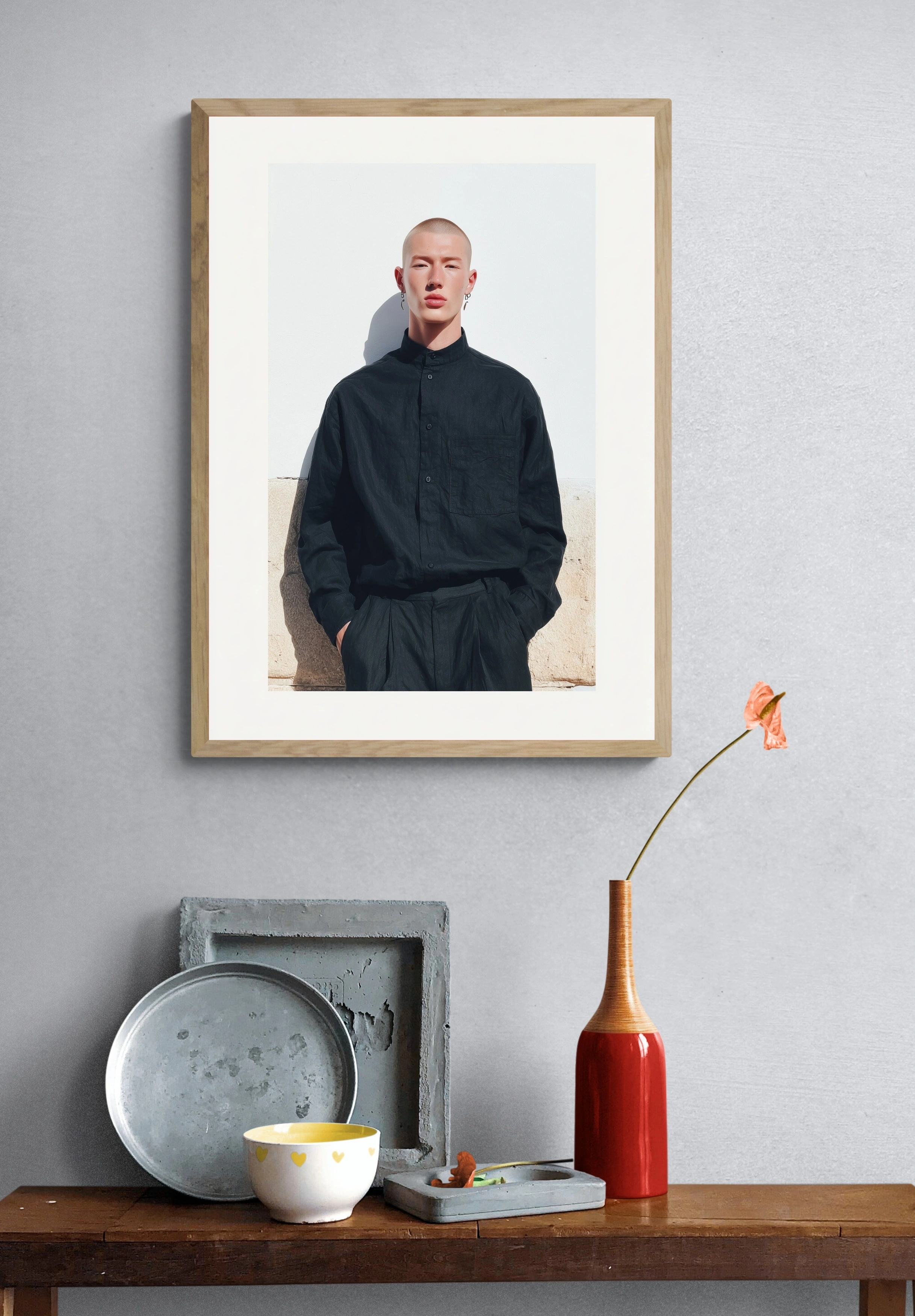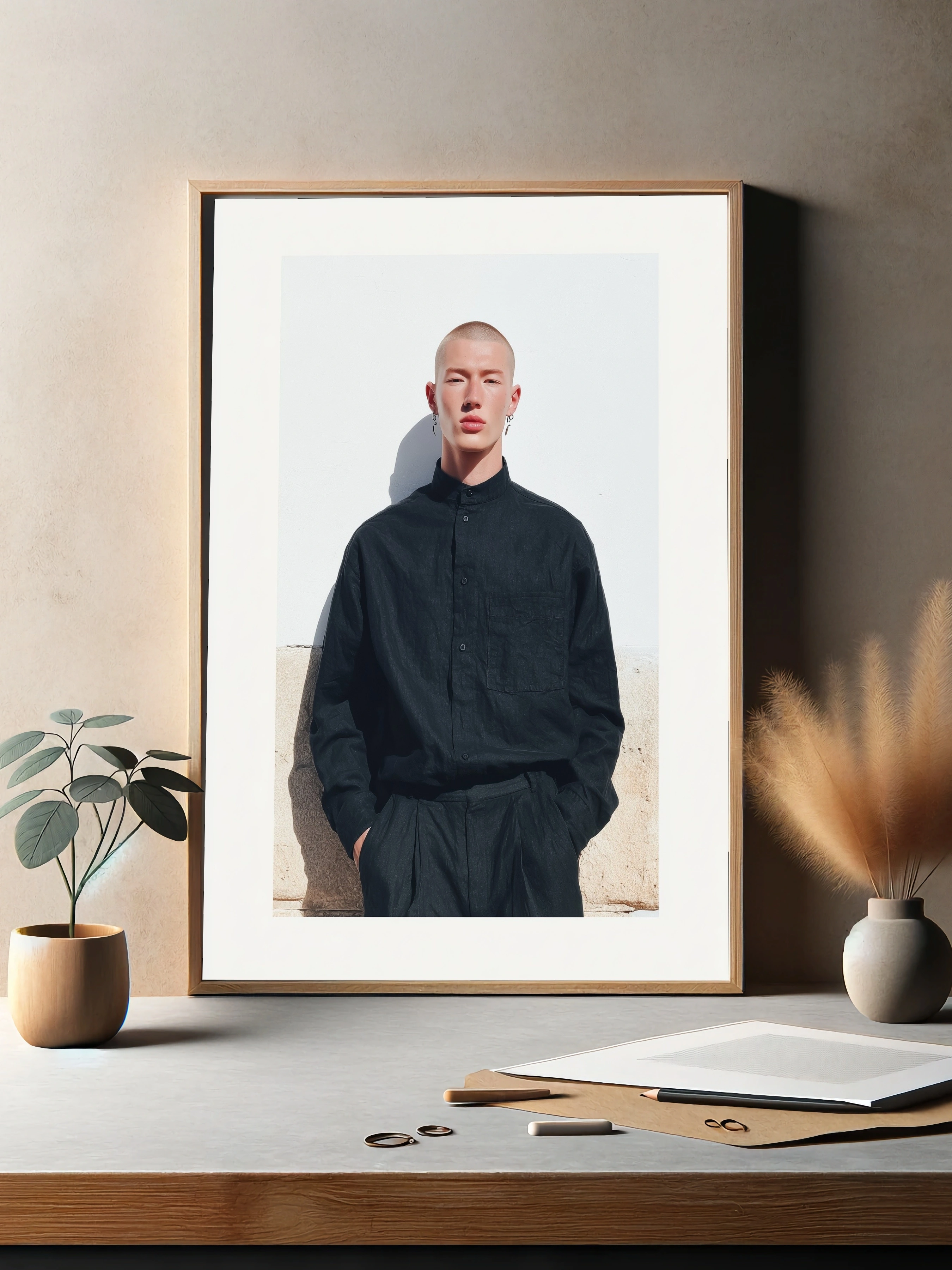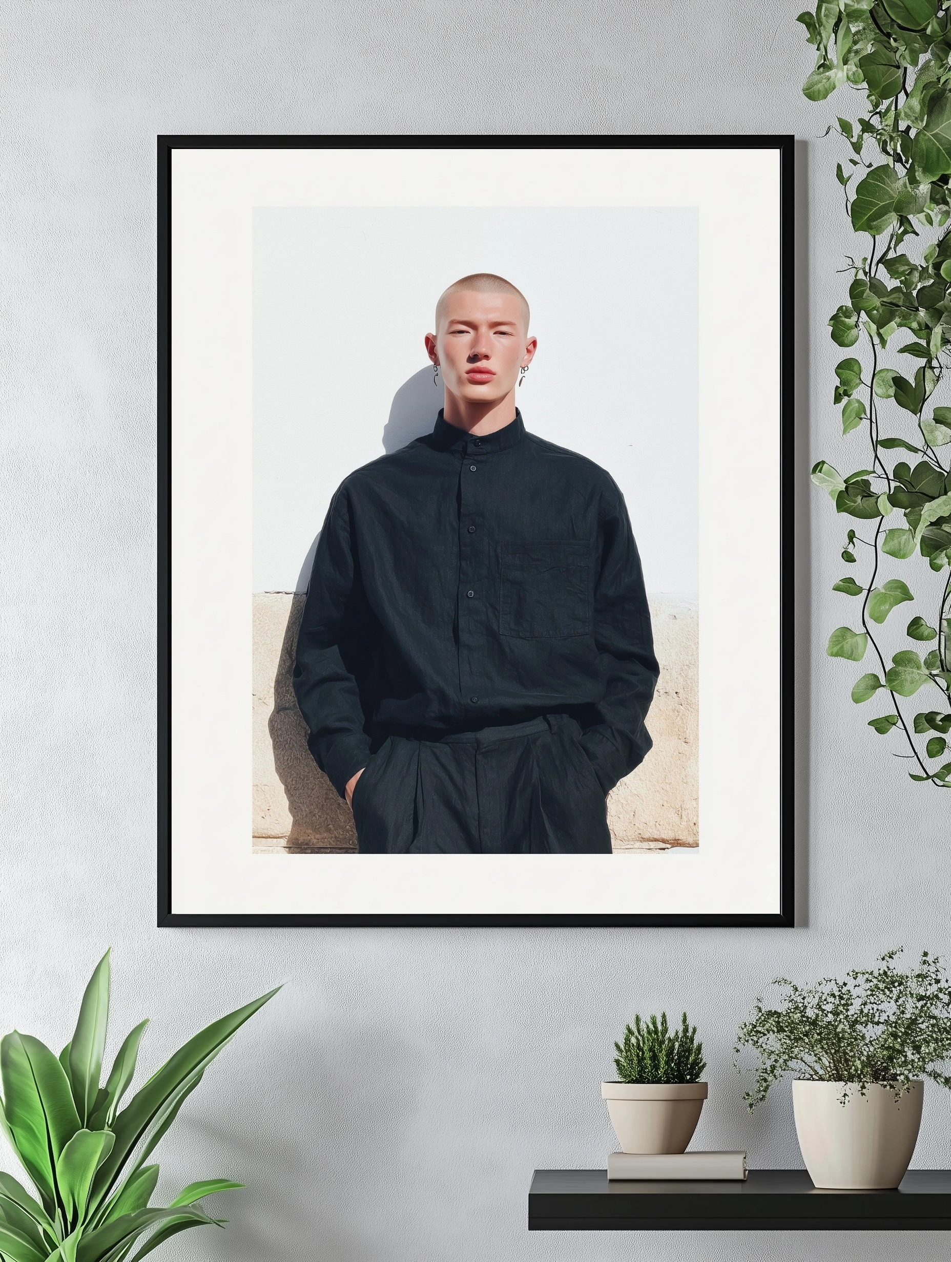 Этот постер представляет собой стильный портрет молодого человека, одетого в черную рубашку и брюки, выполненные из легкой ткани. Его уверенный взгляд и минималистичный стиль создают атмосферу современности и элегантности. Фон выполнен в чистом белом цвете, что подчеркивает контраст черной одежды и выделяет модель на переднем плане. Легкие тени добавляют глубину изображению, а детали, такие как серьги, придают образу индивидуальность. Этот постер станет отличным акцентом в интерьере, добавляя нотки стиля и современности в любую комнату.