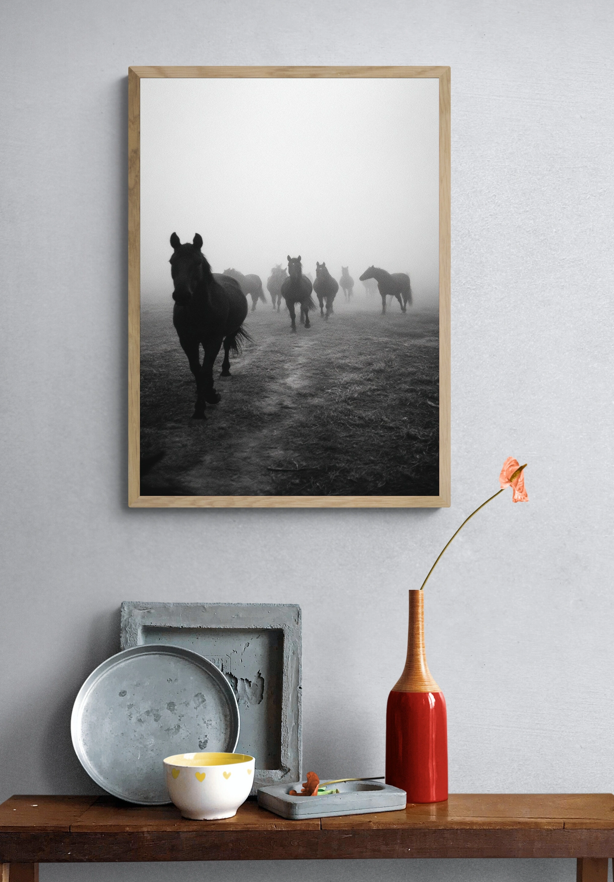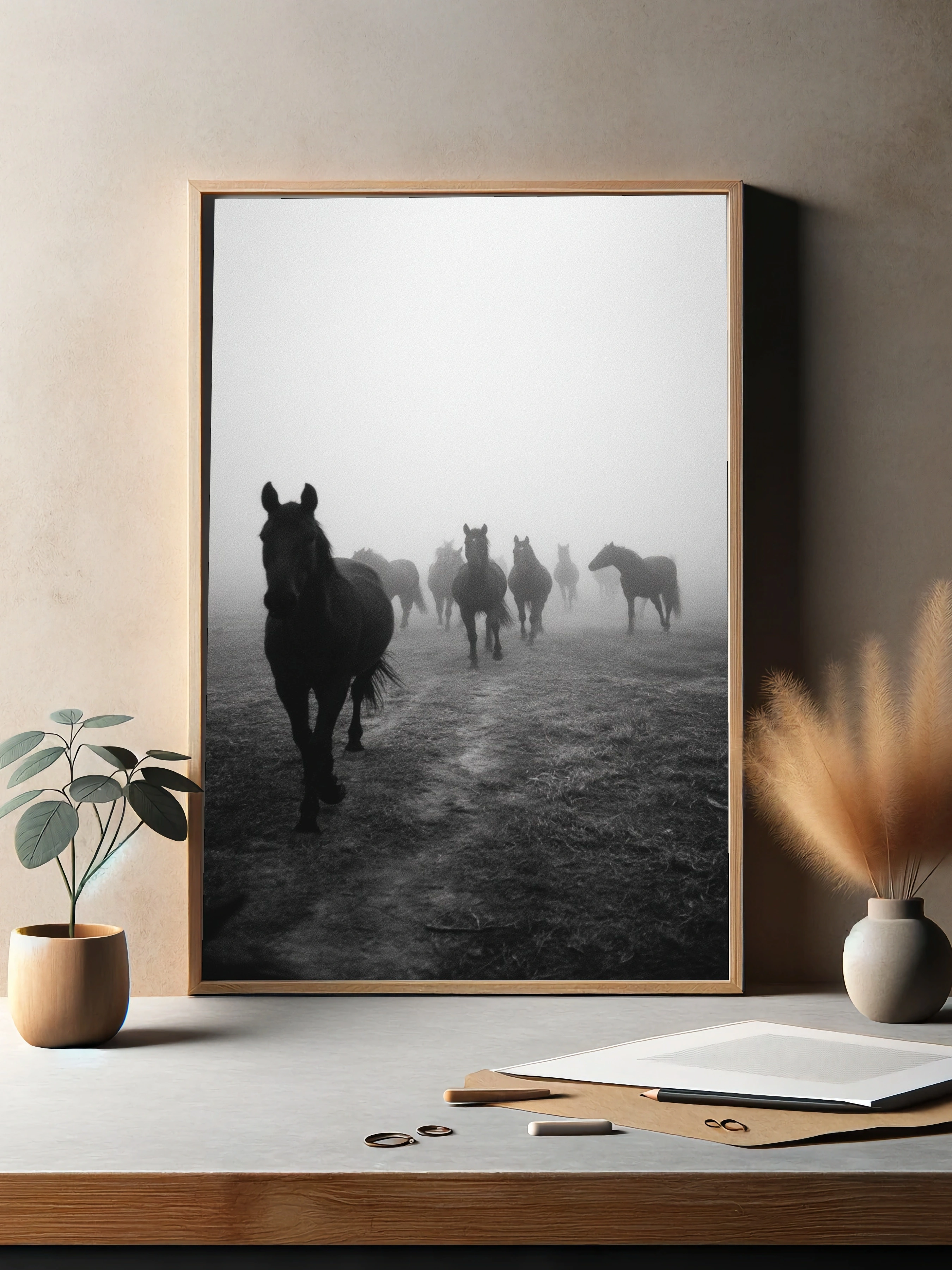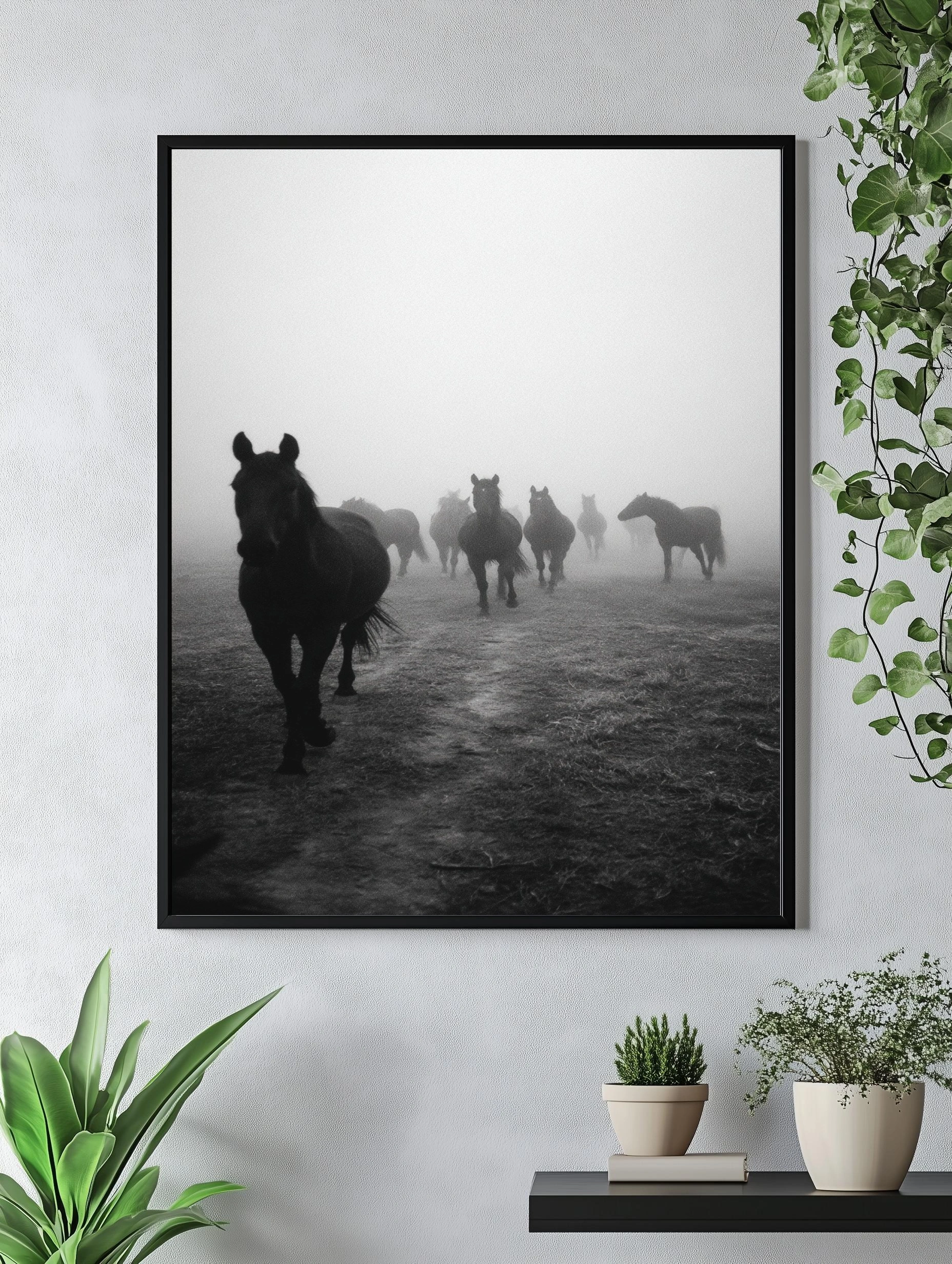 Погрузитесь в атмосферу загадки с этим потрясающим постером, изображающим стадо черных лошадей, уверенно движущихся сквозь густой туман. На переднем плане выделяются силуэты лошадей, их мускулистые тела и выразительные головы создают ощущение силы и грации. Туман, окутывающий сцену, добавляет элемент мистики, заставляя зрителя задуматься о том, что скрыто за пределами видимости. Цветовая гамма выполнена в черно-белых тонах, что подчеркивает контраст и драматизм изображения. Этот постер в стиле минимализма идеально впишется в интерьер гостиной, спальни или офиса, создавая атмосферу спокойствия и умиротворения. Он привлечет внимание молодежи и любителей природы, а также станет отличным акцентом для креативщиков, ищущих вдохновение.
