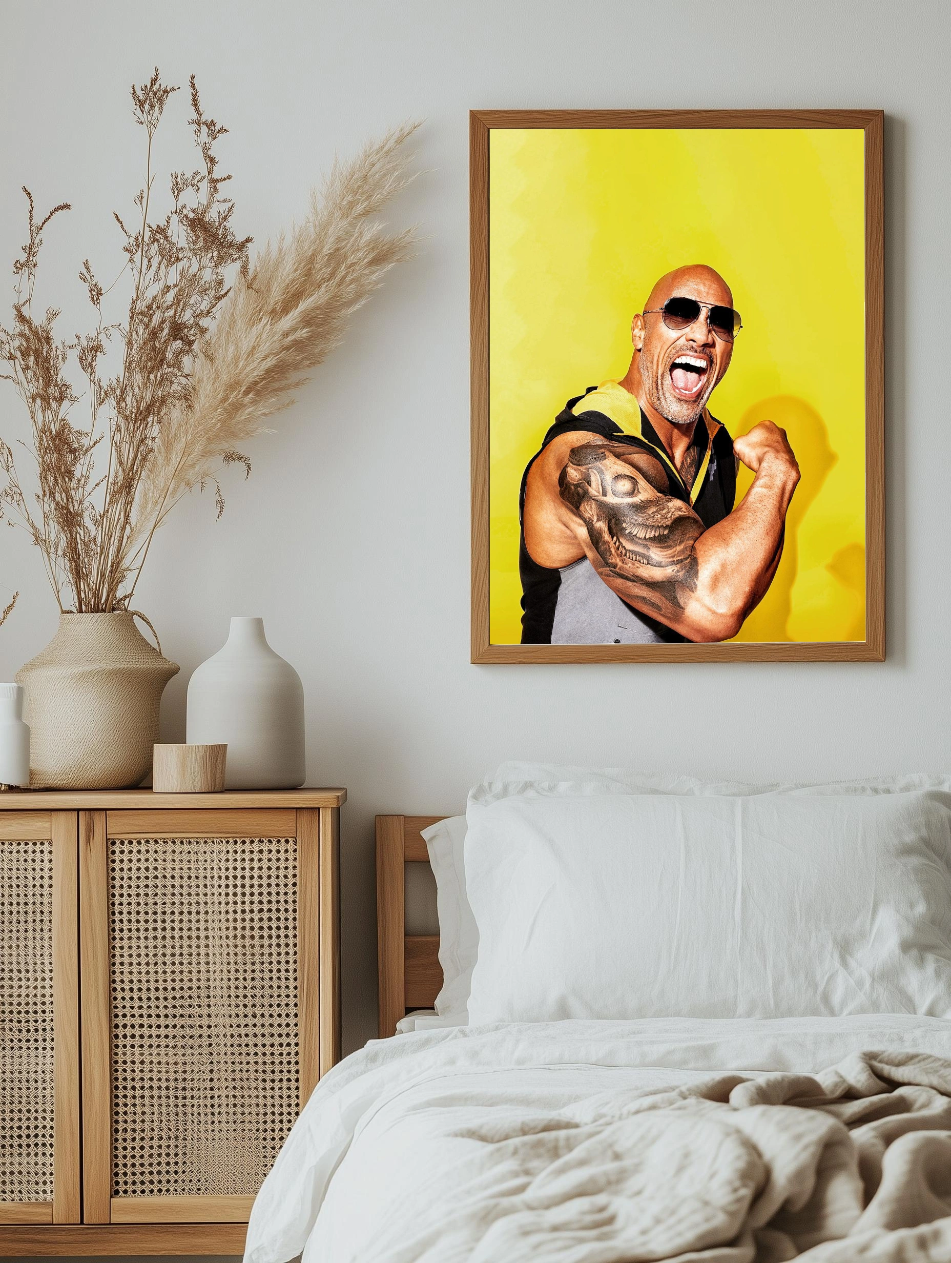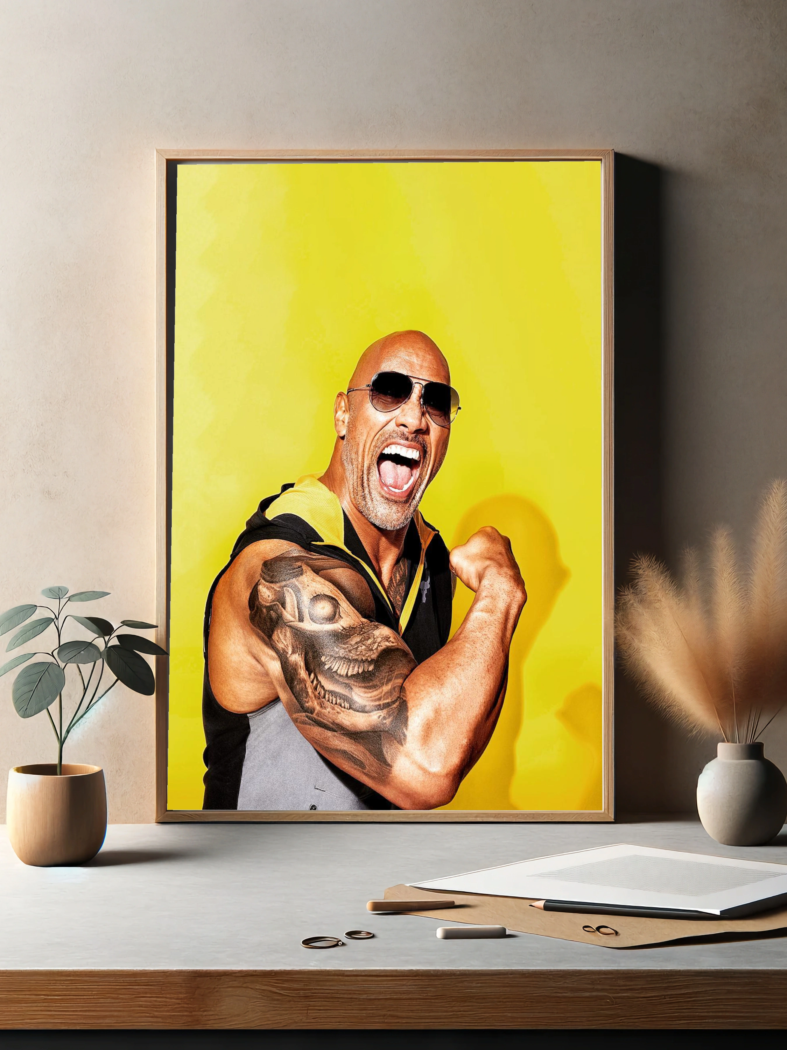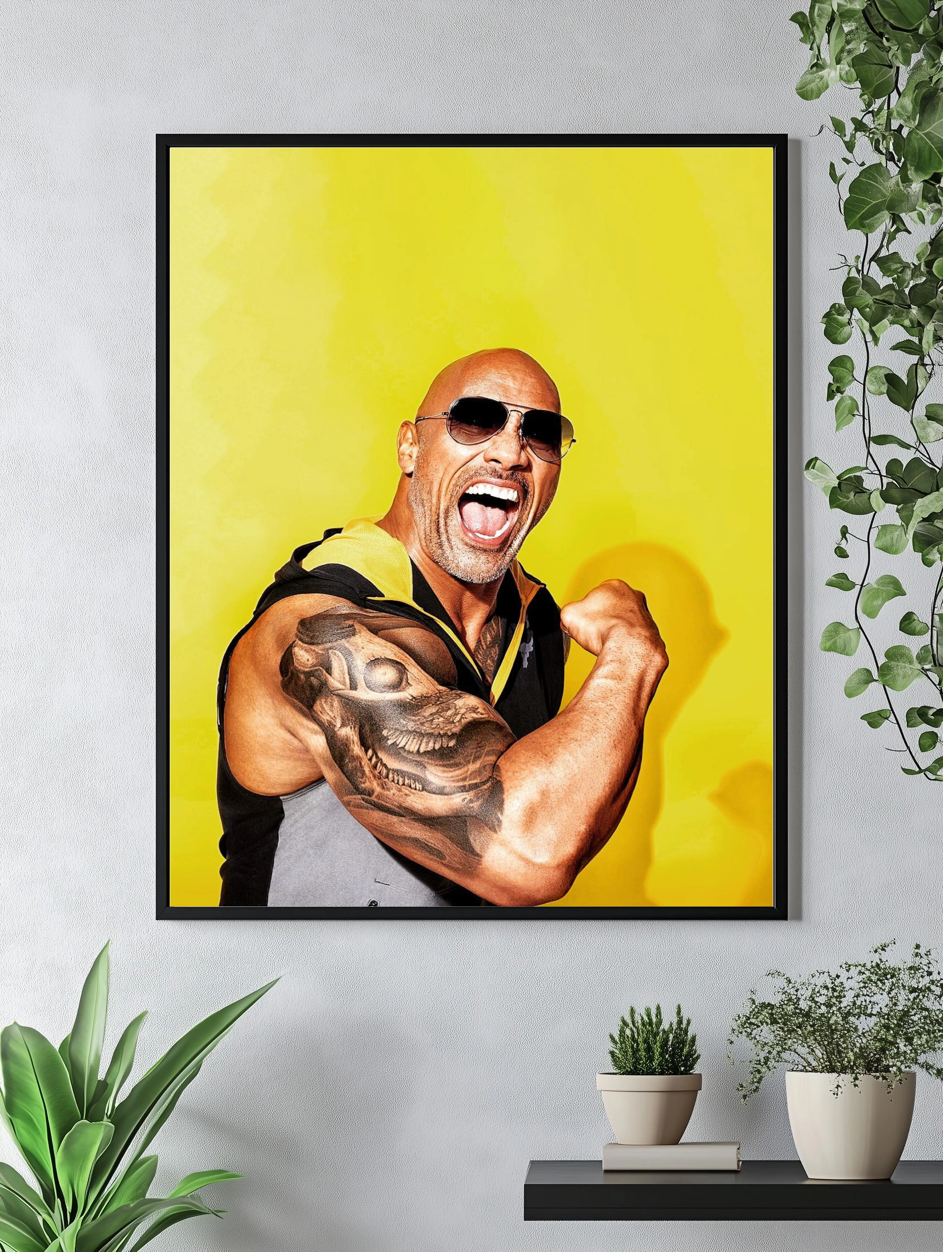 Яркое изображение Дуэйна Джонсона на желтом фоне с акцентом на его мощную мускулатуру и шрамированный тату-рукав. Образ наполнен энергией и харизмой, отлично подойдет как интерьерный постер или декоративный плакат для современного интерьера. Идеальное современное искусство для стен и стильный декор для дома.
