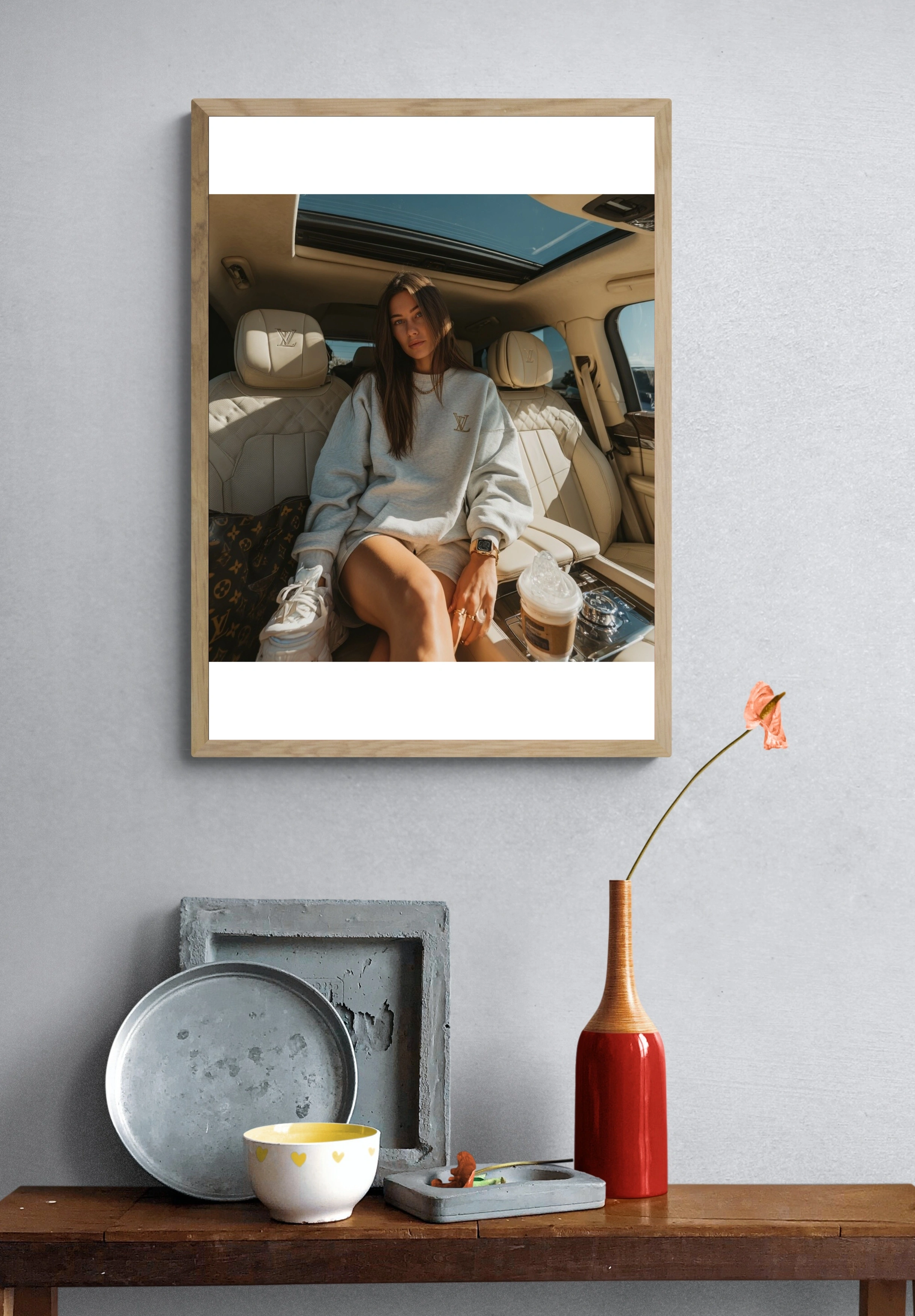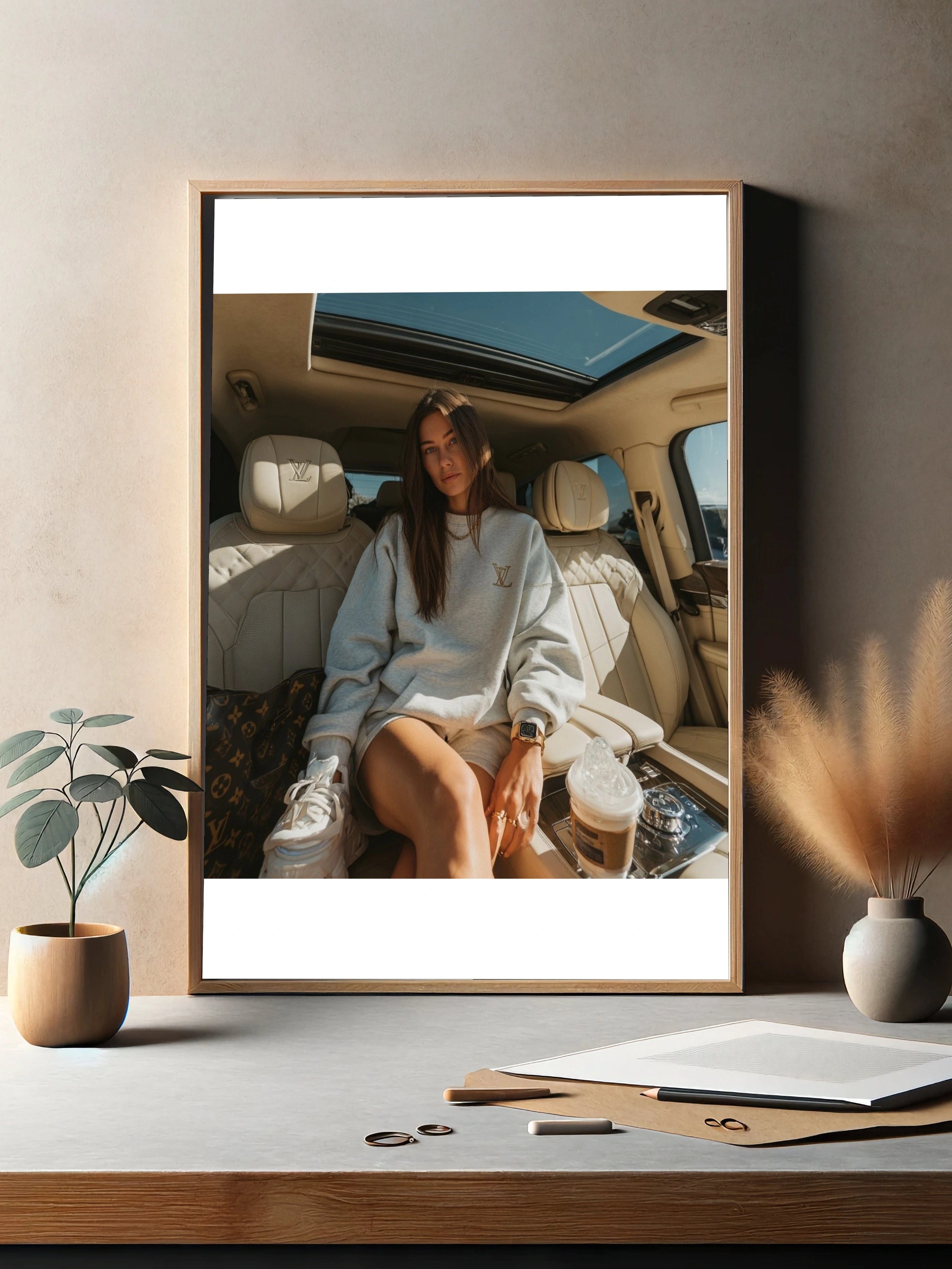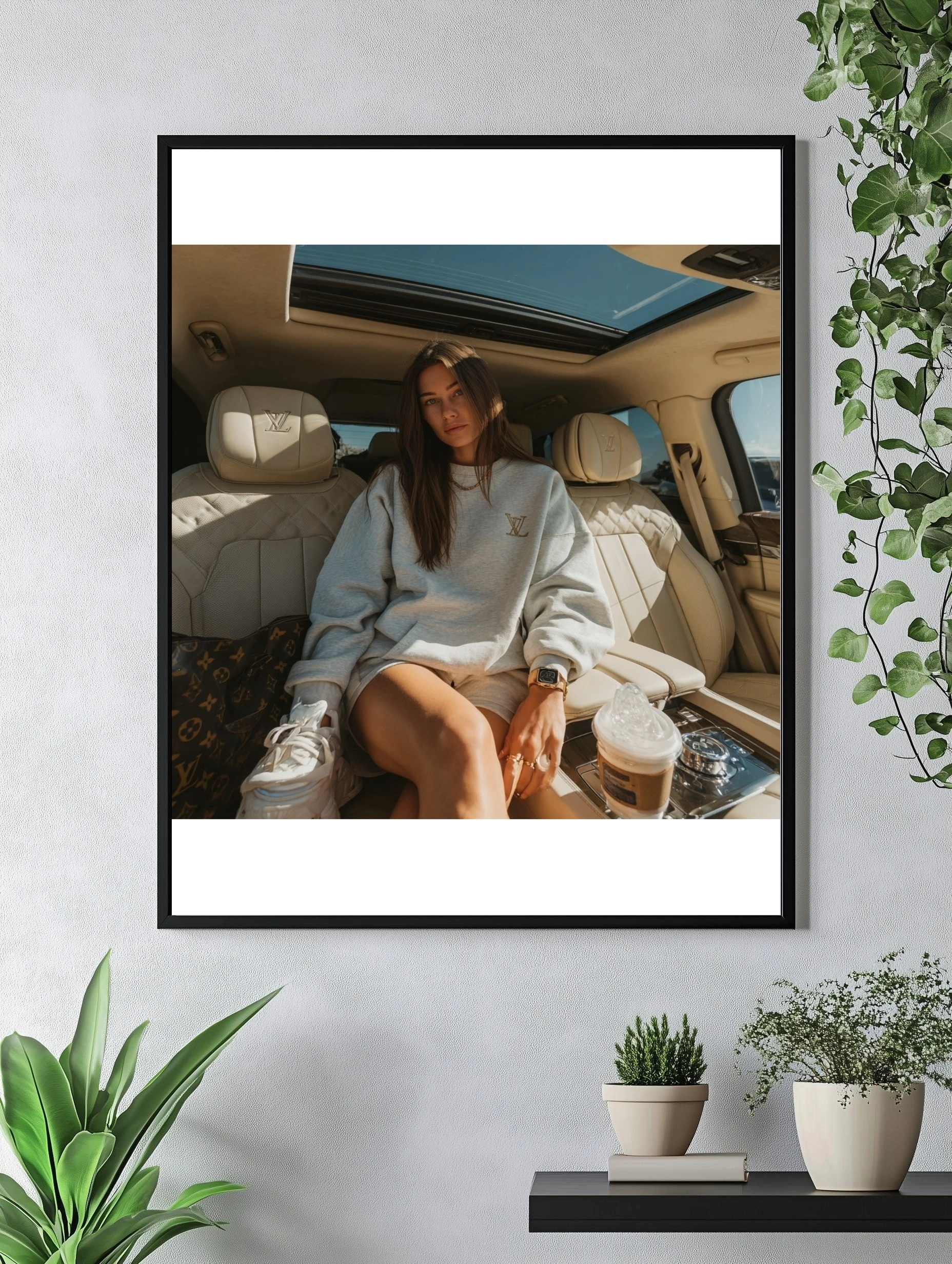 Погрузитесь в атмосферу роскоши и стиля с этим постером, на котором изображена уверенная девушка, расслабляющаяся в шикарном автомобиле. Она одета в серый свитшот с логотипом LV, что подчеркивает её утонченный вкус. Внутреннее убранство автомобиля выполнено в светлых тонах, создавая ощущение простора и комфорта. На переднем плане виден стакан с напитком, добавляющий нотку повседневной жизни. Яркое солнце освещает её лицо, создавая теплую и уютную атмосферу. Этот постер станет идеальным акцентом для вашего интерьера, будь то гостиная или офис, и привлечет внимание молодежи и креативщиков, стремящихся к стилю и комфорту.