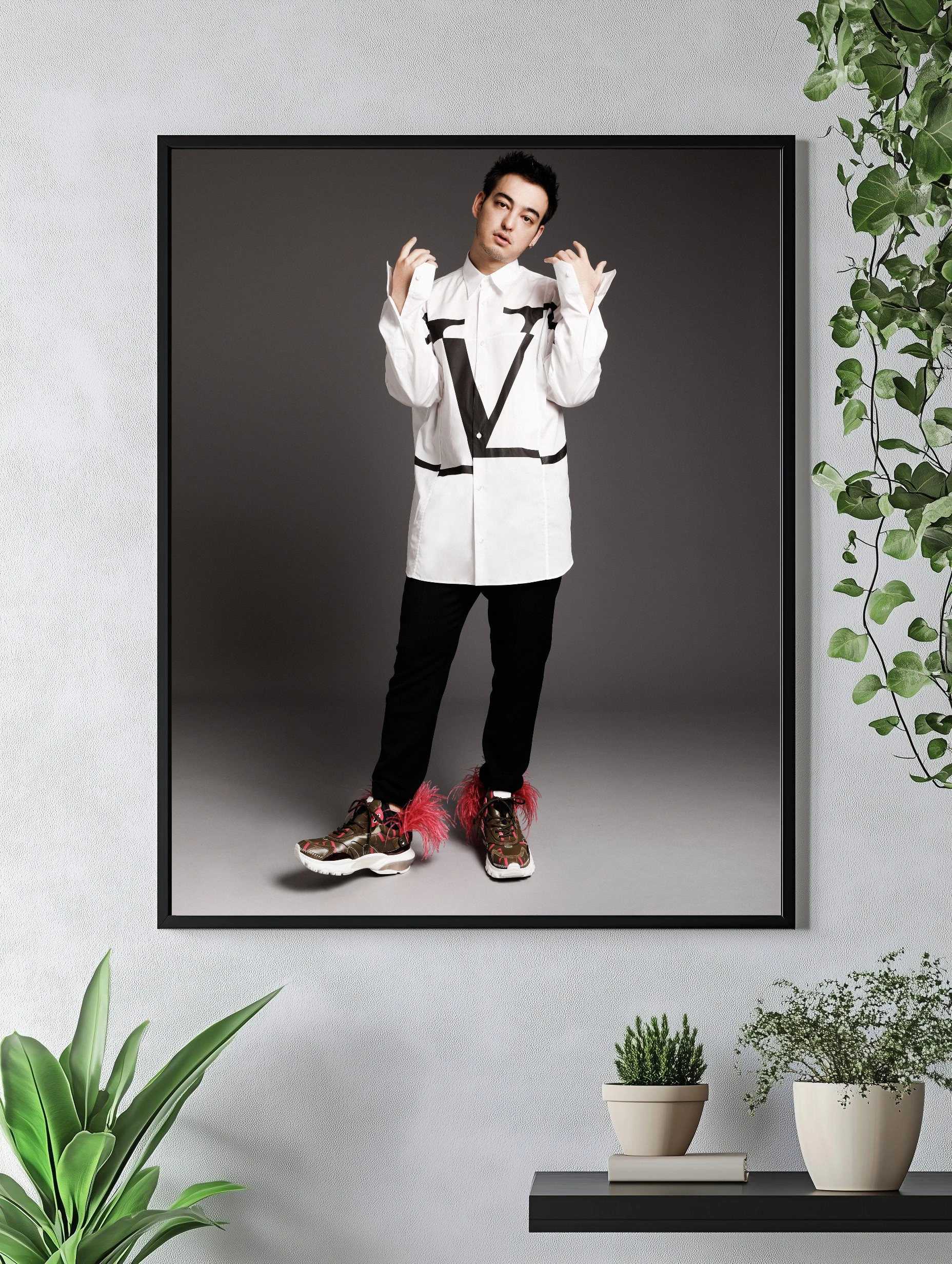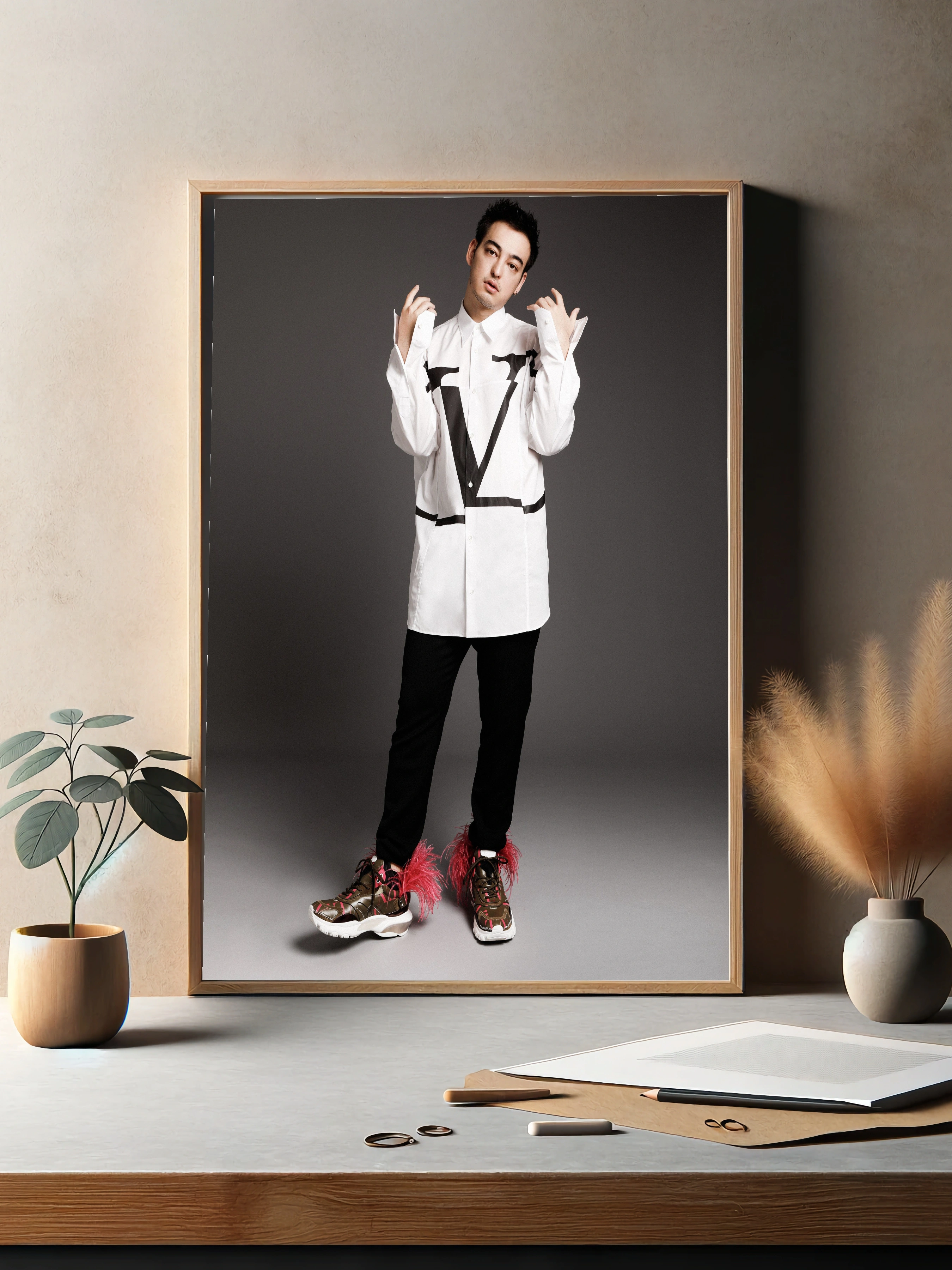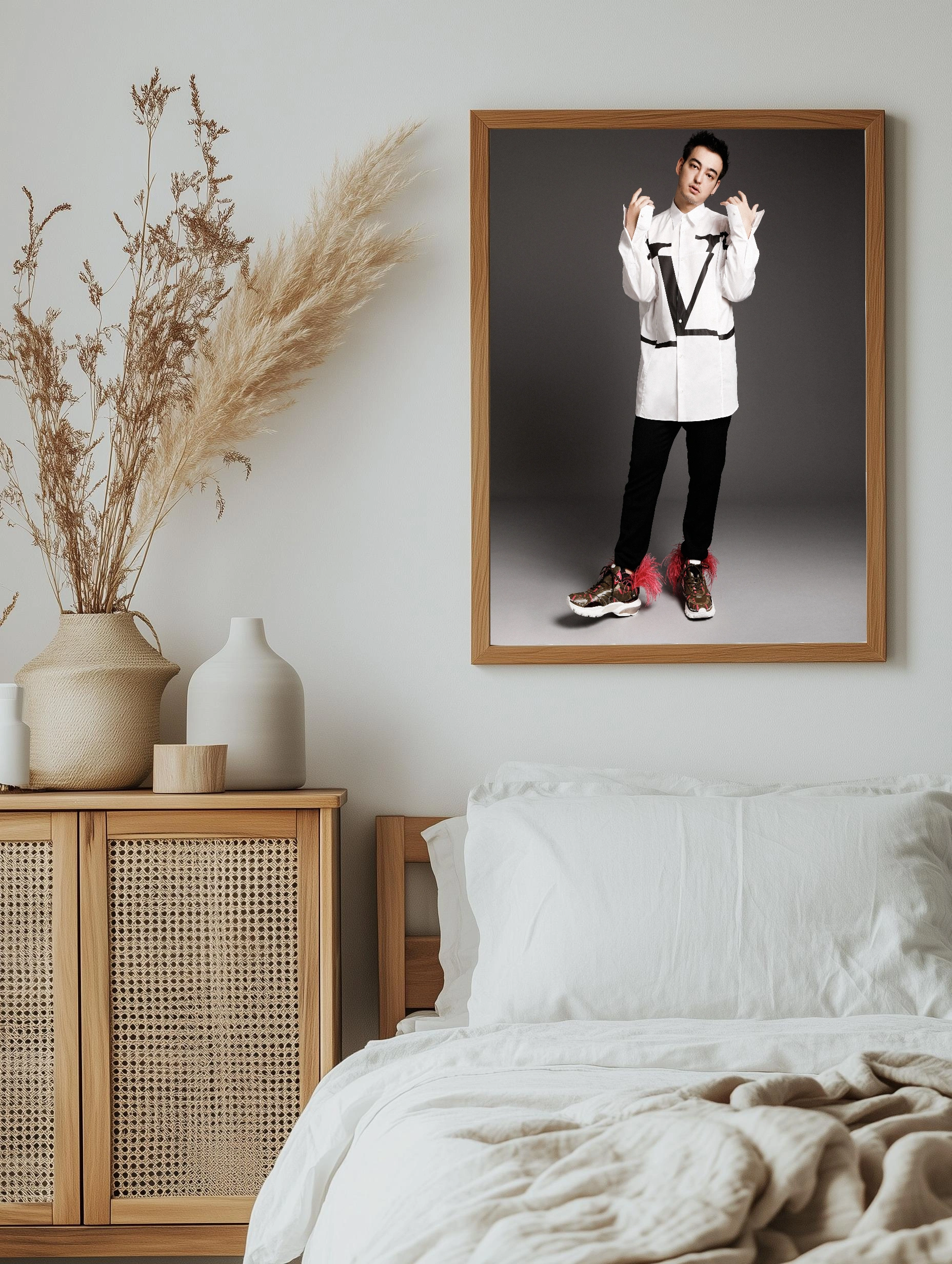 На изображении представлен молодой мужчина в строгой белой рубашке с крупным графическим элементом и чёрных брюках на нейтральном сером фоне. Образ акцентируется необычной обувью с красными перьями, что добавляет динамичности и современного креативного настроения. Подходит как интерьерный фотопостер модной тематики или художественный плакат для стильного декора стен.