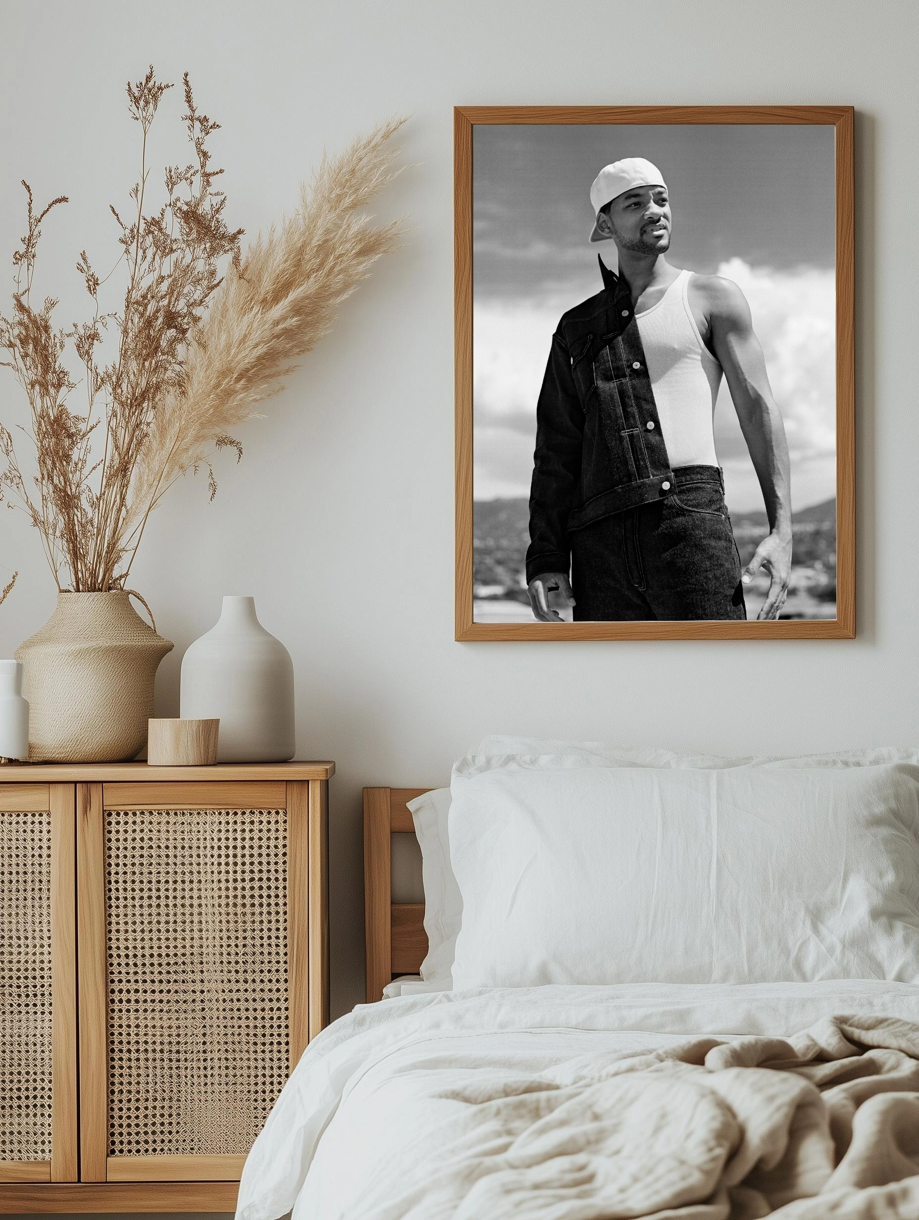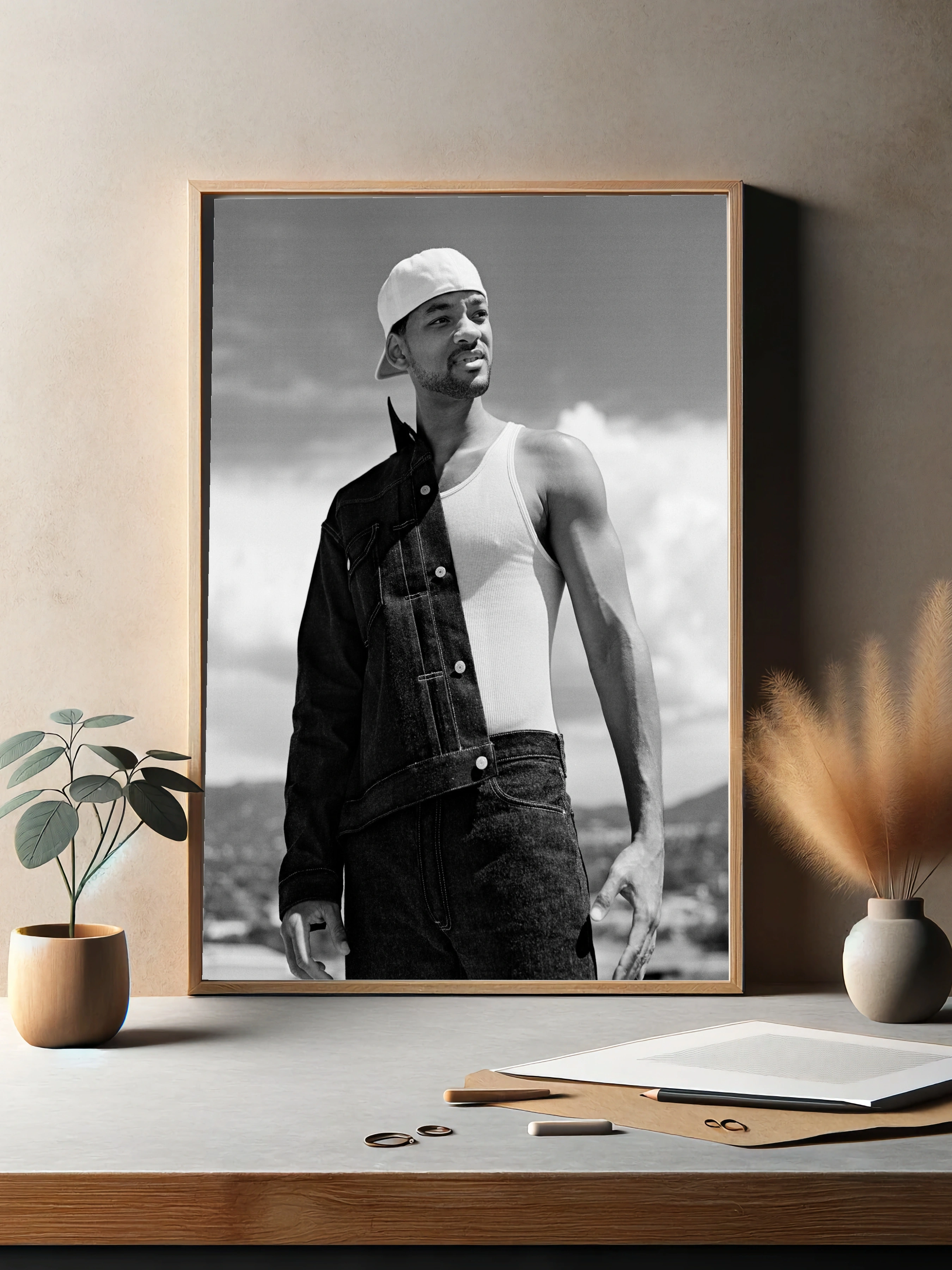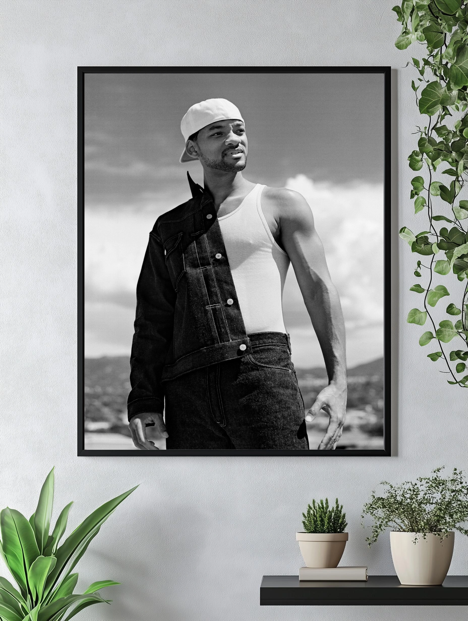Чёрно-белая фотография известного актёра и музыканта Уилла Смита, запечатлённого в повседневном стильном образе с джинсовой курткой и белой майкой. Гармония контрастов и естественность позы создают уникальный интерьерный декор, который подойдёт как картина для гостиной или офиса. Современное искусство для стен с акцентом на харизму и культуру.