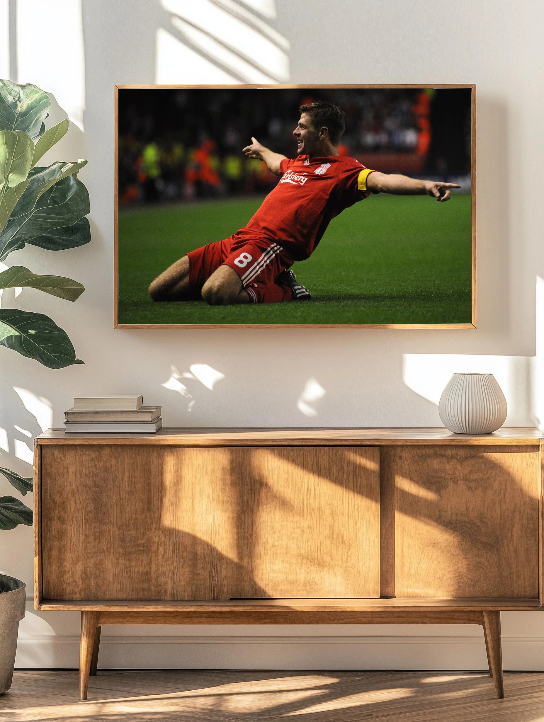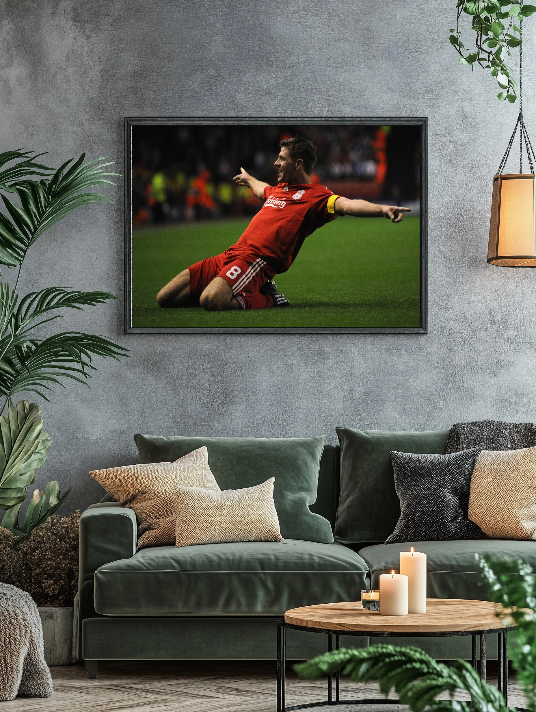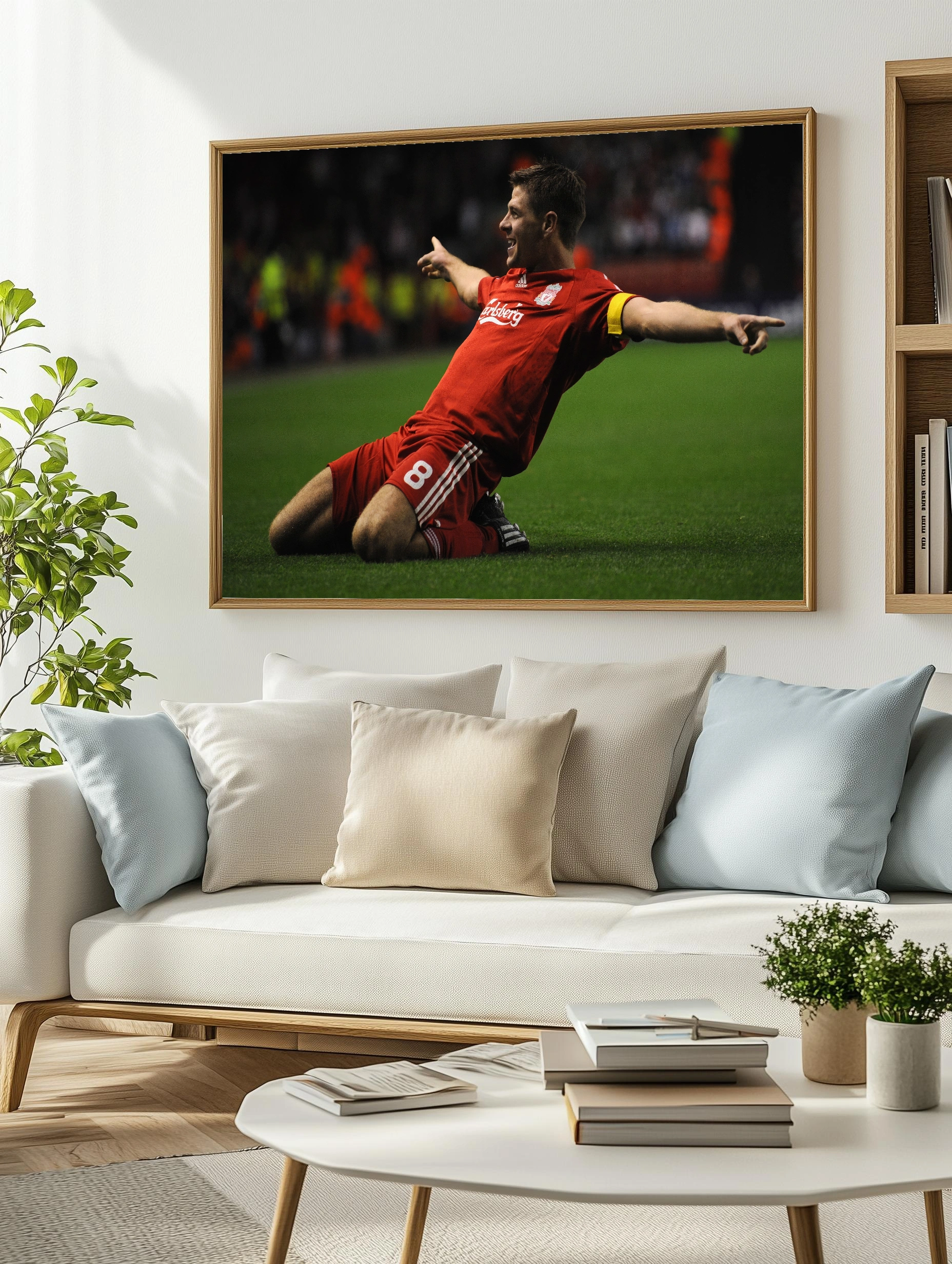 Фотопостер с изображением Стивена Джеррарда в красной форме Ливерпуля, запечатлённого в момент яркой футбольной победы на зелёном газоне. Эмоции триумфа подчёркнуты динамичной позой и контрастным освещением, что создаёт эффект современного искусства для стен и спортивного интерьера. Идеально для оформления гостиной или спортивного клуба.