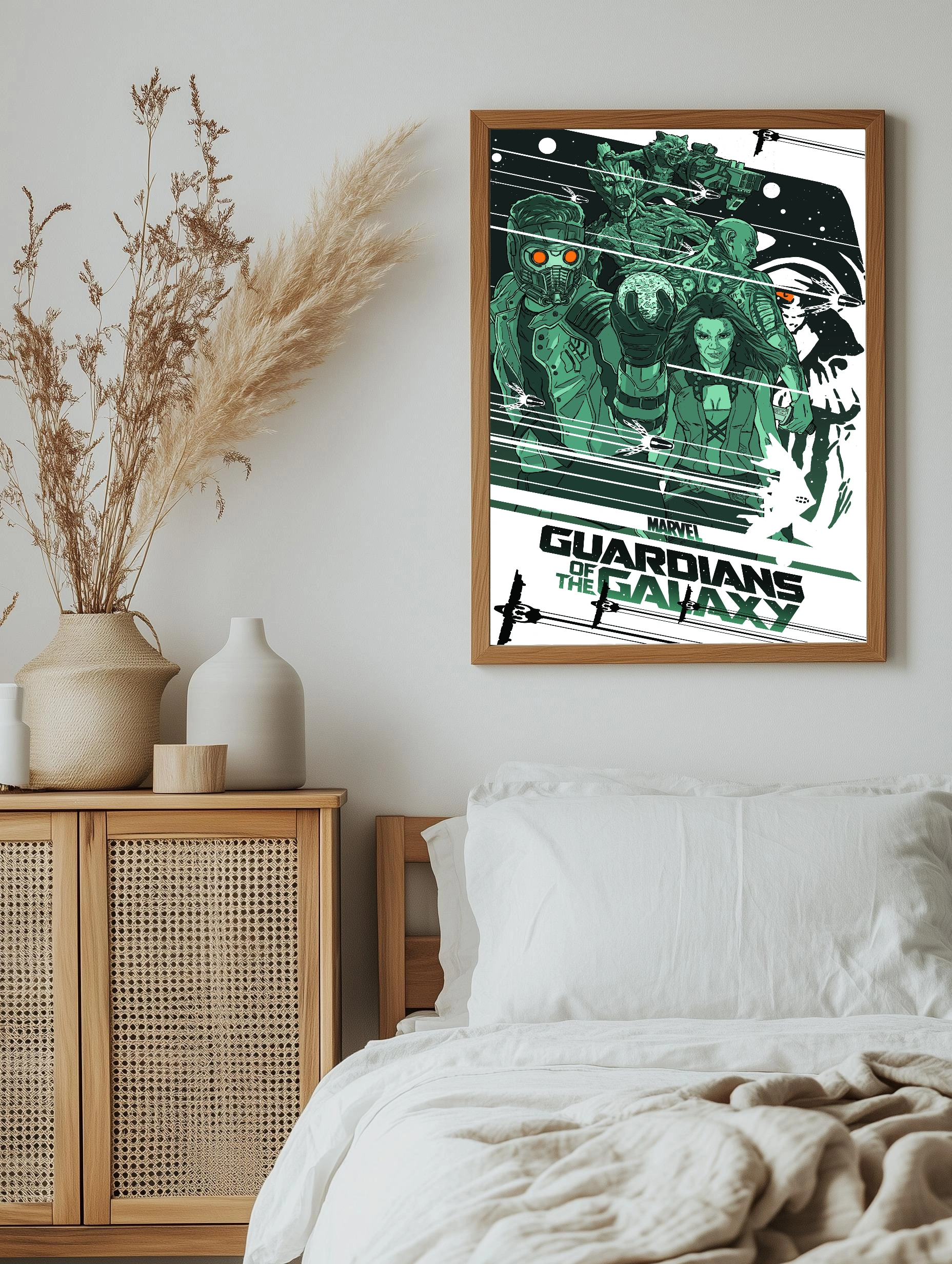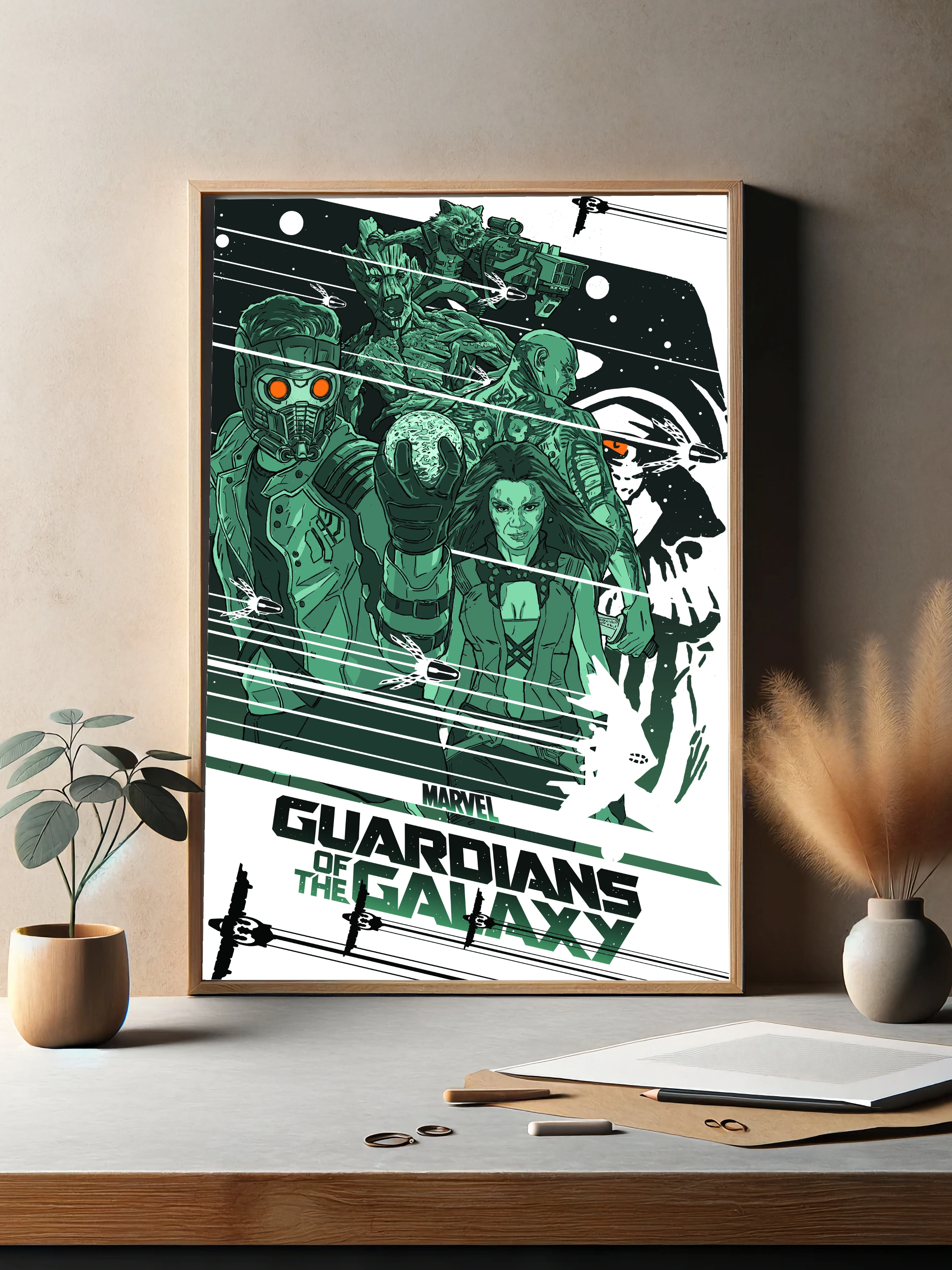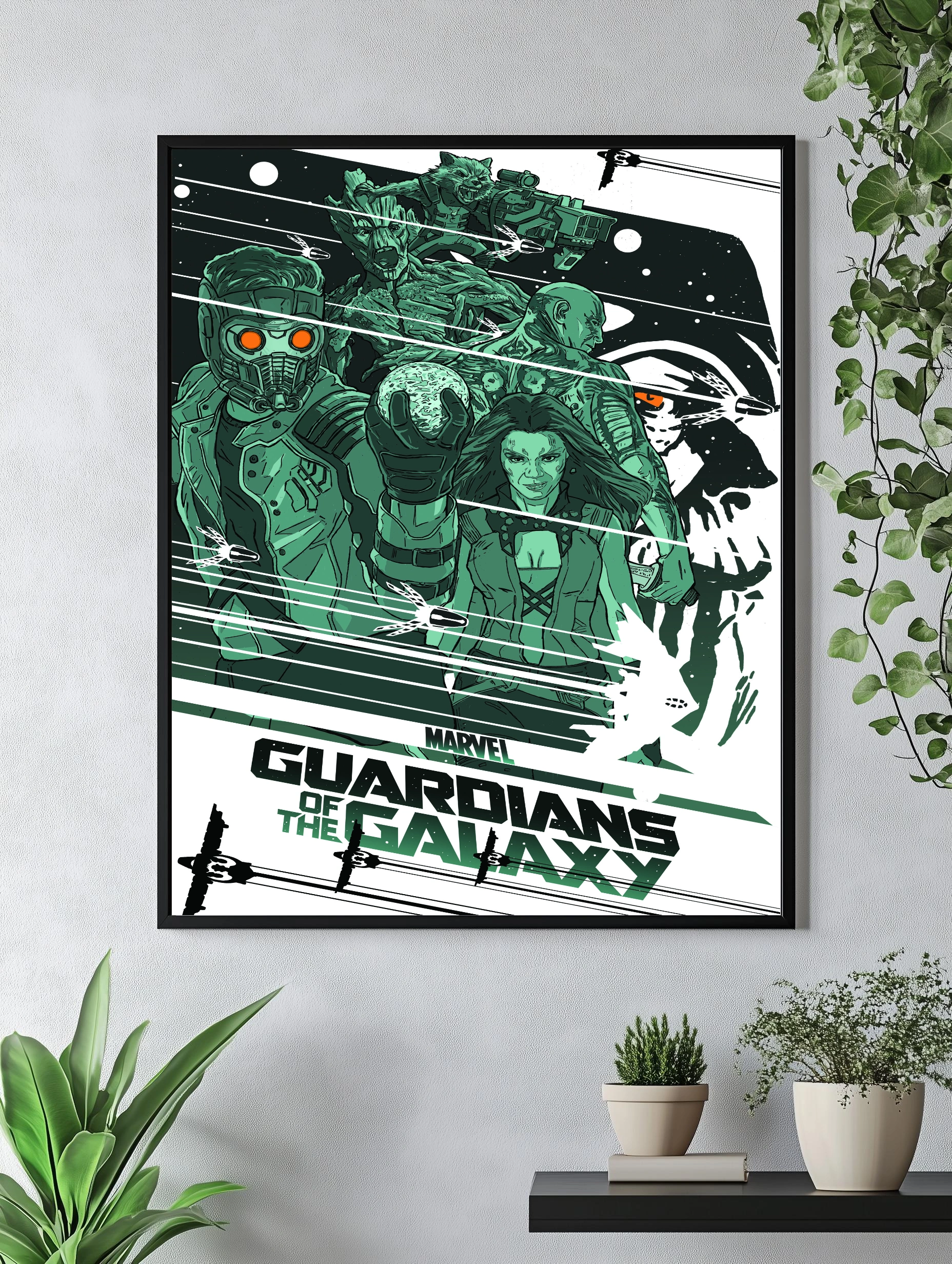 Красочный интерьерный постер с героями популярного фильма Marvel — Стражи Галактики. На изображении представлены ключевые персонажи: Звёздный Лорд, Грут, Гамора, Дракс и Енот, выполненные в динамичном стиле с акцентом на зеленые и темные оттенки. Этот художественный плакат отлично впишется в современный декор комнаты поклонников супергероев и кино.