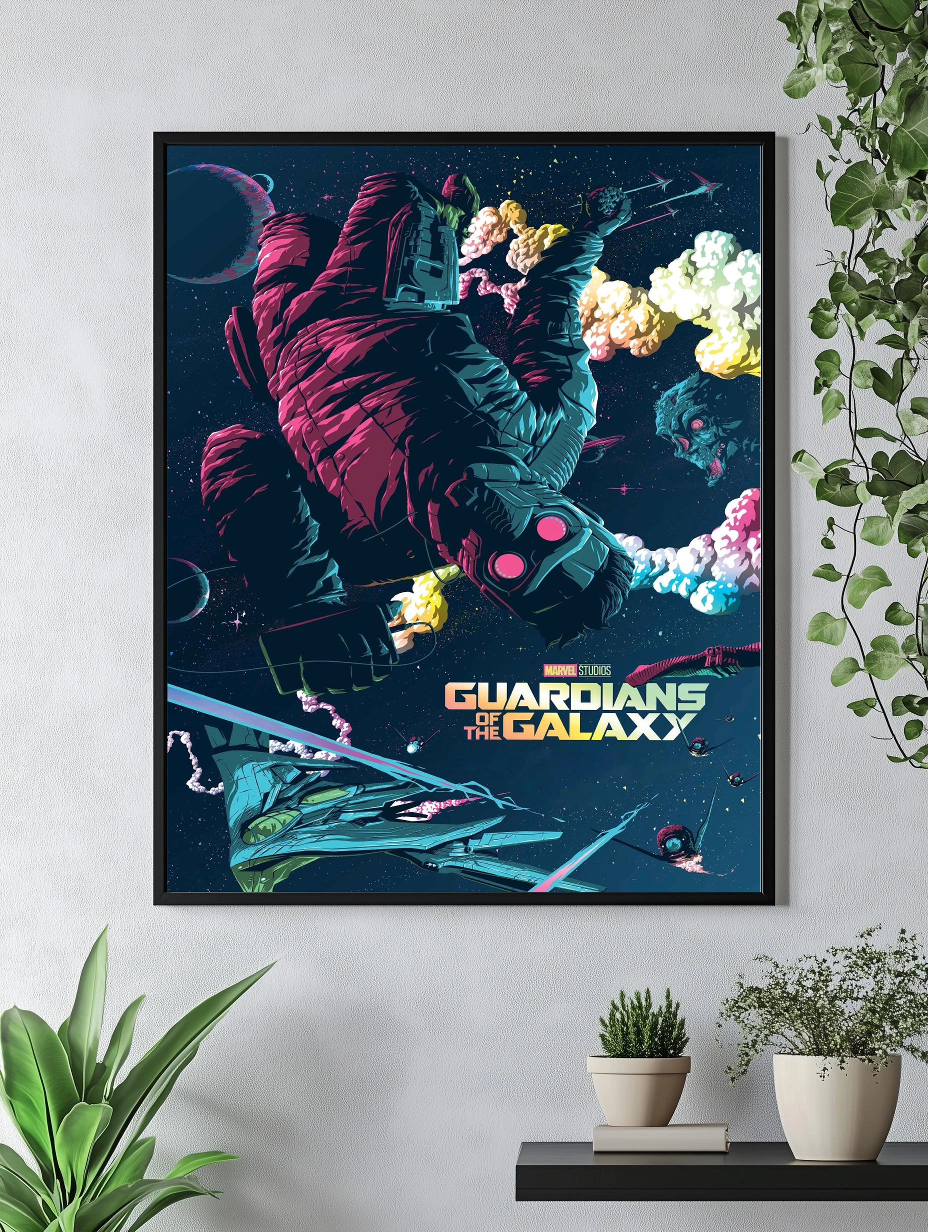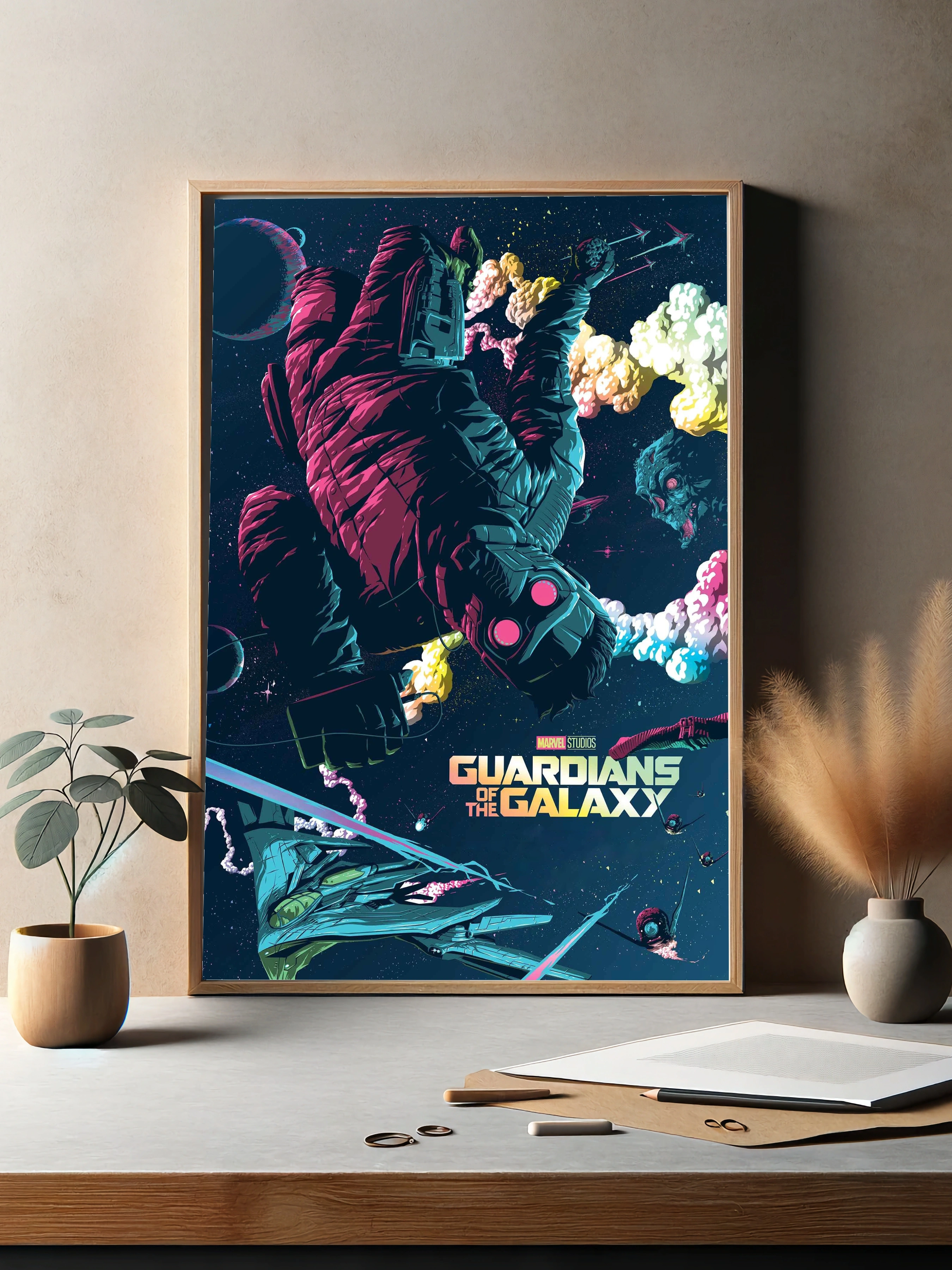 Яркий и динамичный интерьерный постер с изображением героя из фильма Marvel ‘Стражи Галактики’. На картине астронавт в костюме с розовыми очками, фоном служит звёздное пространство с планетами и космическим кораблём. Современное искусство для стен подарит декор и атмосферу приключений и битвы в глубинах космоса.