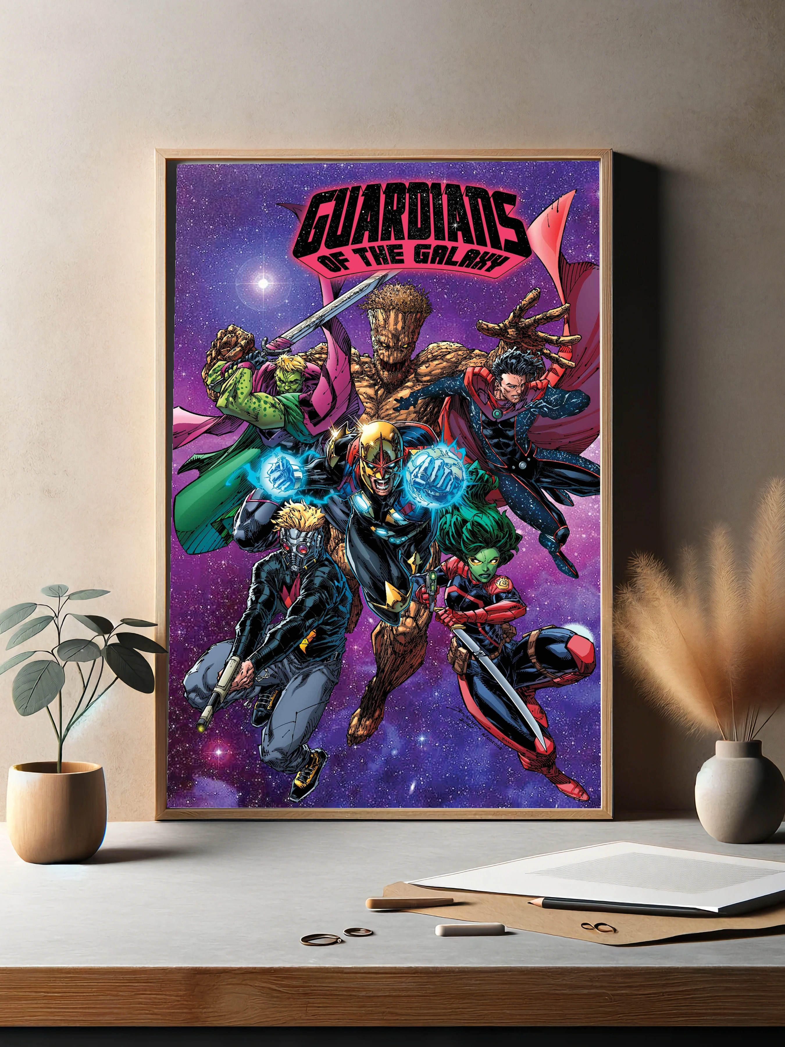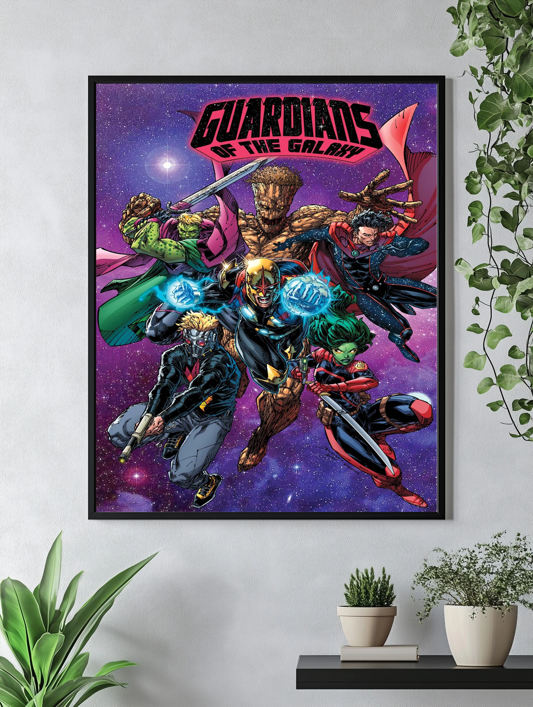 Яркая картина для гостиной с героями комиксов Marvel — Стражами Галактики. На изображении динамичная группа персонажей, среди которых Грут, Гамора, Старлох, все в боевых позах на фоне звёздного космоса. Иллюстрация выполнена в комикс-стиле с насыщенными красными, зелёными и коричневыми оттенками. Подходит как интерьерный фотопостер и уникальное декоративное искусство для стен.