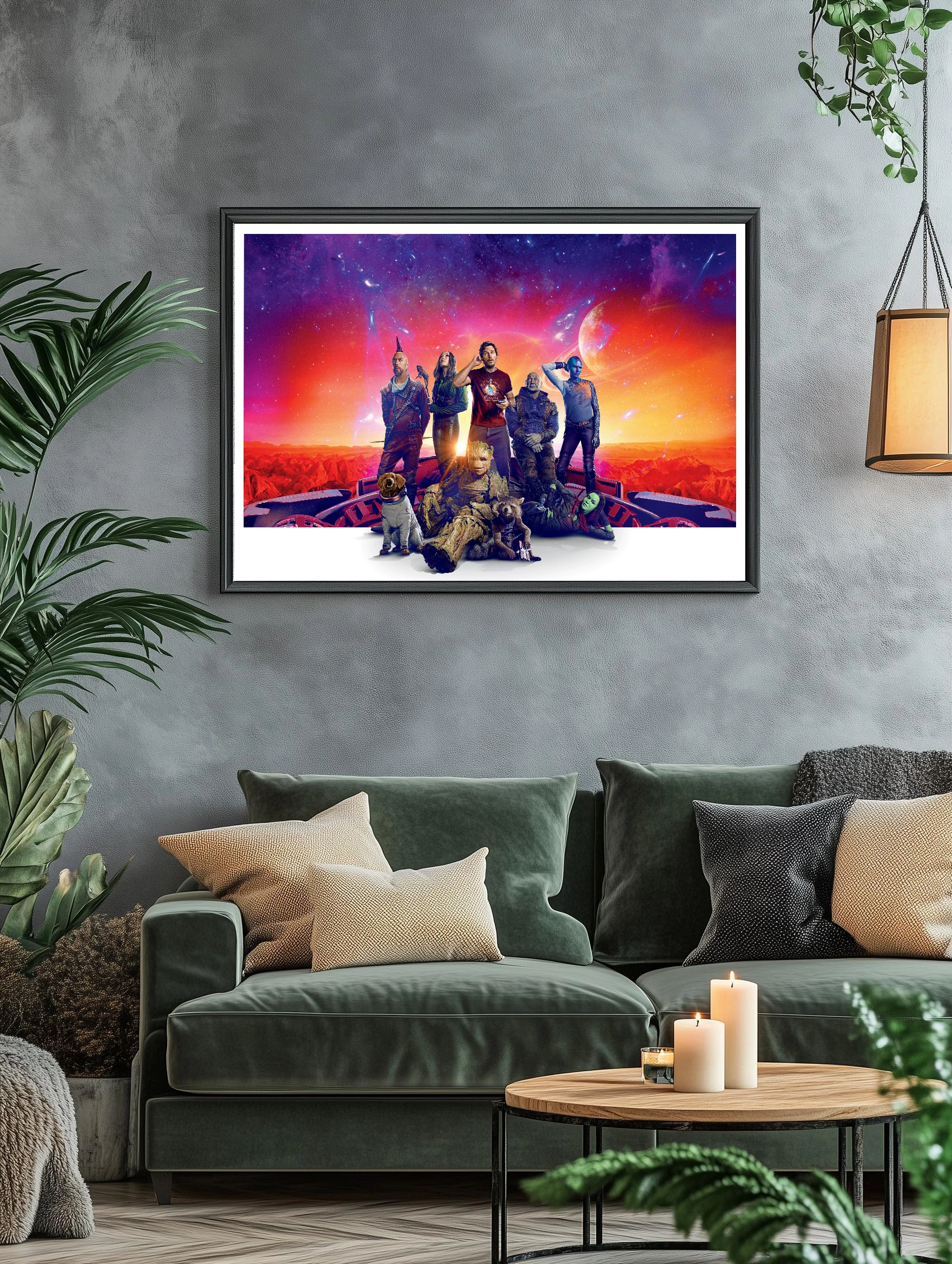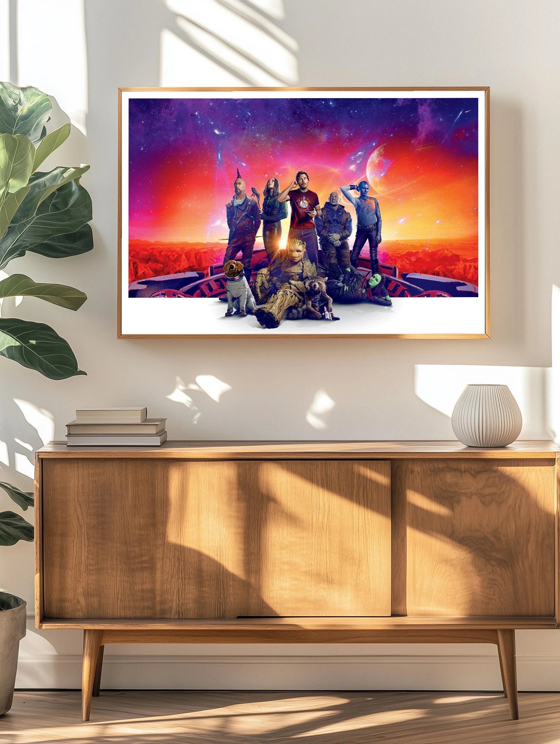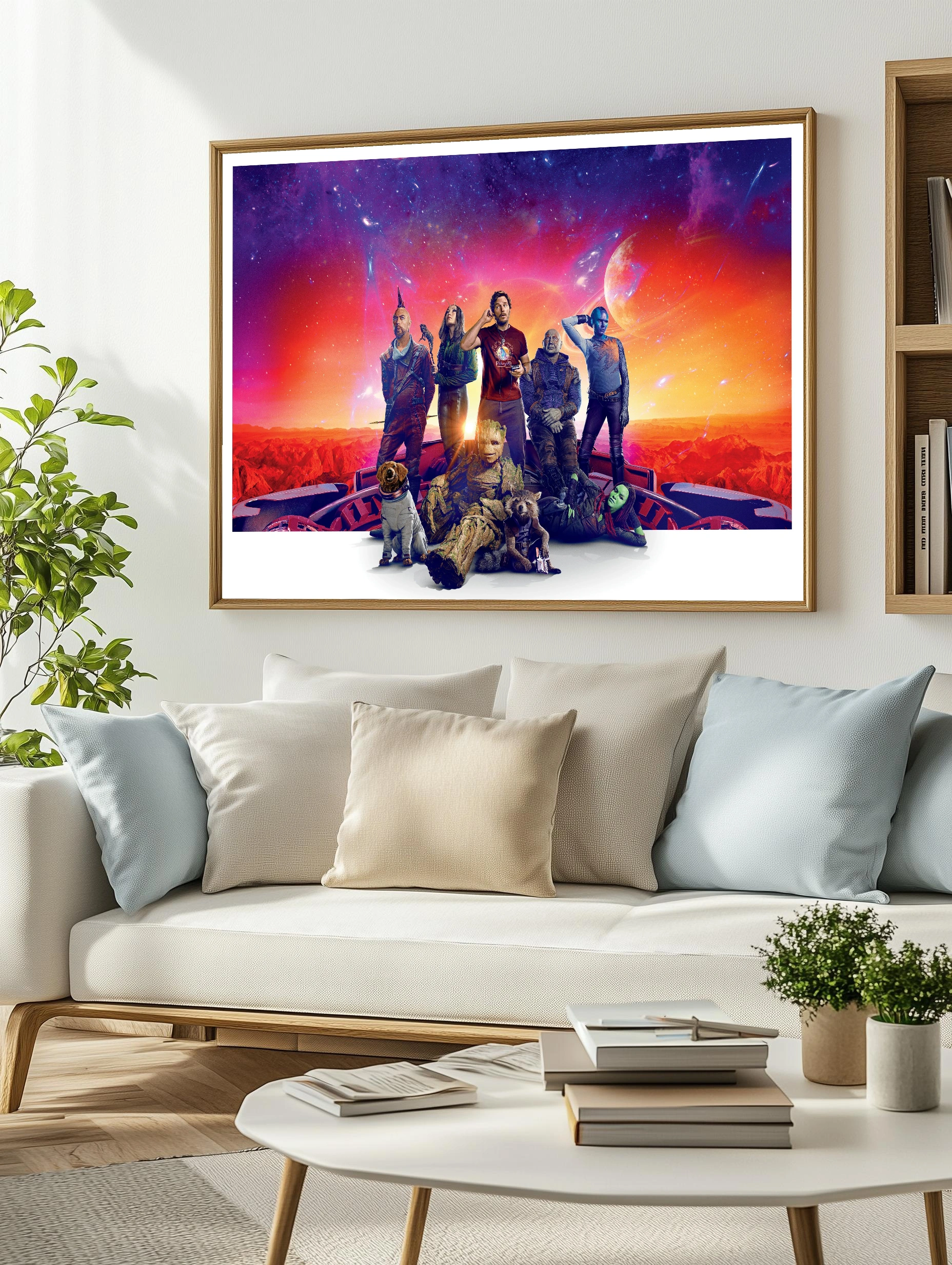 Изображение представляет героев из киновселенной Marvel — Стражей Галактики. На переднем плане Грут, Ракета и другие персонажи на фоне космического пейзажа с ярким закатом, планетами и звёздами. Стиль яркий, с контрастной палитрой, создающей атмосферу приключения и силы. Идеальный интерьерный арт для фанатов Marvel и современного искусства на стену.