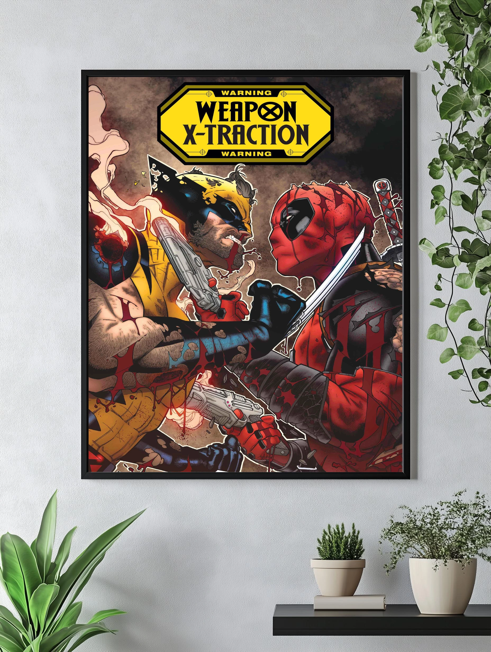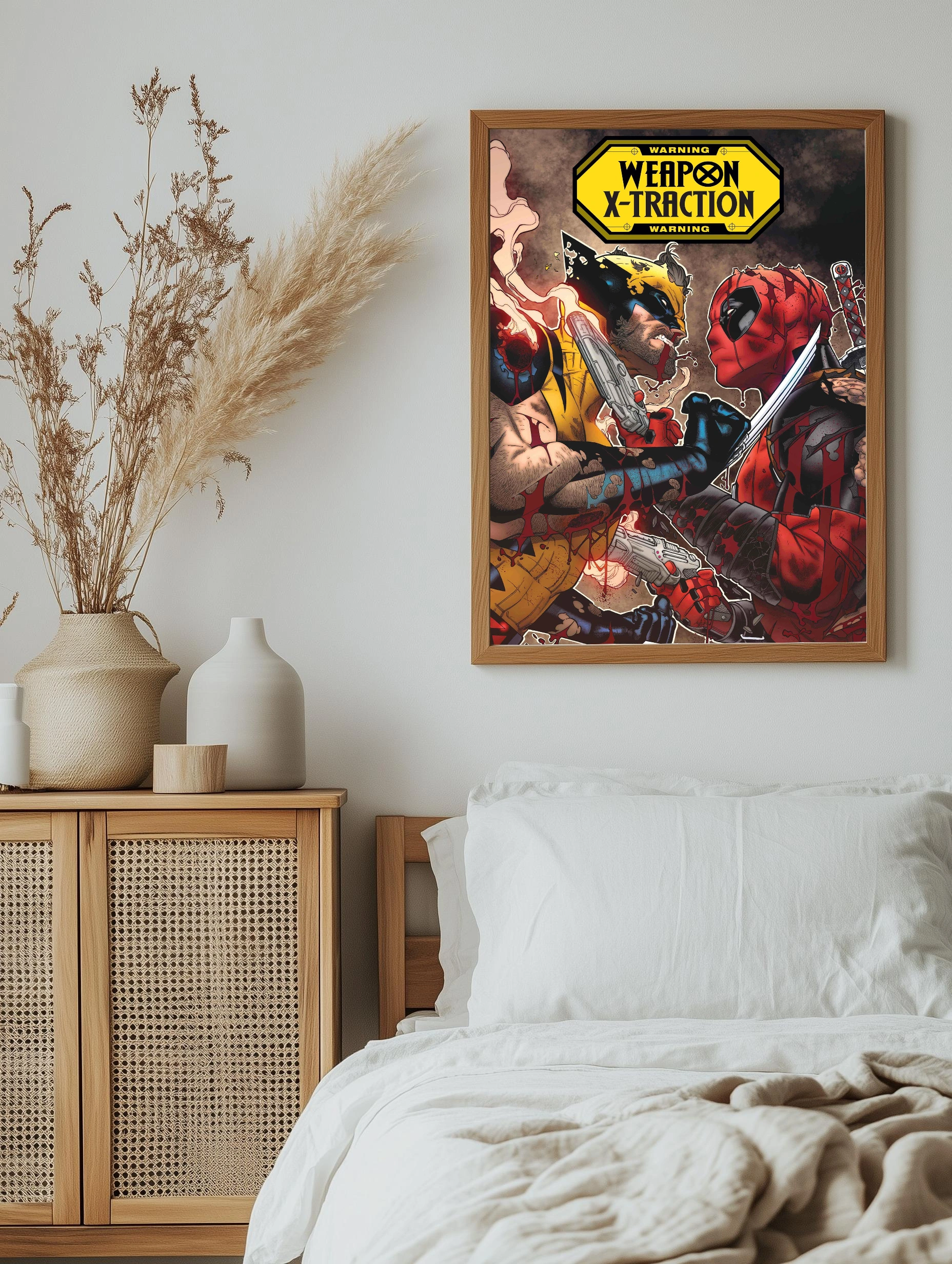 Декоративный плакат изображает напряжённую сцену противостояния Росомахи и Дэдпула — двух культовых персонажей Marvel. Яркие цвета и детальная прорисовка передают динамику и энергию. Этот интерьерный арт отлично подходит для фанатов комиксов, добавляя современное искусство для стен, картина для гостиной или офиса.