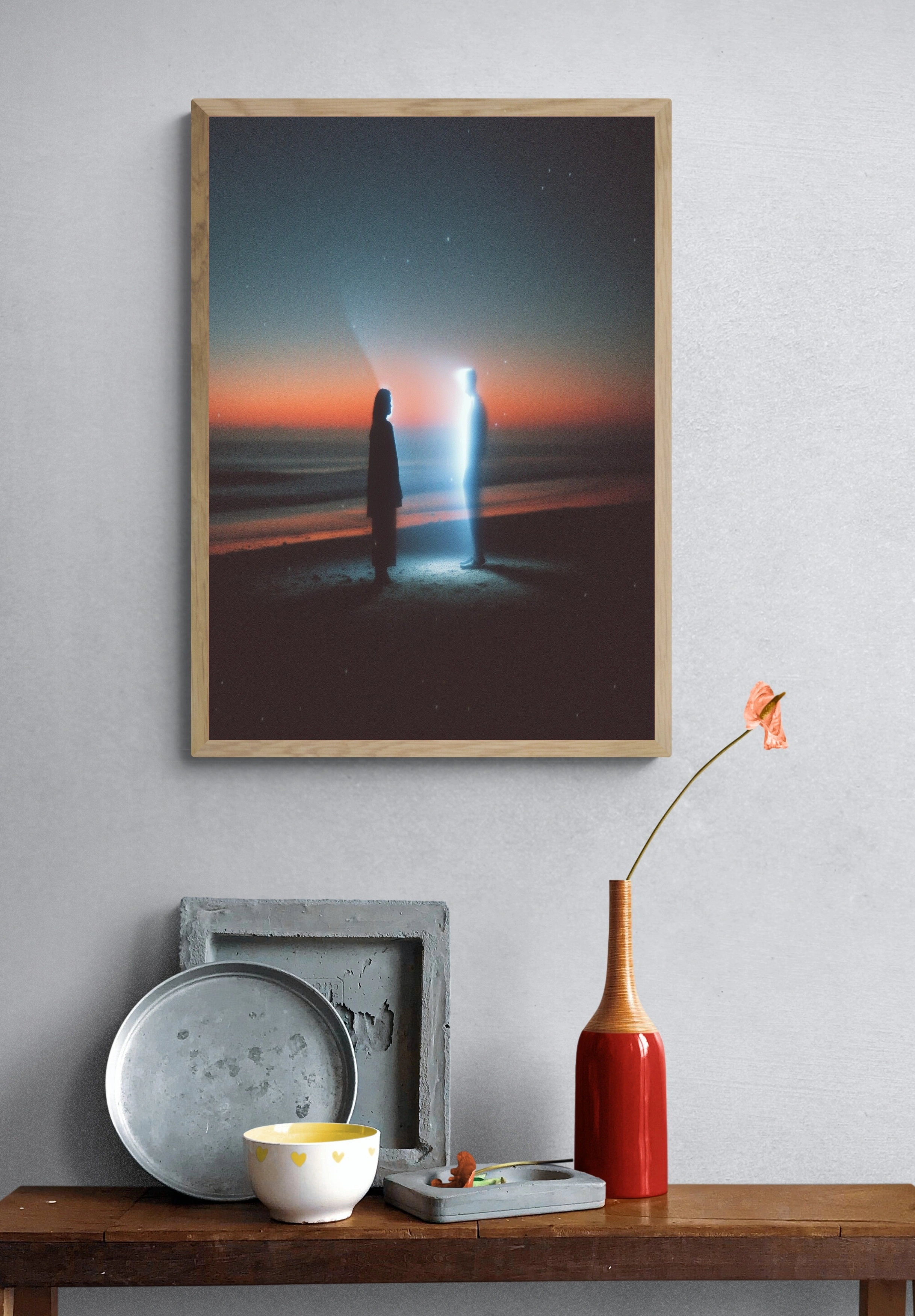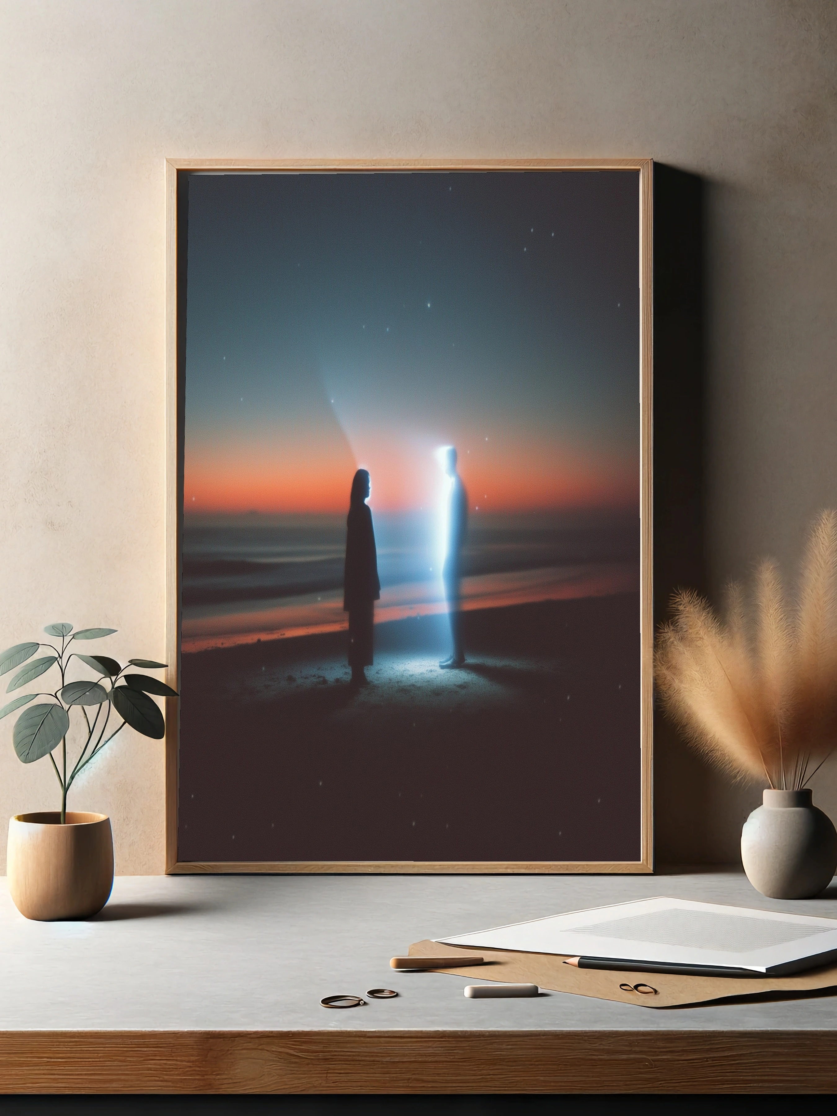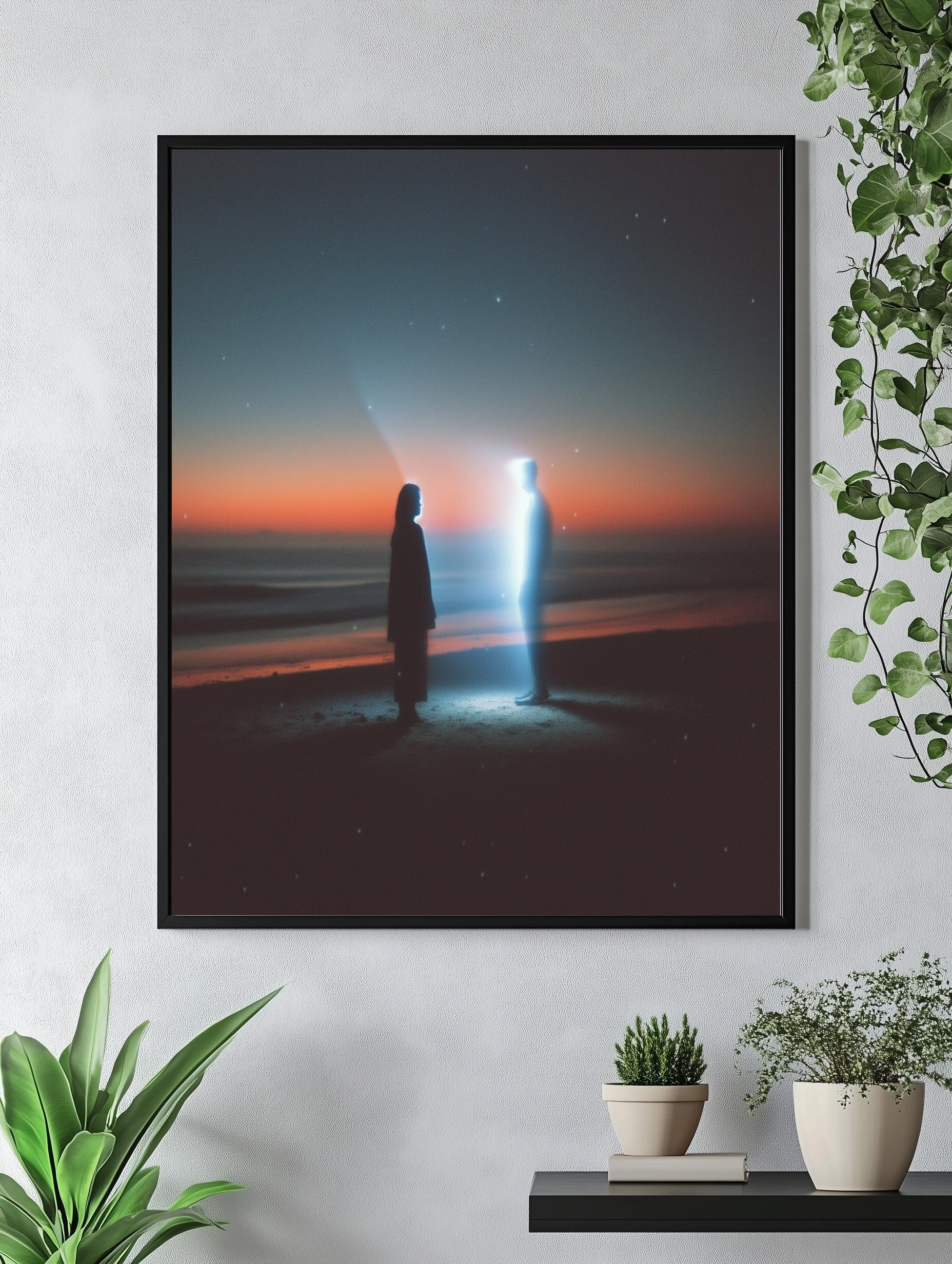 На этом завораживающем постере изображены два силуэта, стоящих на берегу моря, в момент, когда закат окутывает горизонт яркими оттенками оранжевого и фиолетового. Один из силуэтов излучает мягкий свет, создавая атмосферу мистики и волшебства. Мягкие волны накатываются на берег, добавляя динамики в спокойную сцену. Звезды начинают мерцать на небосводе, усиливая ощущение магии. Этот постер выполнен в стиле сюрреализма, который пробуждает эмоции и вдохновляет на размышления. Идеально подойдет для спальни или гостиной, создавая уютную и загадочную атмосферу. Целевая аудитория — молодые пары и креативные личности, ищущие уникальные акценты для своего интерьера.