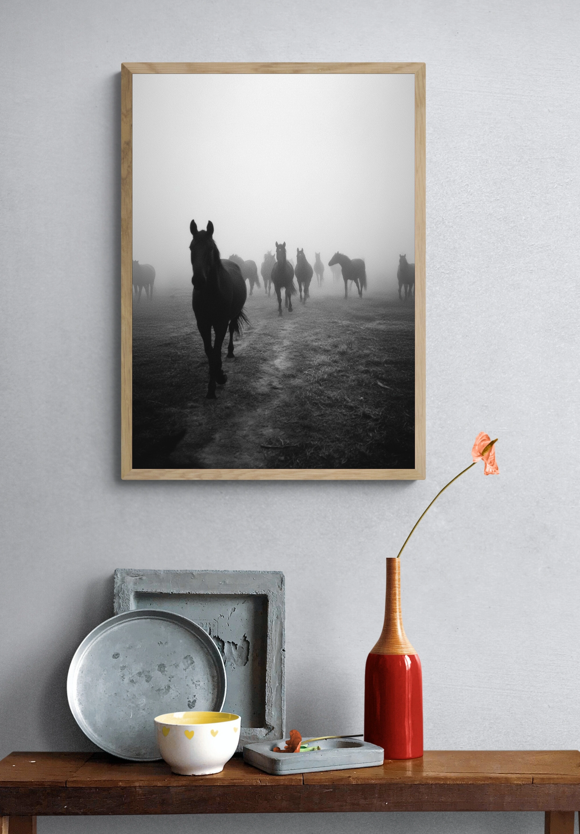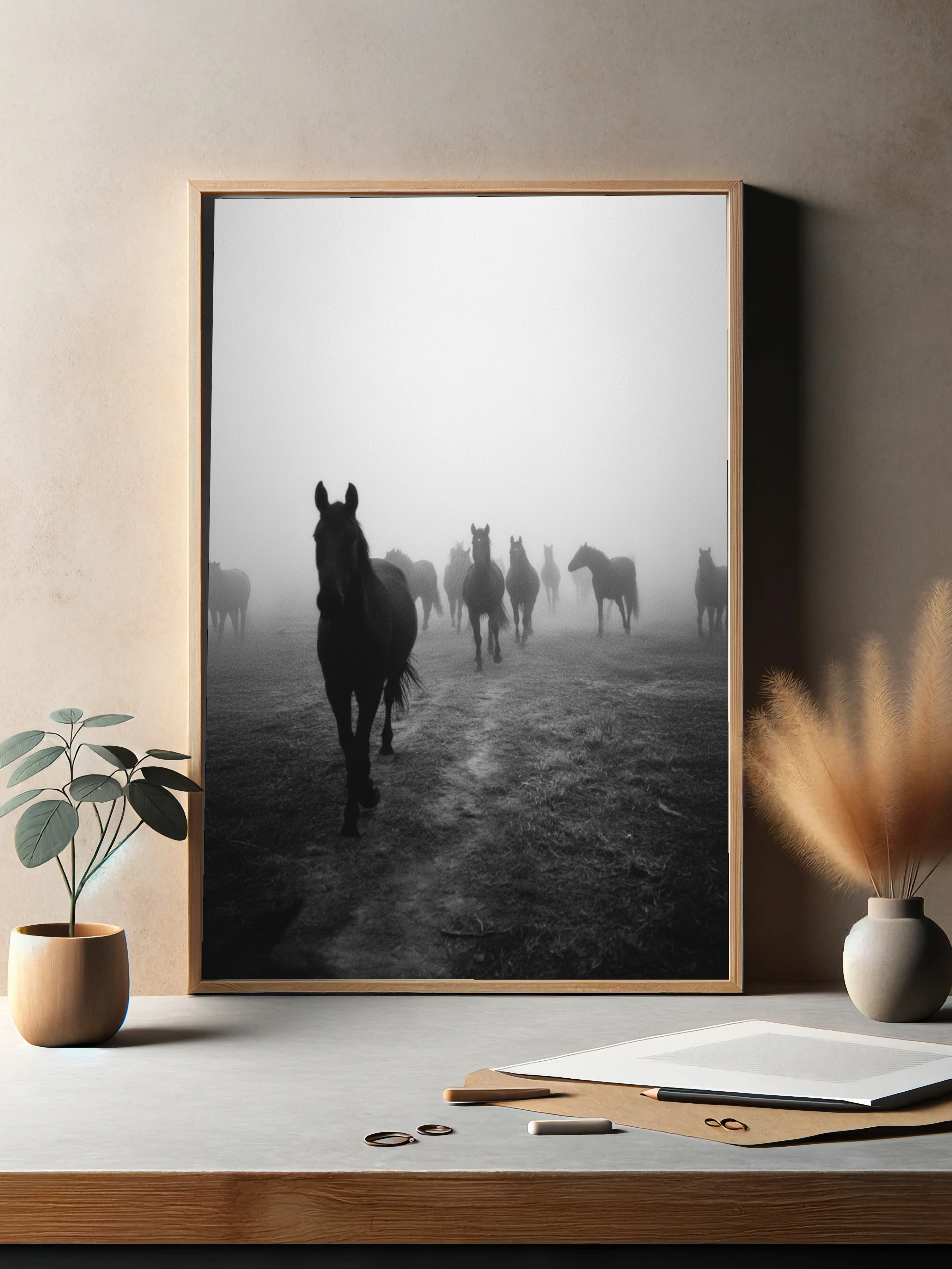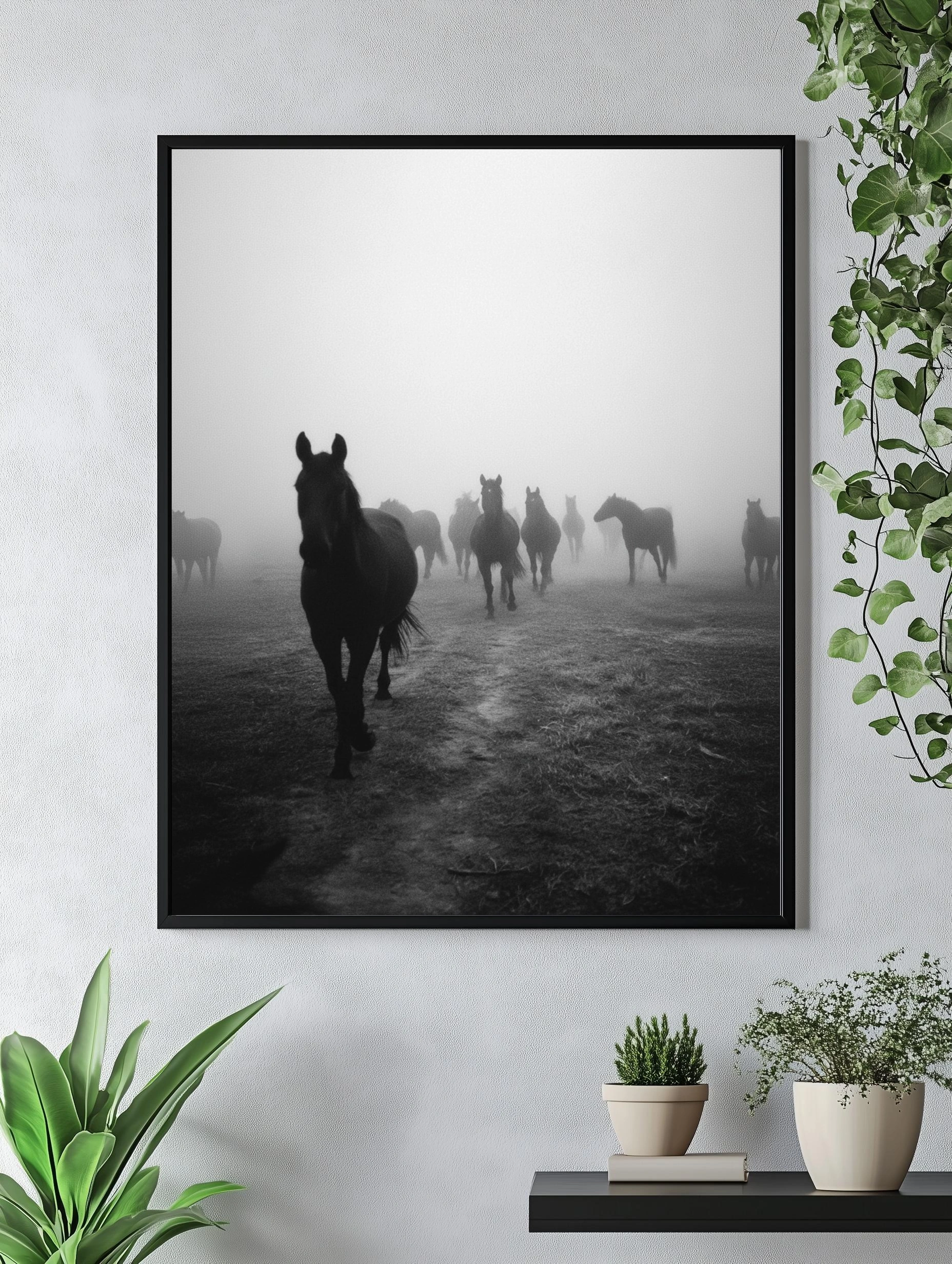 Погрузитесь в атмосферу загадки с этим потрясающим постером, изображающим группу черных лошадей, уверенно движущихся сквозь густой туман. На переднем плане одна из лошадей смотрит прямо на зрителя, создавая ощущение близости и взаимодействия. Вдалеке силуэты других лошадей растворяются в сером тумане, добавляя глубину и мистику композиции. Цветовая гамма выполнена в черно-белых тонах, что подчеркивает элегантность и силу этих благородных животных. Этот постер идеально впишется в интерьер гостиной, спальни или офиса, добавляя нотку драмы и стиля. Он привлечет внимание молодежи и любителей природы, создавая уникальную атмосферу.