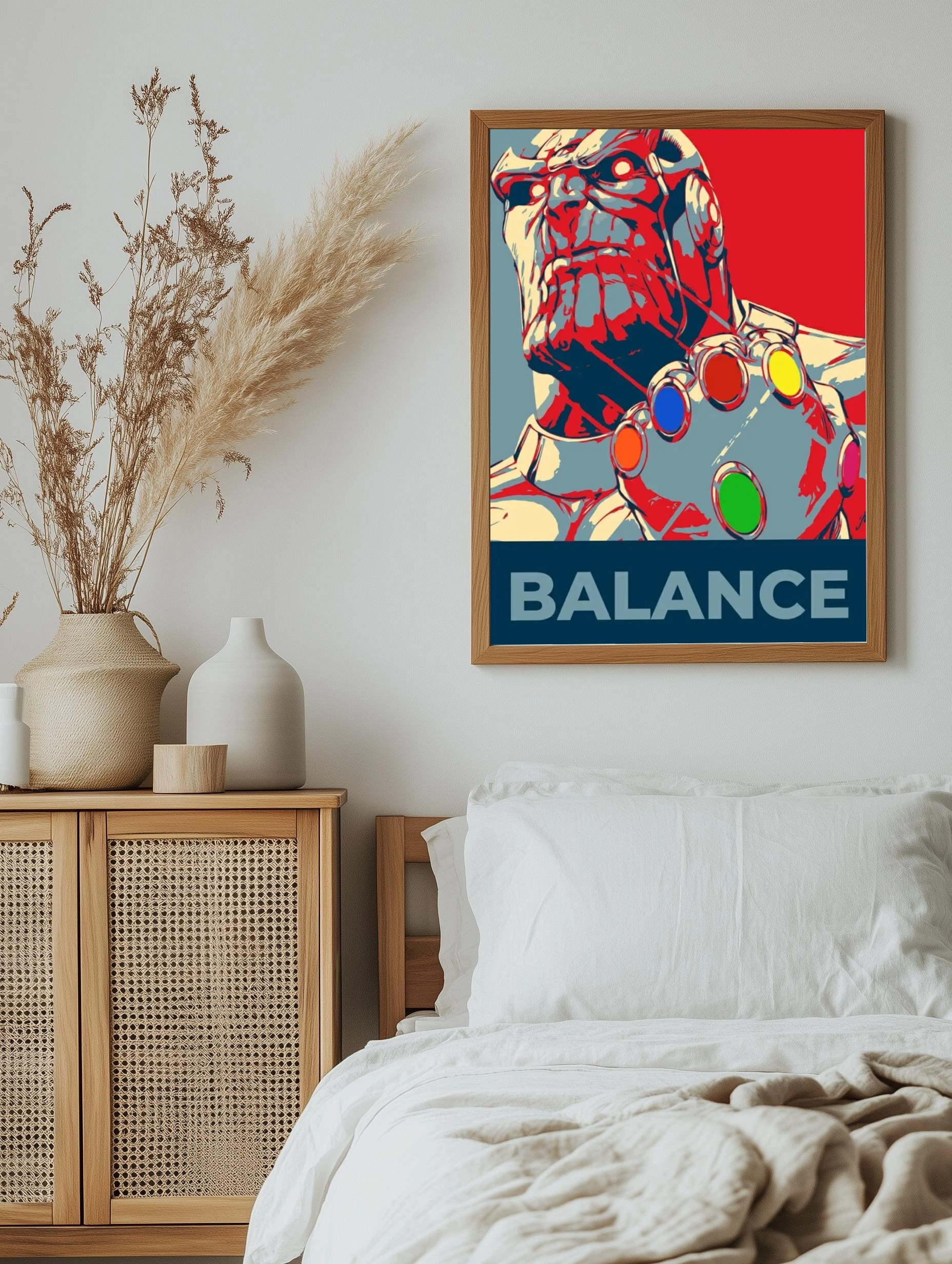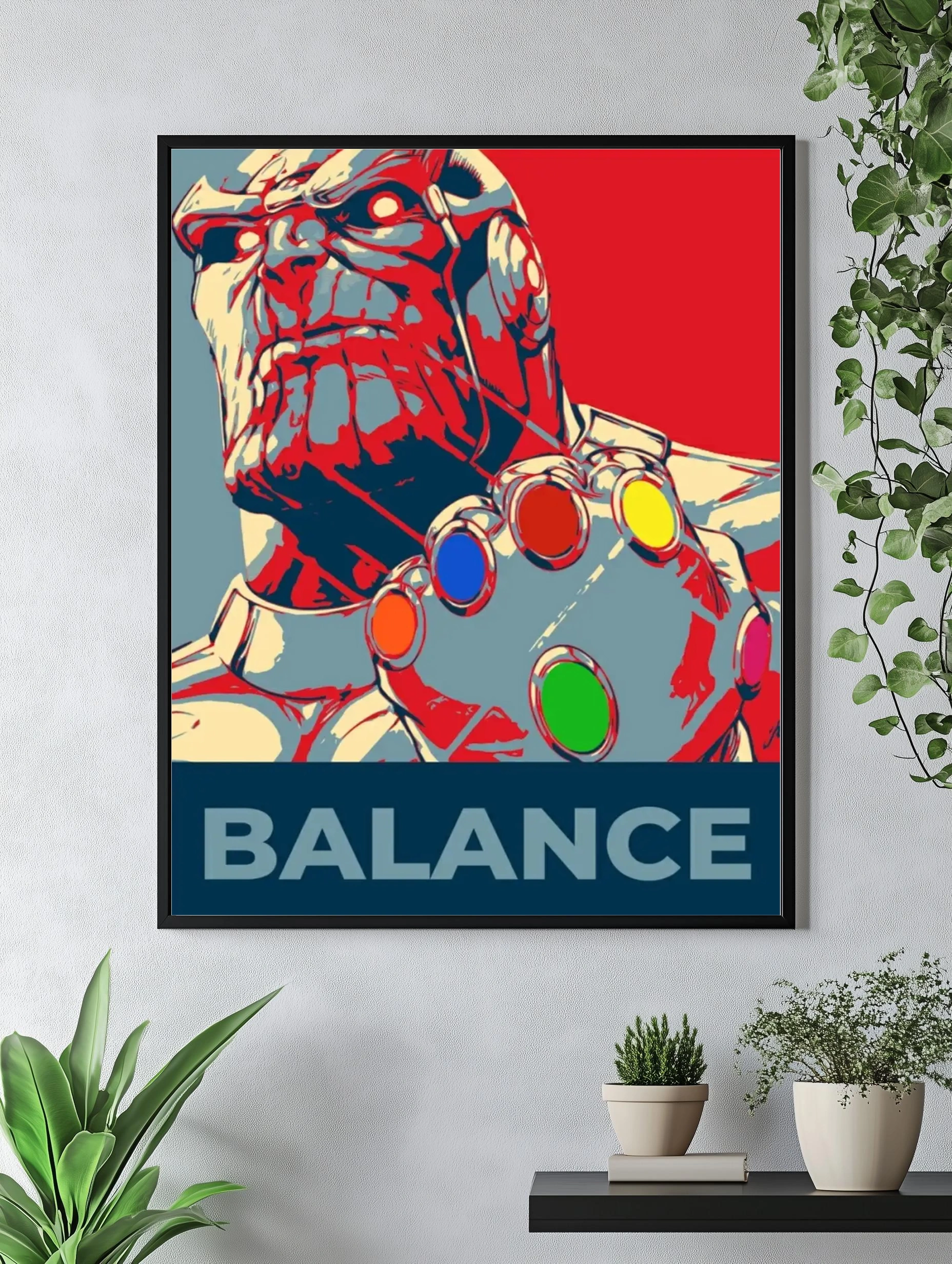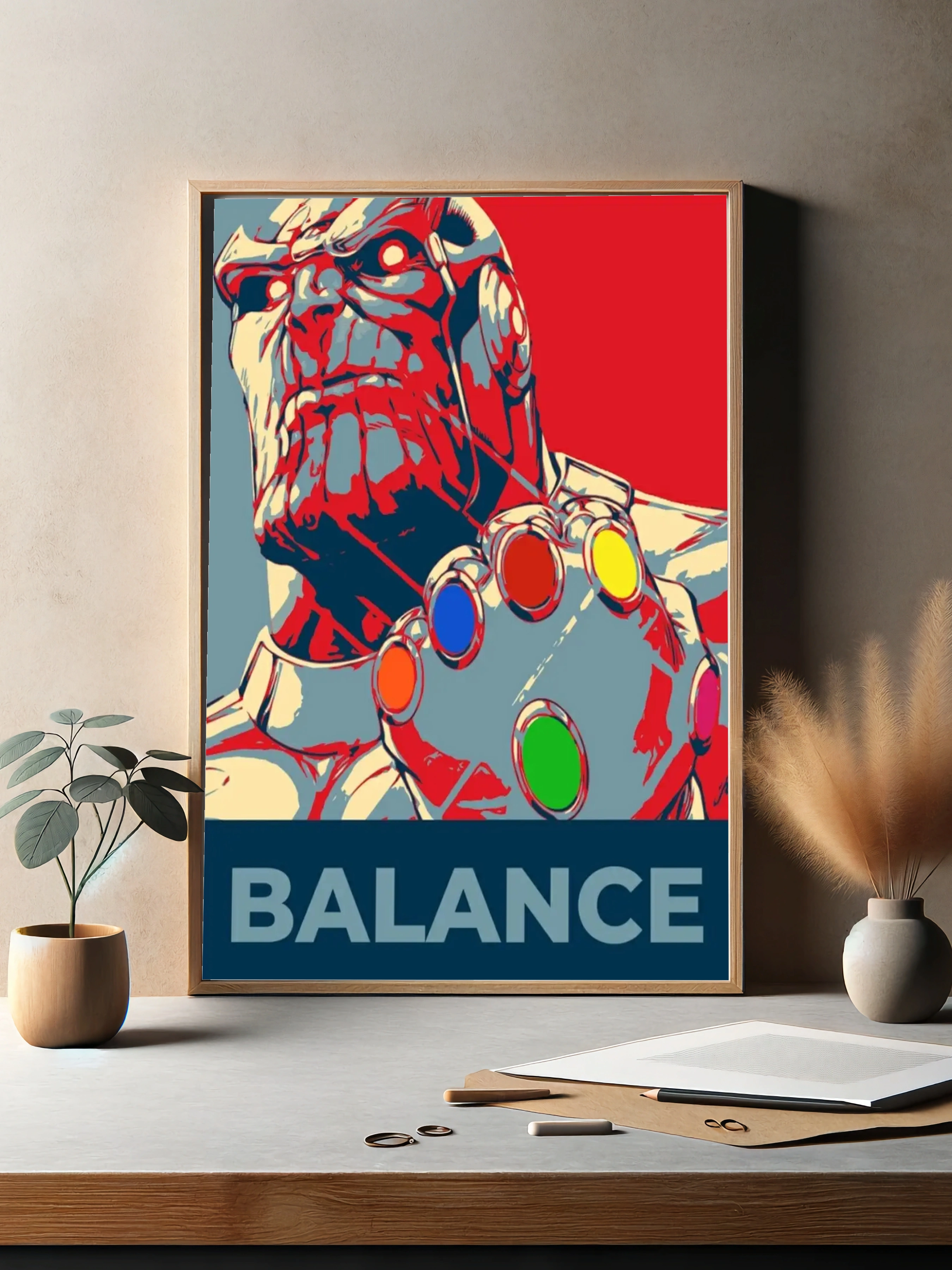 Яркое изображение Таноса — известного персонажа вселенной Marvel — в стиле поп-арт с использованием насыщенных красных, синих и бежевых оттенков. Этот интерьерный арт по мотивам комиксов подчеркивает мощь героя с камнями бесконечности на перчатке. Уникальная картина для гостиной или офиса для поклонников современного искусства и комиксов.