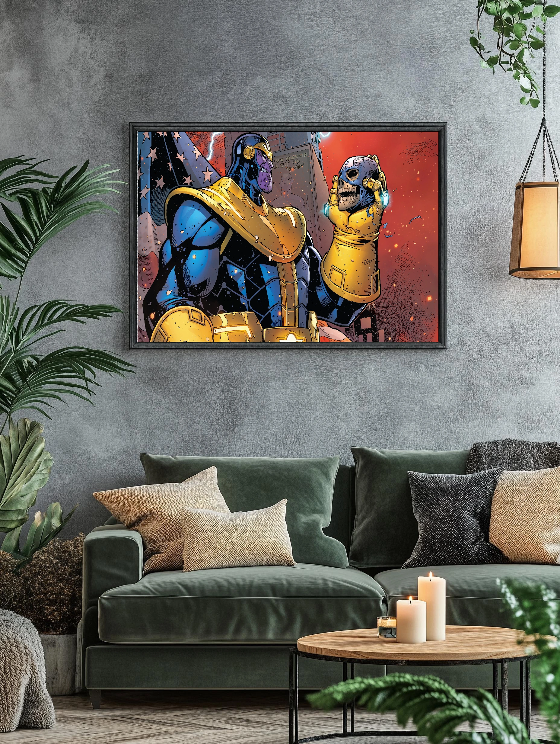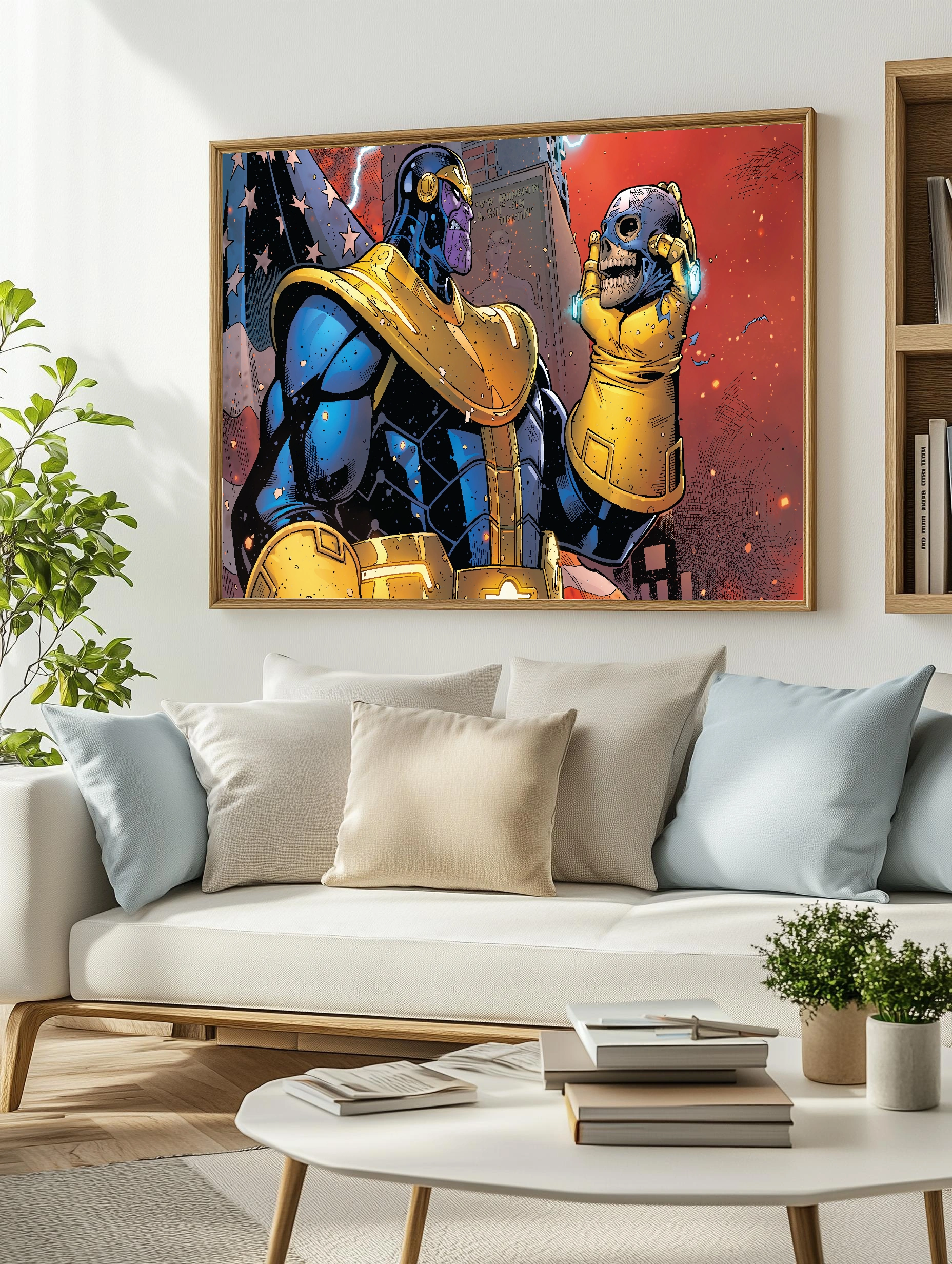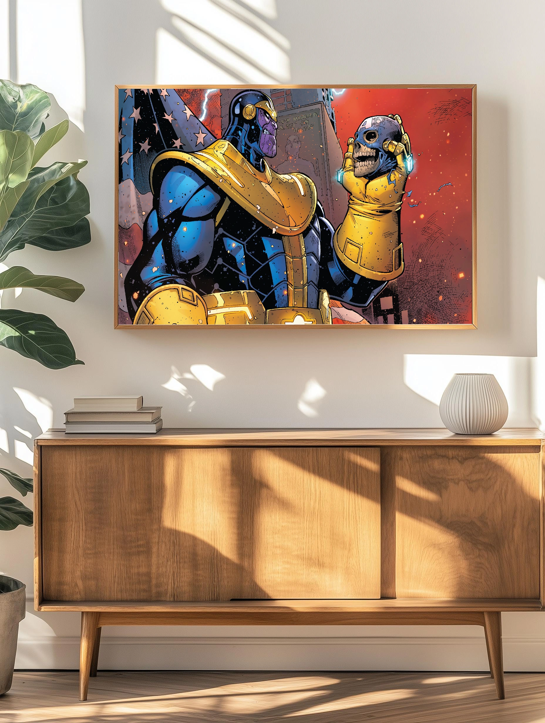 Яркое изображение Таноca, персонажа из вселенной Marvel, в комиксовом стиле. Он одет в синее и золотое боевое облачение и держит в руке перчатку с черепом. Фон выполнен в тёмных тонах с элементами американского флага, создаёт напряжённое и эпическое настроение. Идеально для любителей комиксов и современного искусства для стен.