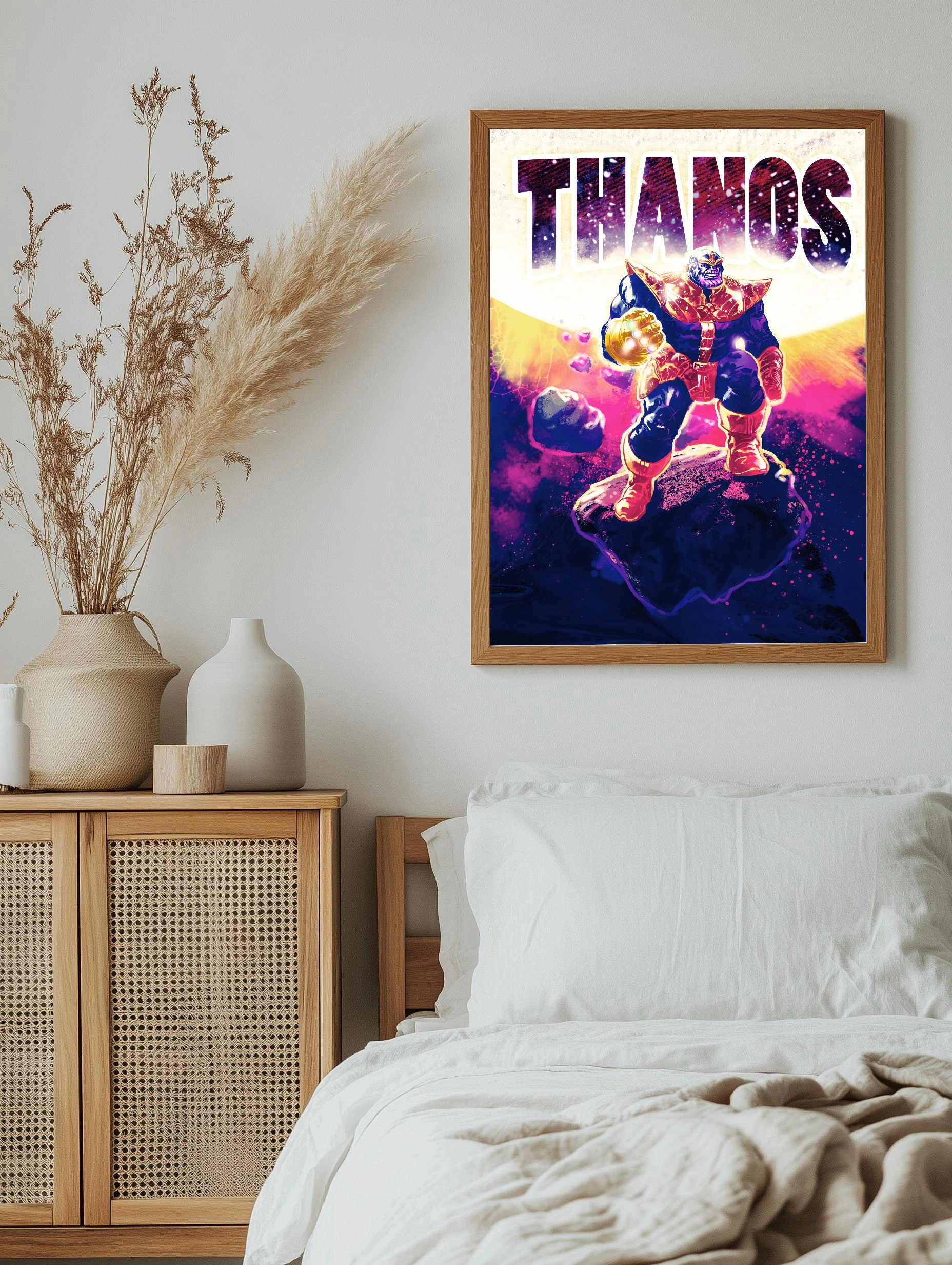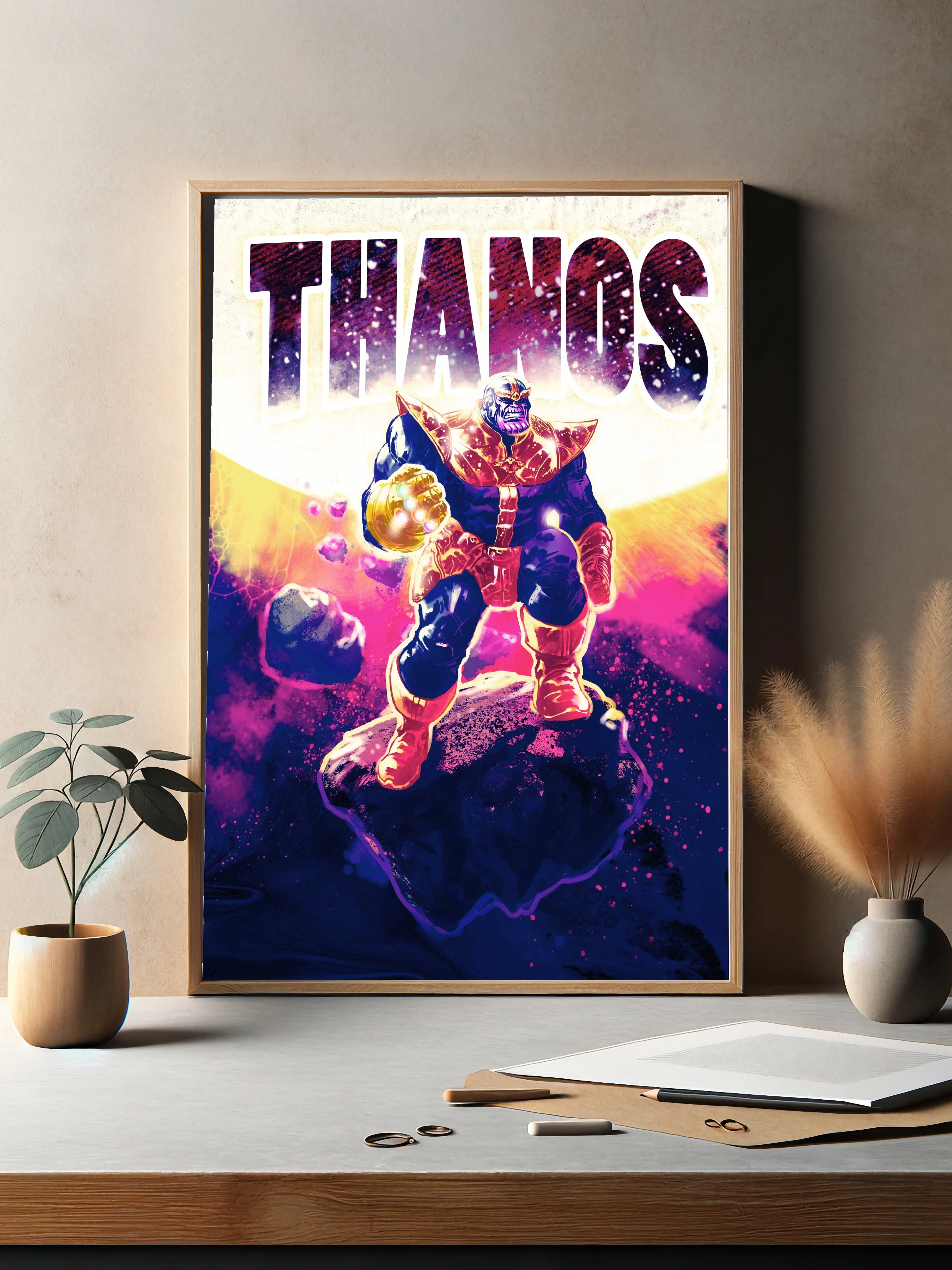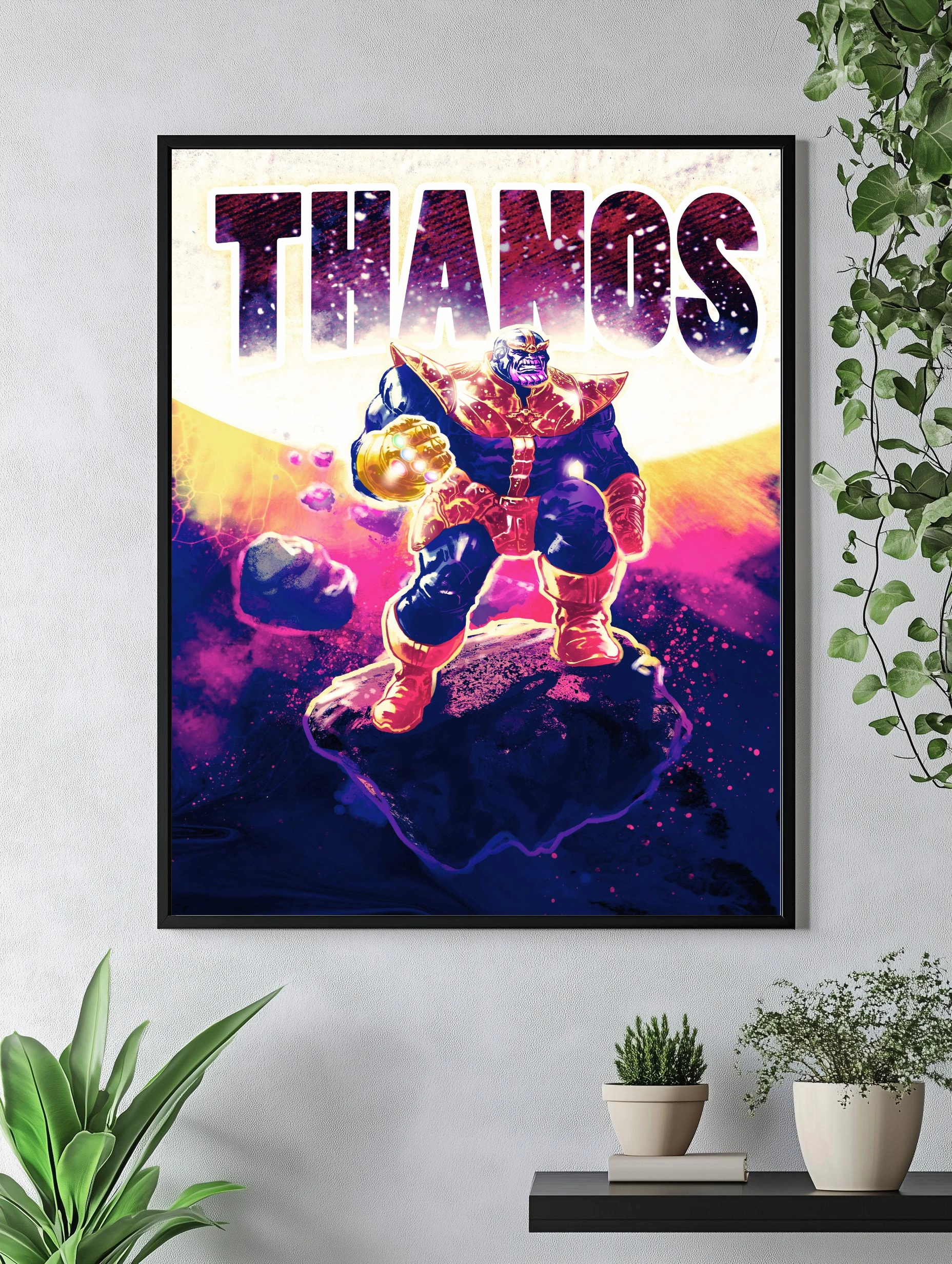 На постере изображён Танос — ключевой персонаж вселенной Marvel, стоящий на астероиде в космосе. Его мощь подчёркнута сияющей перчаткой бесконечности. Картина выполнена в насыщенных тёмно-синих, золотых и пурпурных тонах, создающих атмосферу могущества и величия. Этот интерьерный арт для стен идеально подойдёт для фанатов современного искусства и комиксов.