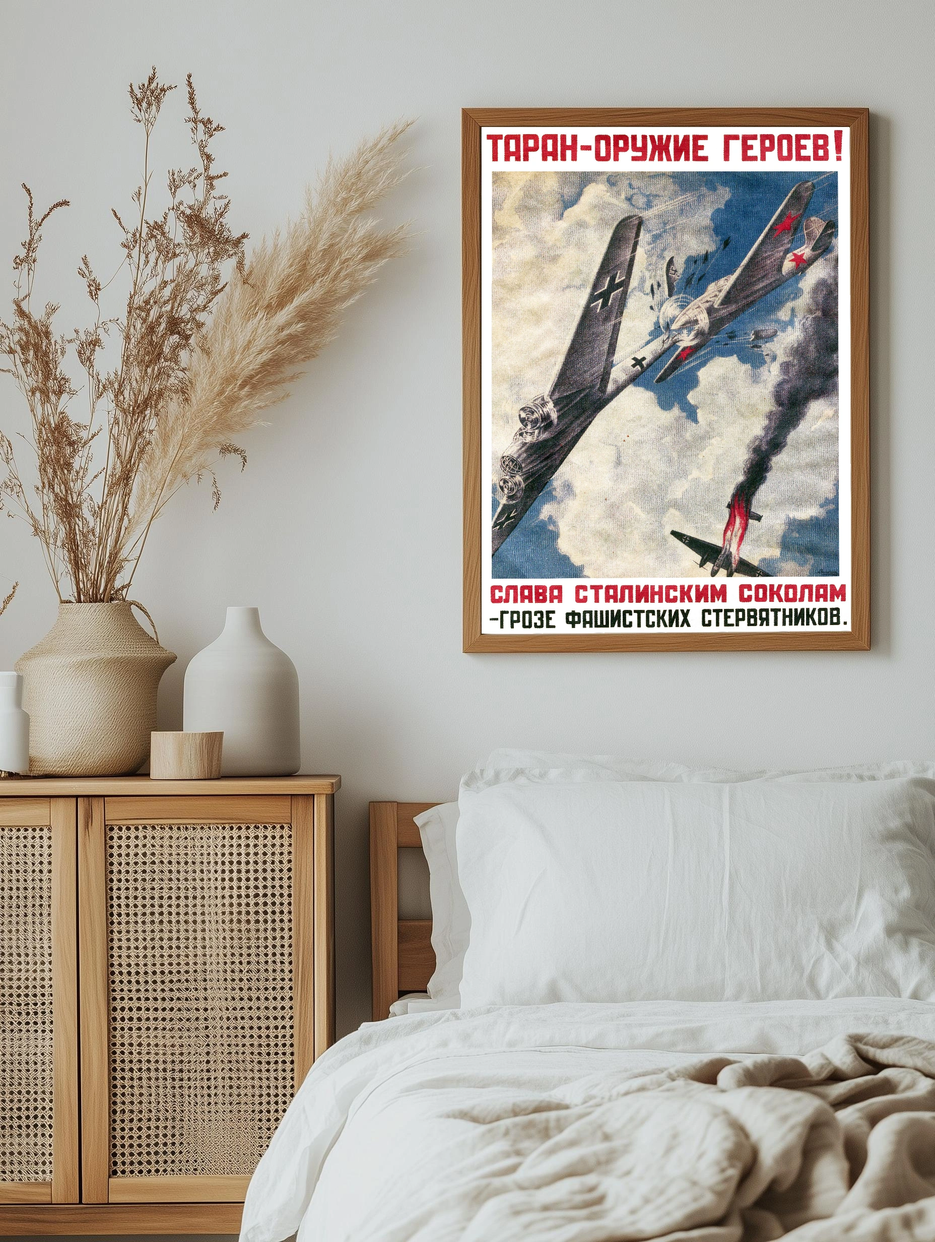 Советский агитационный плакат времен Великой Отечественной войны, воспевающий тактику тарана в воздушном бою. На изображении — два советских самолёта с красными звёздами и один немецкий самолёт с крестом, один из которых горит и падает. Мрачное небо, динамика боя и мужественный настрой делают этот интерьерный постер выразительным элементом оформления. Художественный плакат отражает патриотизм и героизм советских летчиков.