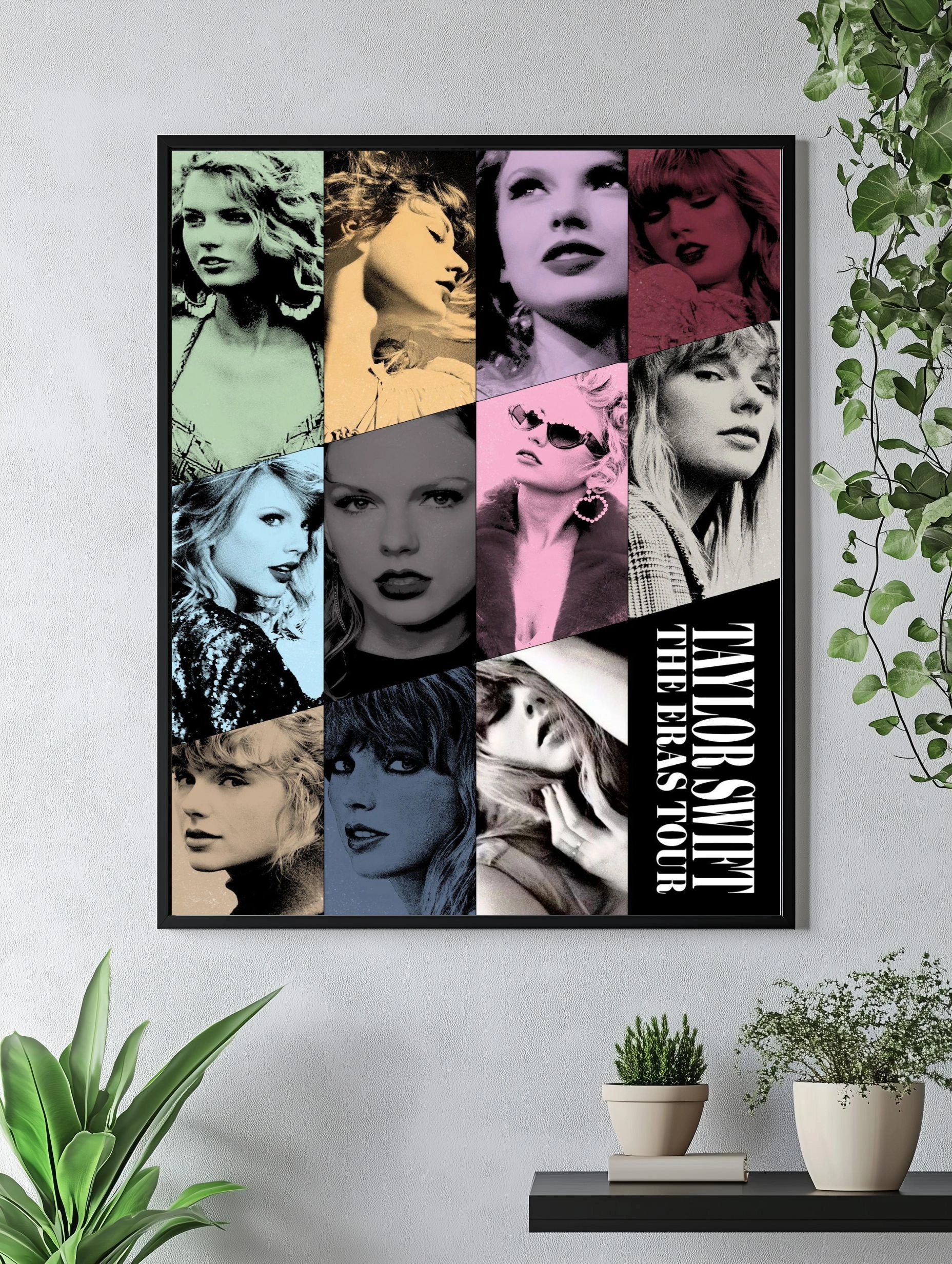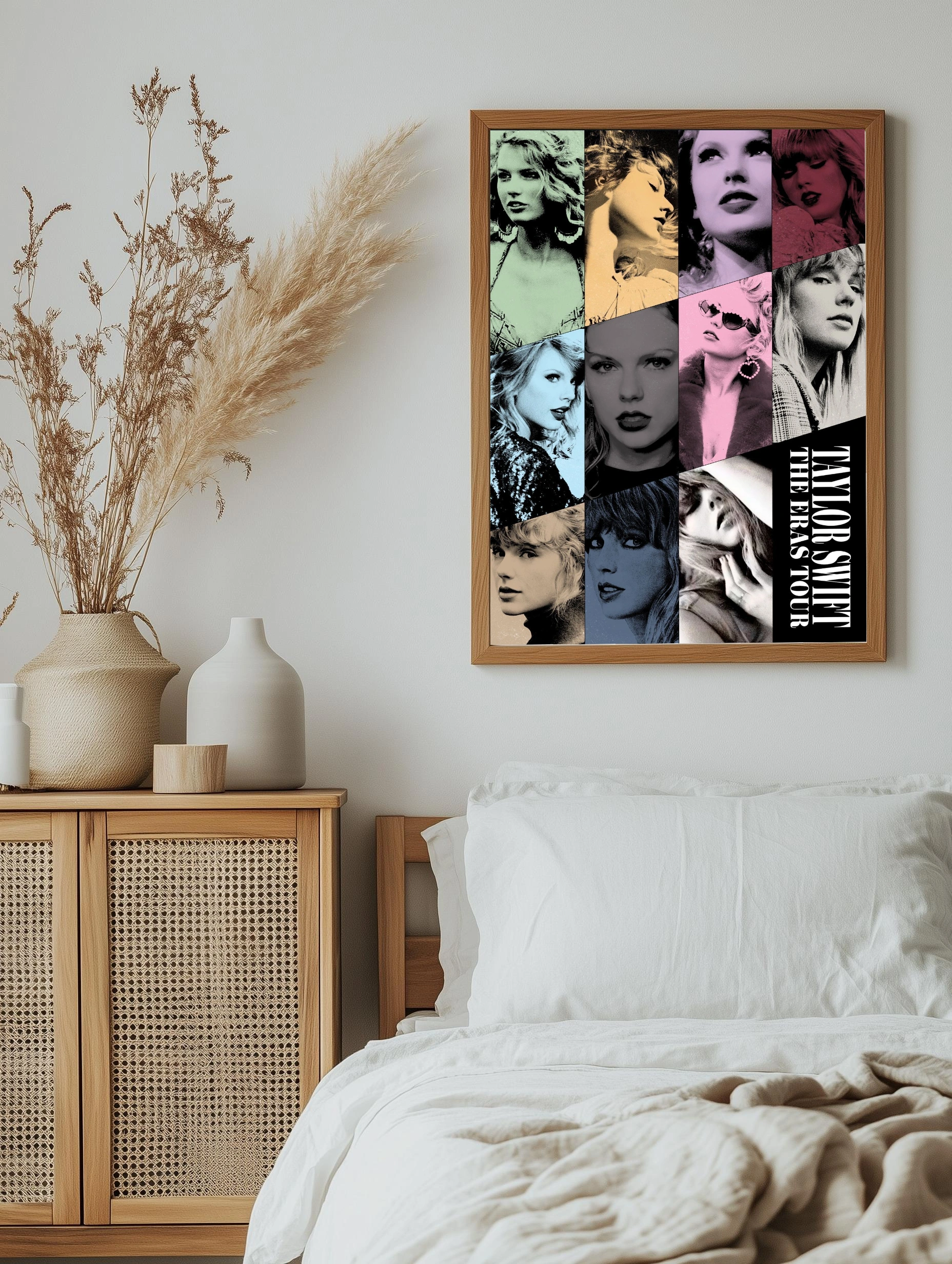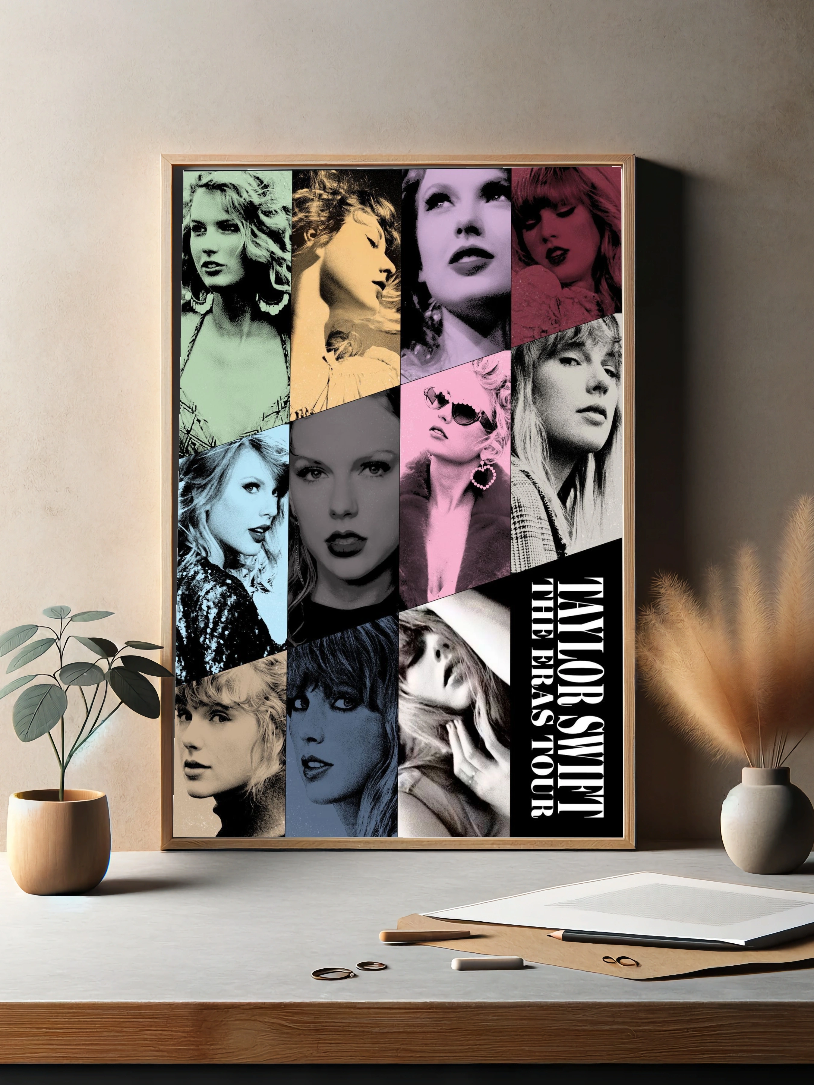 Декоративный плакат с коллажем знаменитых образов певицы Taylor Swift из различных периодов ее творчества и турне Era. Современное искусство для стен с контрастной цветовой палитрой подчеркивает эволюцию стиля. Идеальный интерьерный декор для гостиной или спальни, уникальные картины для дома.
