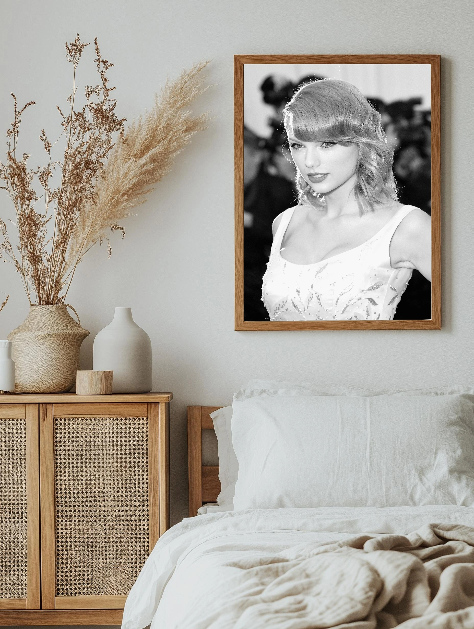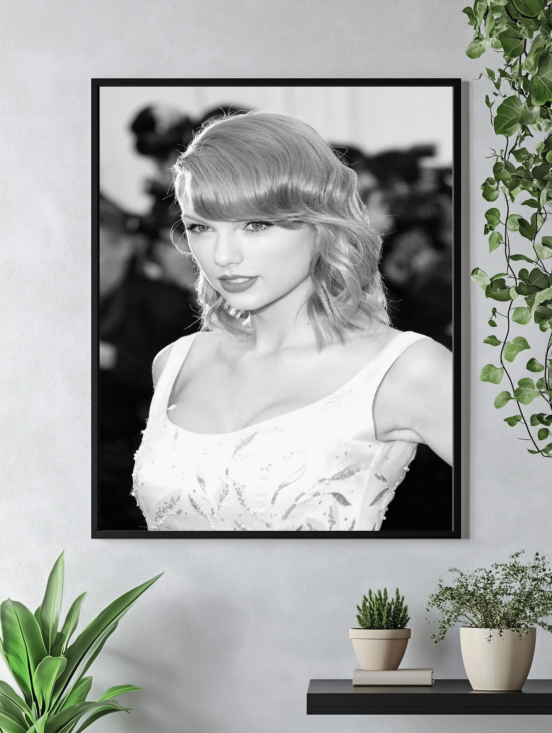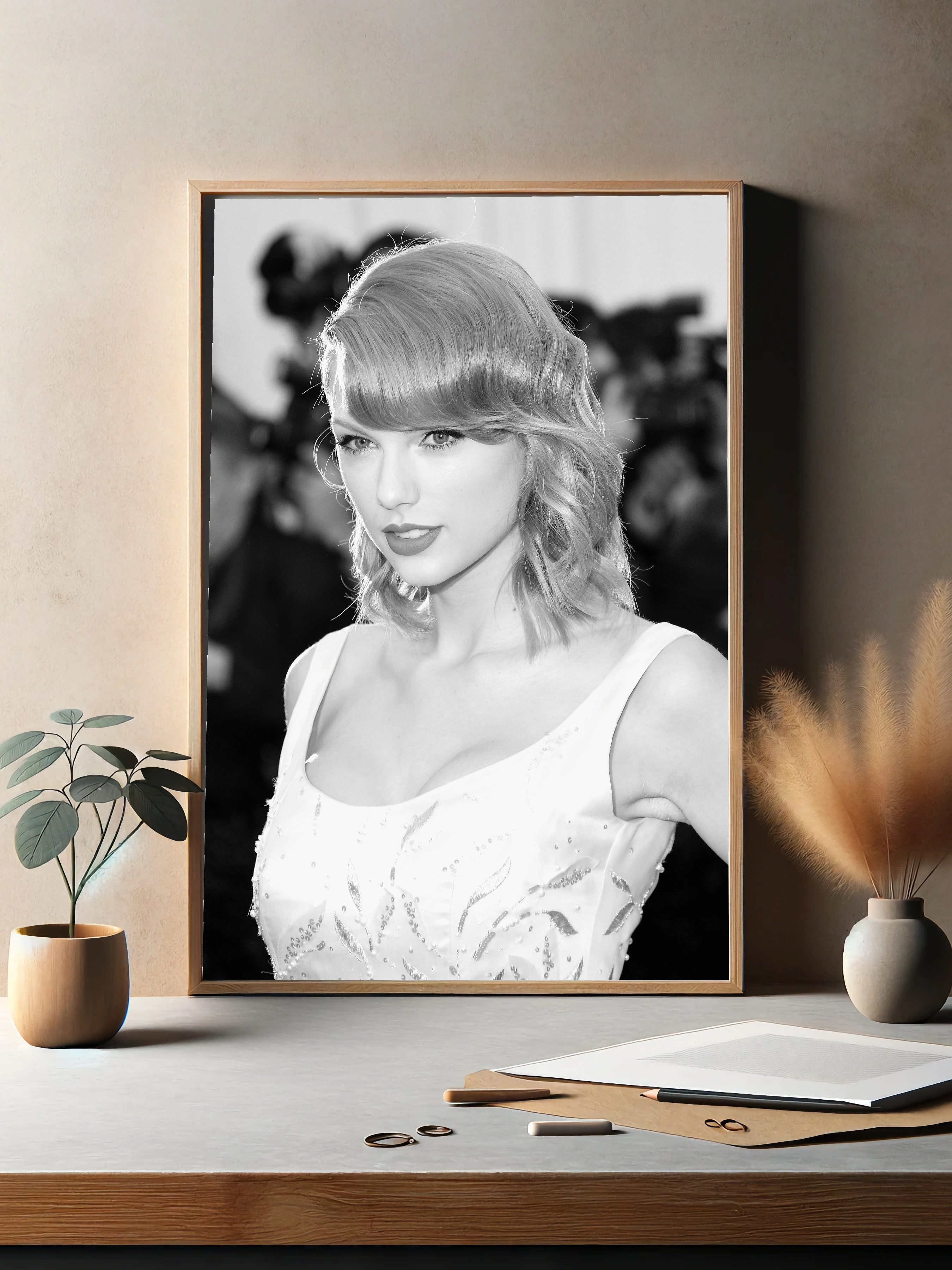 На изображении запечатлена знаменитая певица и актриса Тейлор Свифт в элегантном образе. Черно-белое фото акцентирует внимание на ее выразительной мимике, светлых волнистых волосах и изящном платье с декоративными элементами. Этот интерьерный арт-фотопортрет подойдет для стильного декора стен в различных помещениях.