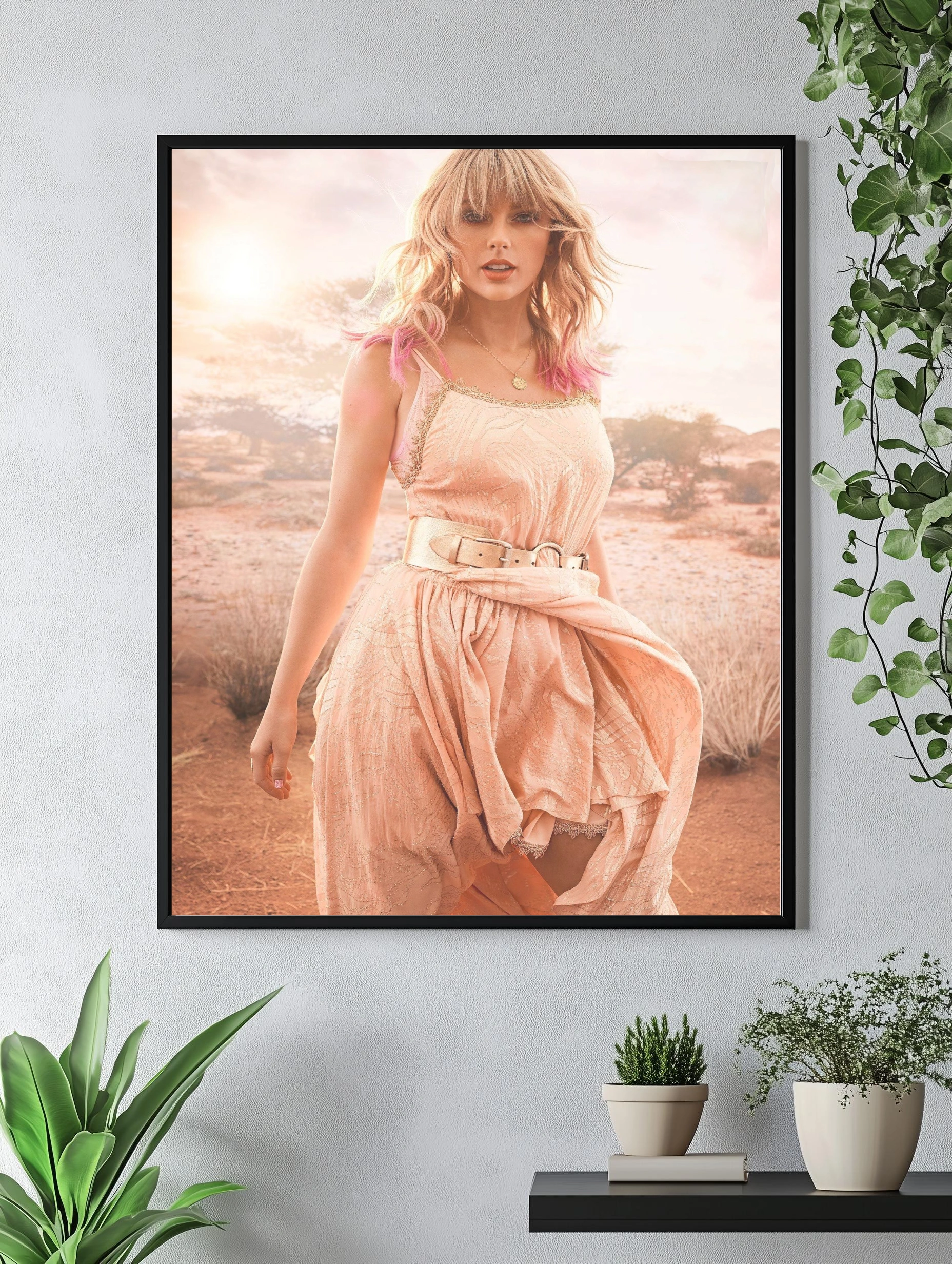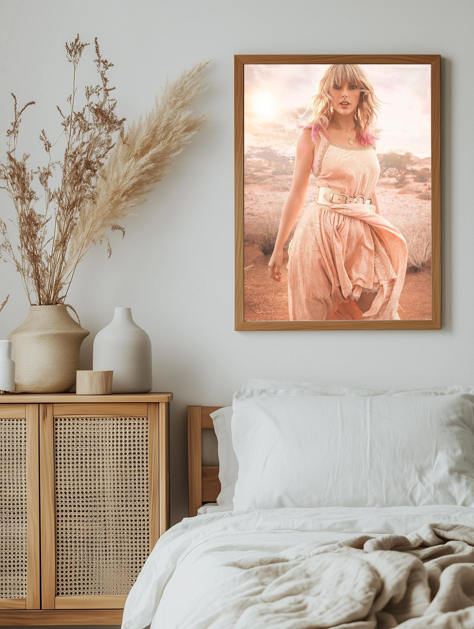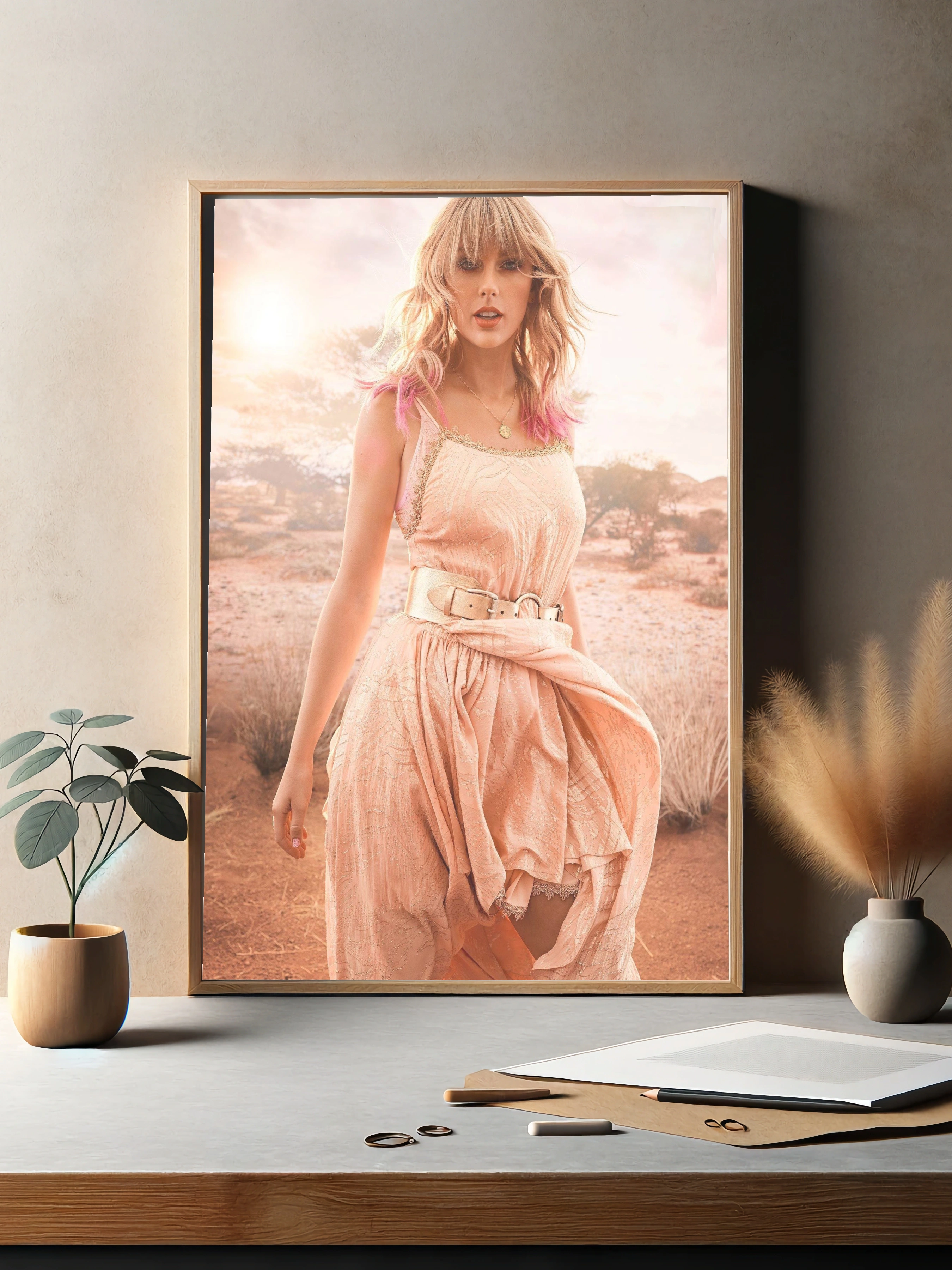 На изображении изображена певица Тейлор Свифт в элегантном светло-розовом платье, которое подчёркивает её изящность и женственность. Фон выполнен в стиле пустыни с мягкими коричневыми и персиковыми оттенками, создавая тёплое, романтичное настроение. Этот интерьерный арт подходит для украшения гостиной, спальни или офиса, добавляя нотки современного искусства и стильного декора стен.